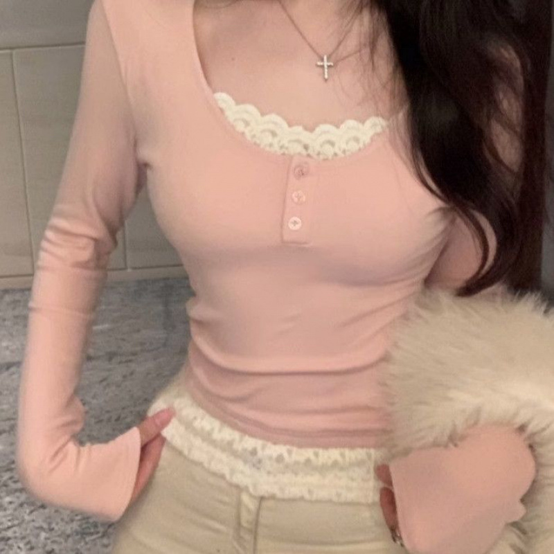 Кружевная рубашка из двух частей с длинными рукавами для женщин, весенне-осенняя новинка для похудения, модный короткий топ для горячих девушек
