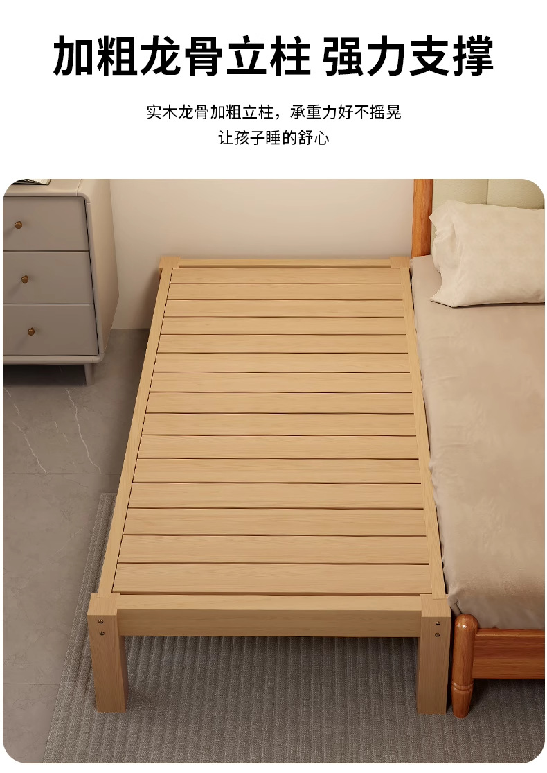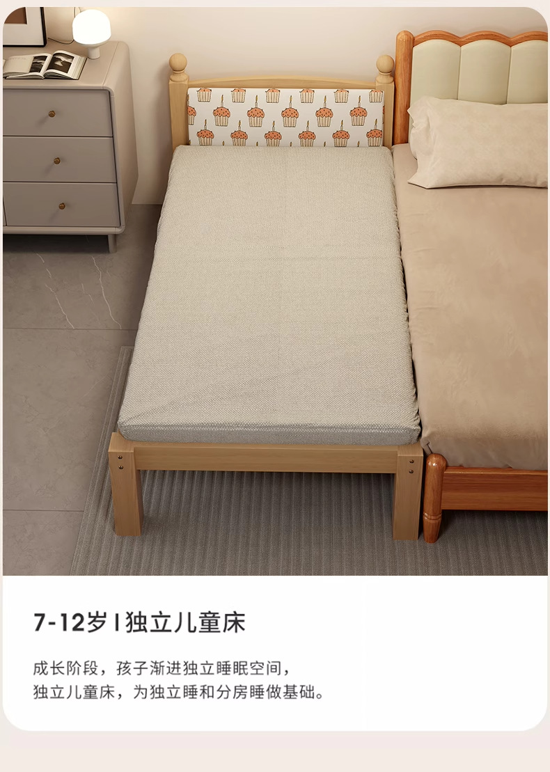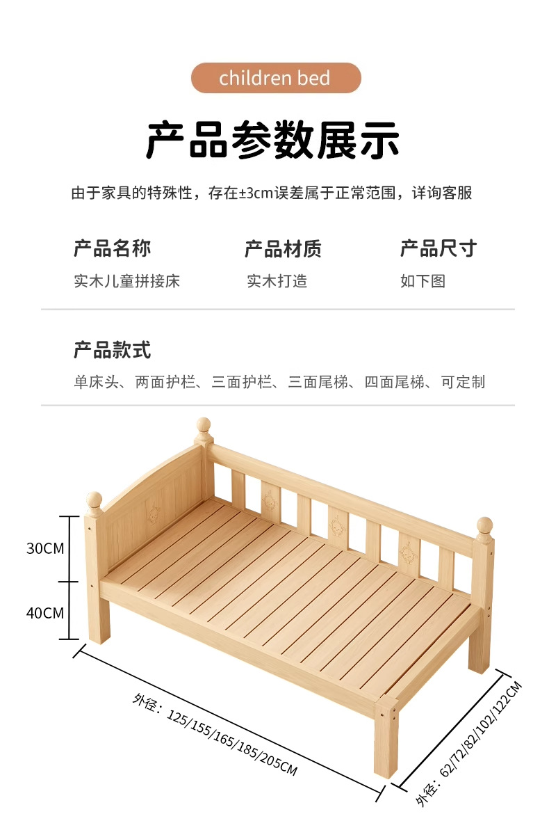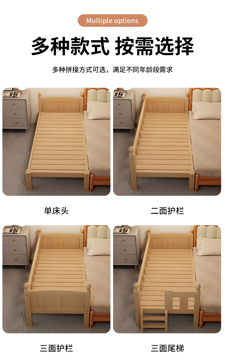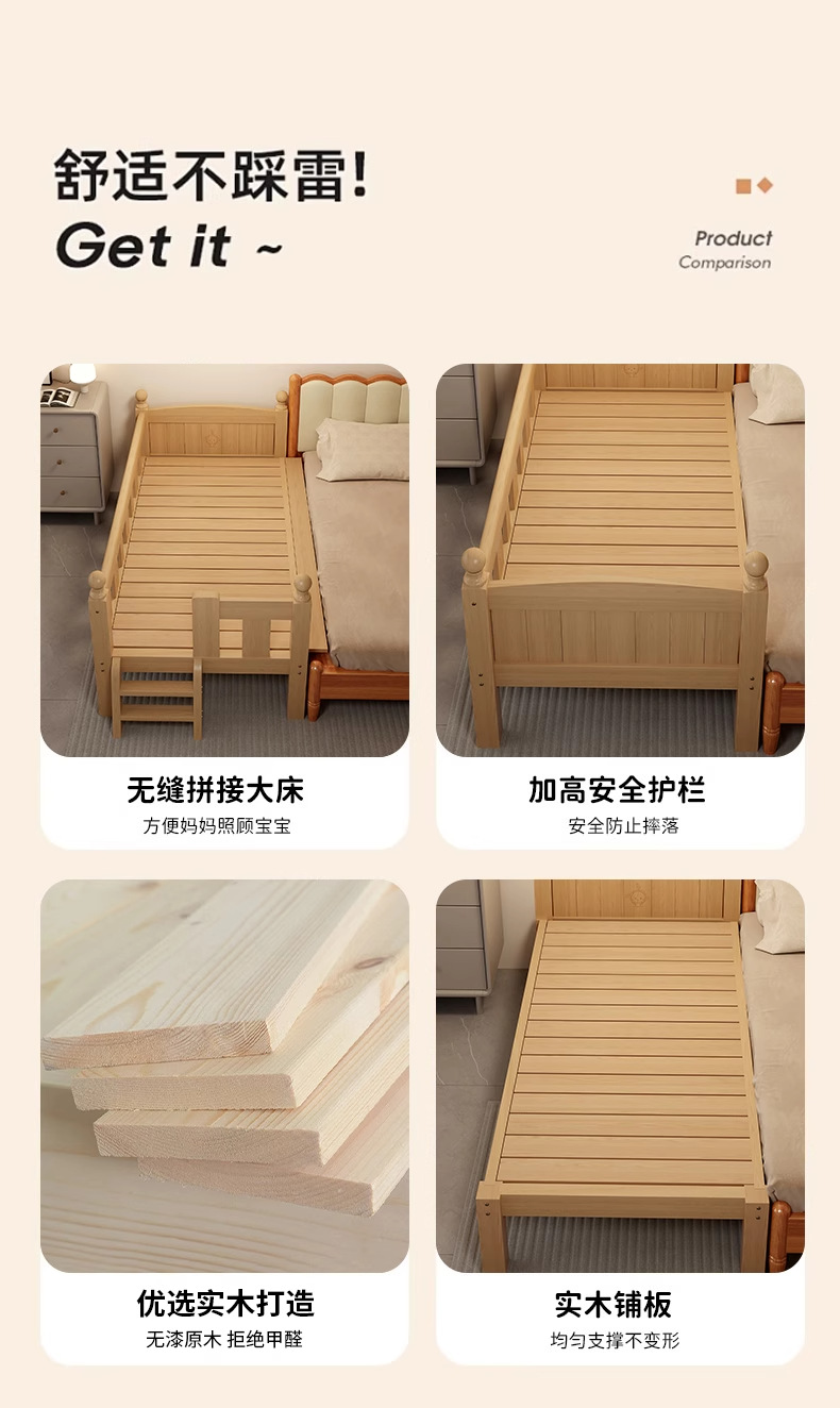 Детская кровать с ограждением, неокрашенная, кровать из цельного дерева, детская кроватка, бесшовное плоское соединение с большой кроватью, кровать с расширенным расширенным краем.