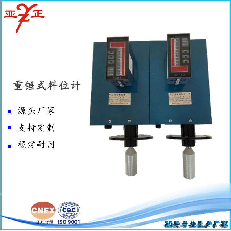 青岛亚正机电制造有限公司成立于2003年,由原青岛市第二仪器仪表厂改制分立而成,主要从事物位、液位仪表的研发、生产与销售。公司研发生产的“青亚”牌阻旋式物位计、射频电容式物位计、音叉式料位计、雷达式料位计、重锤式料位计、超声波式料位计等产品,已广泛应用于全国铸造、塑料、水泥、环保、饲料、化工、等行业. ULZC 型 重 锤 料 位 计 可 用 来 测 量 粉 状 、颗 粒 状 及 块 状 固 体 物 料 料 仓 的 料 位 ,使 用 户 可 靠 地 掌握 料 仓 中 的 料 位 。料 位 计 由 传 感 器 及 控 制 显 示 仪 表 构 成 , 传 感 器 的 设 计 吸 收 了 国 内 外 同 类 产 品 的 优 点 , 其 独特 的 结 构 与 传 动 方 式 使 以 往 许 多 其 它 形 式 的 重 锤 料 位 计 经 常 出 现 的 毛 病 都 得 以 克 服 ,做 到 运 行可 靠 、 维 护 量 小 、 应 用 面 广 。
