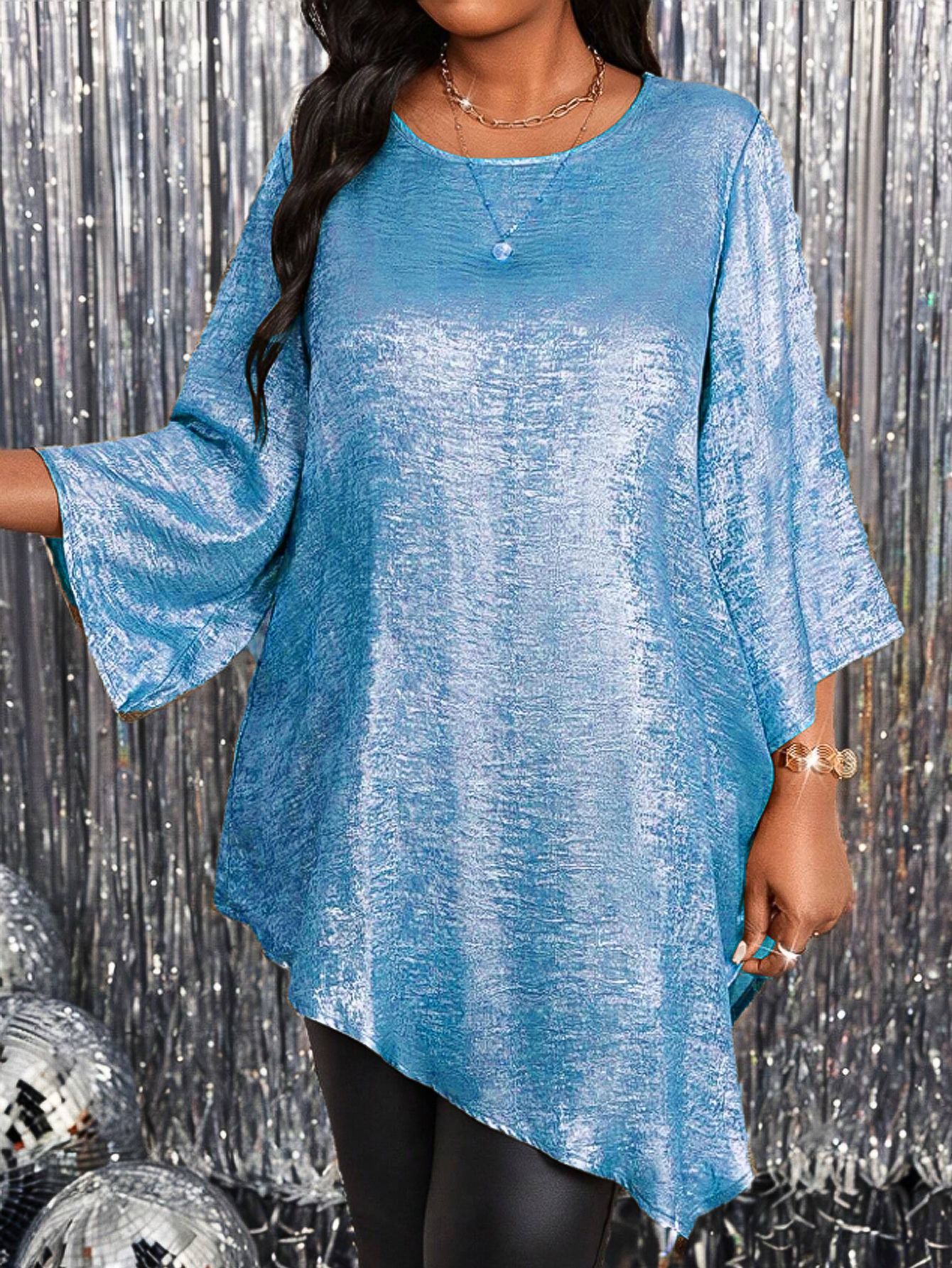 2025 новых европейских и американских топов для женщин больших размеров с круглым вырезом, девятью четвертями рукава и неровным подолом для трансграничной торговли на Amazon