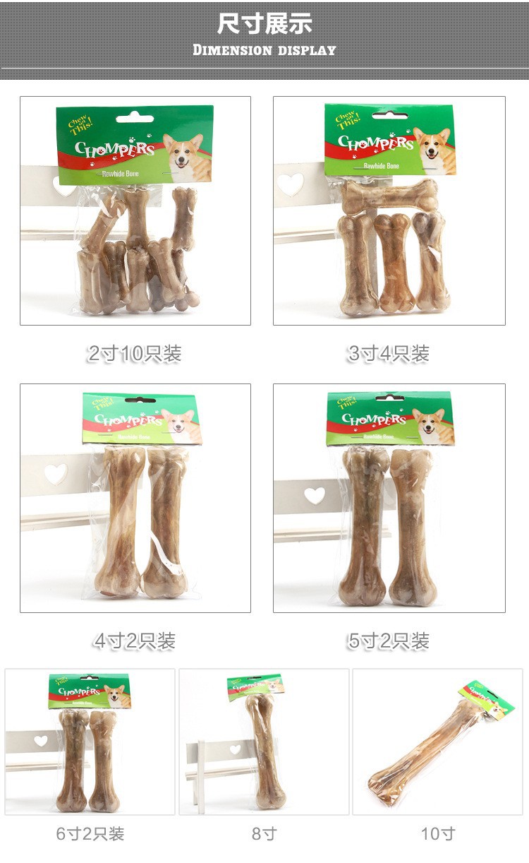 2-дюймовая упаковка из 10 штук (длина 5 см, собаки микроразмера); 3-дюймовая упаковка из 4 штук (длина 8 см, собаки микроразмера); 4-дюймовая упаковка из 2 штук (длина 10 см, маленькая собака); 5-дюймовый комплект из 2 штук (длина 13 см, собаки маленького и среднего размера); 6-дюймовый комплект из 2 штук (длина 15 см, средние и крупные собаки); 8-дюймовый 1-пакет (длина 20 см, средние и крупные собаки); 10-дюймовый 1-пакет (длина 20 см, средние и крупные собаки)