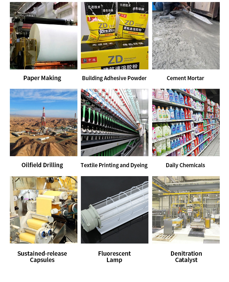 Изготовление бумаги, строительный клей, цементный раствор, печать и крашение текстиля, бытовые химические продукты, чернила и покрытия.