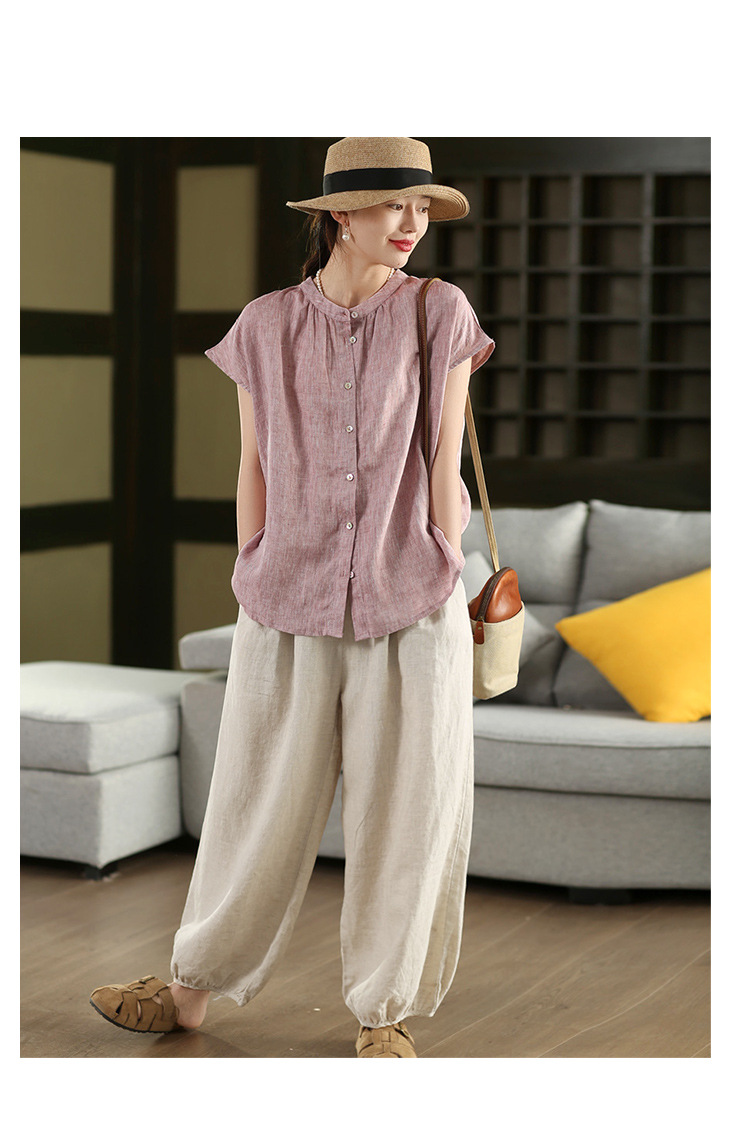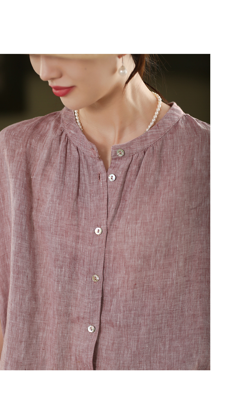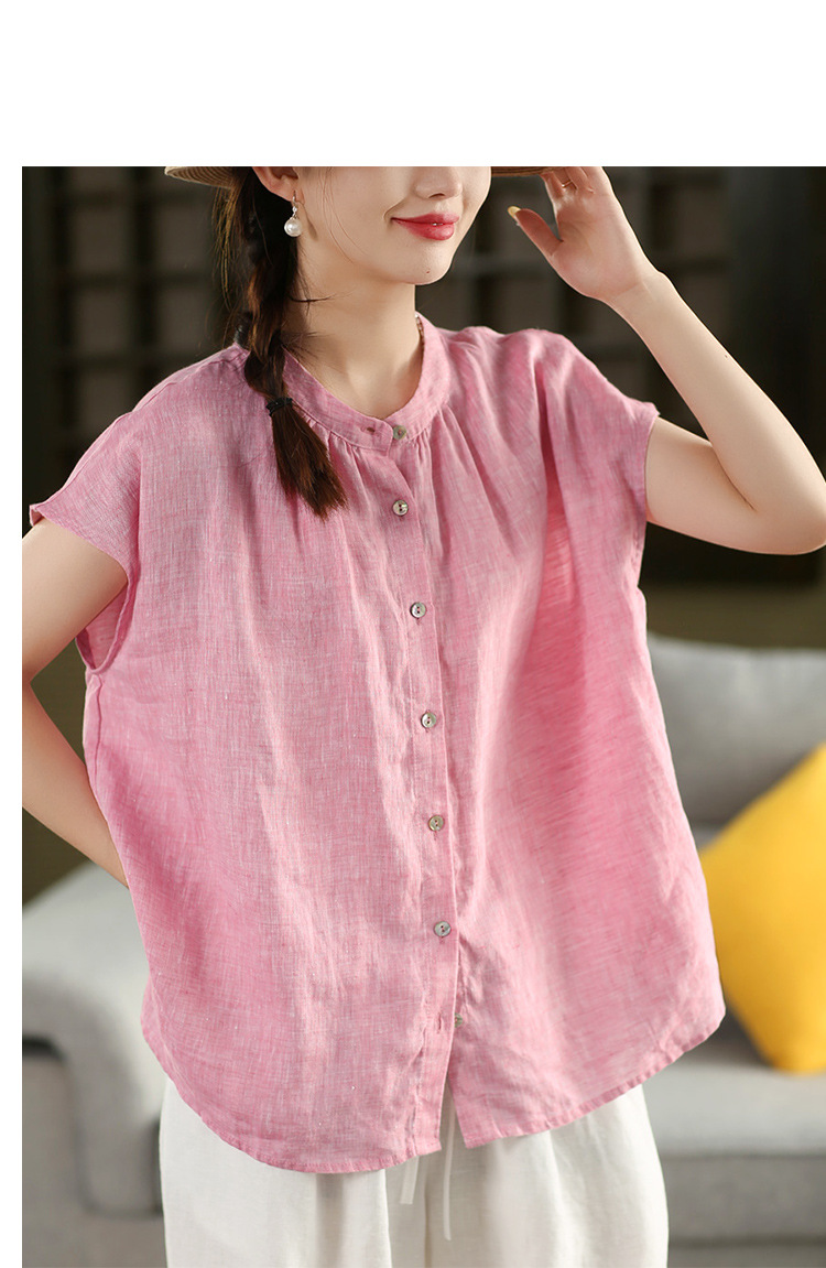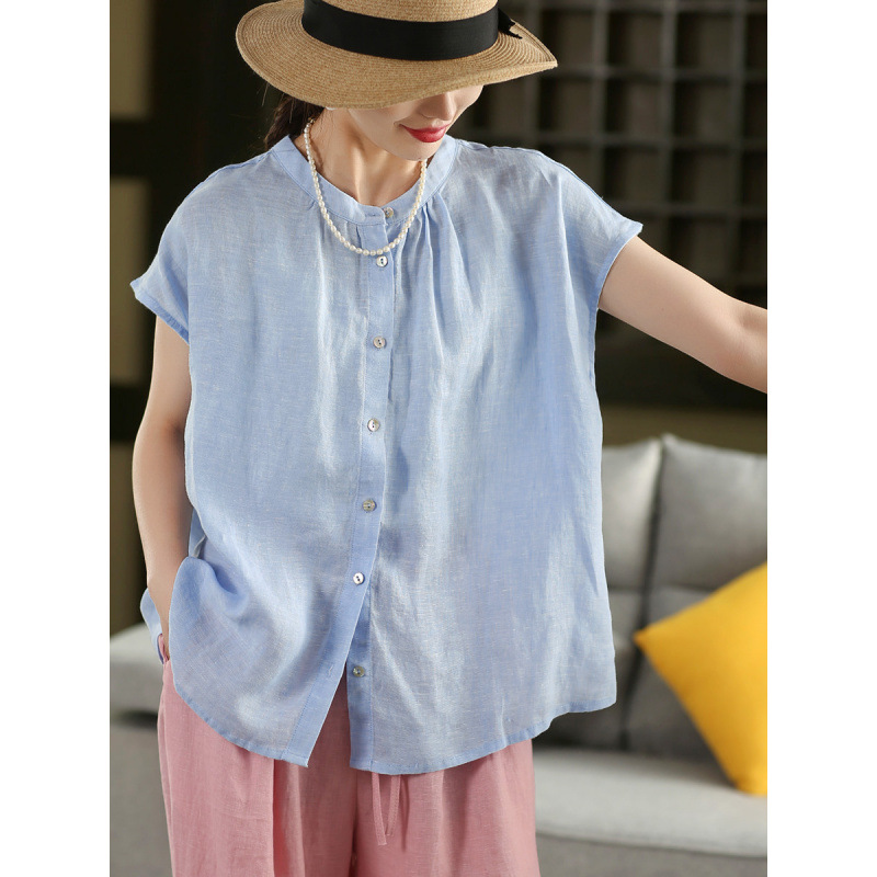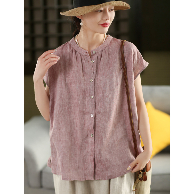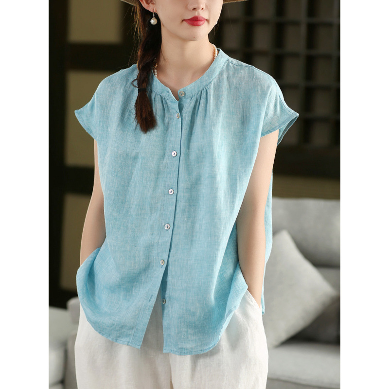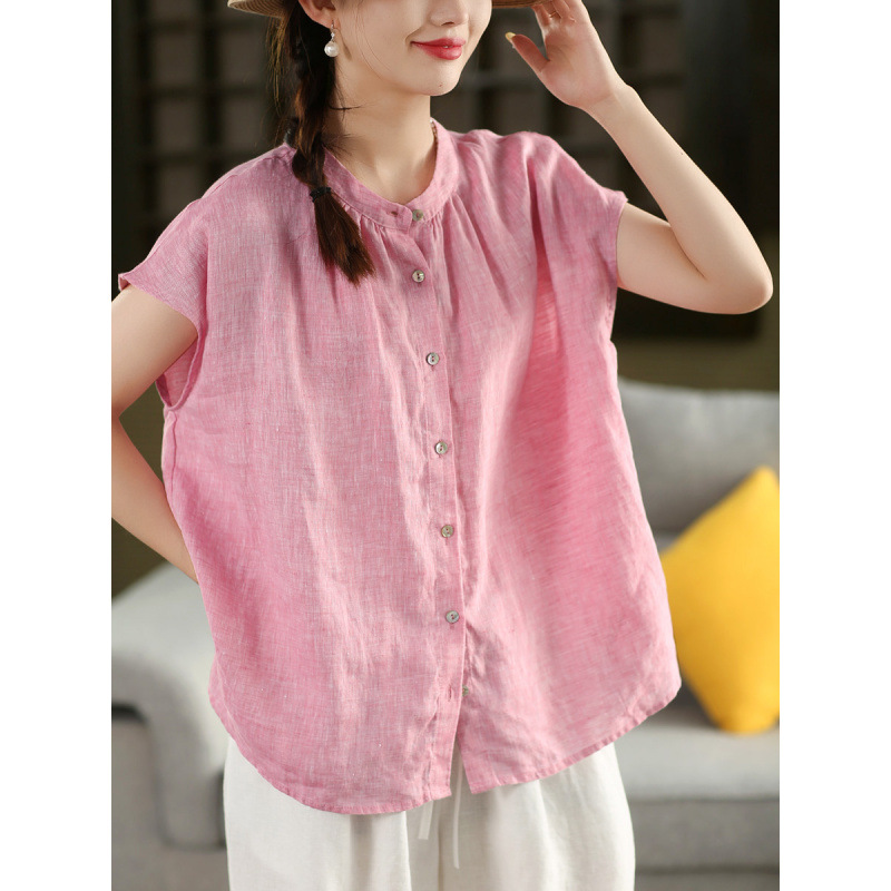 В наличии винтажная женская льняная рубашка из плотной ткани, элегантный однобортный топ с воротником-стойкой и короткими рукавами.