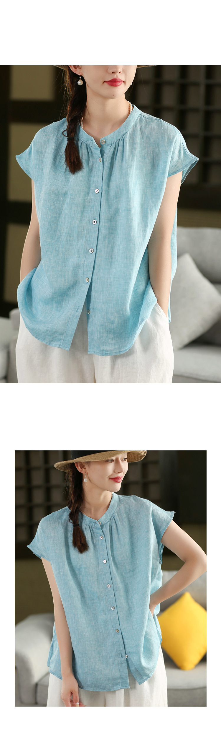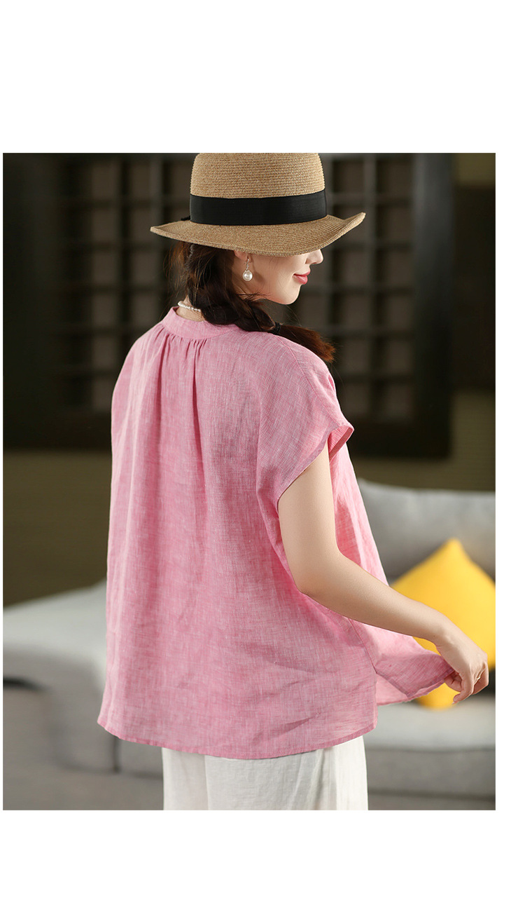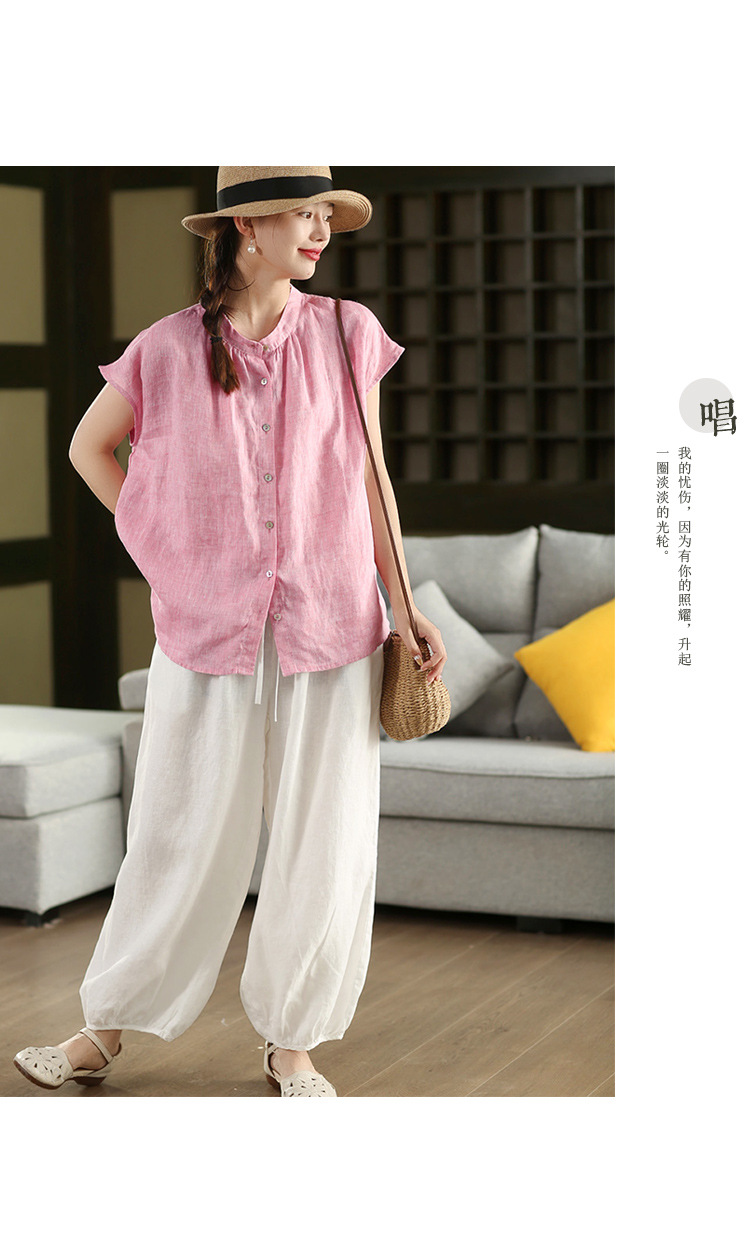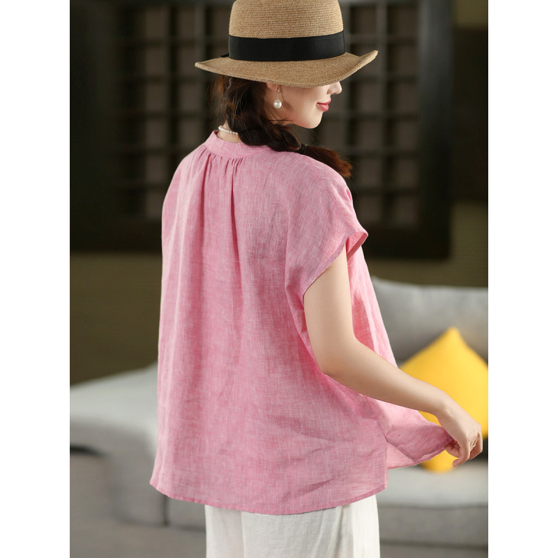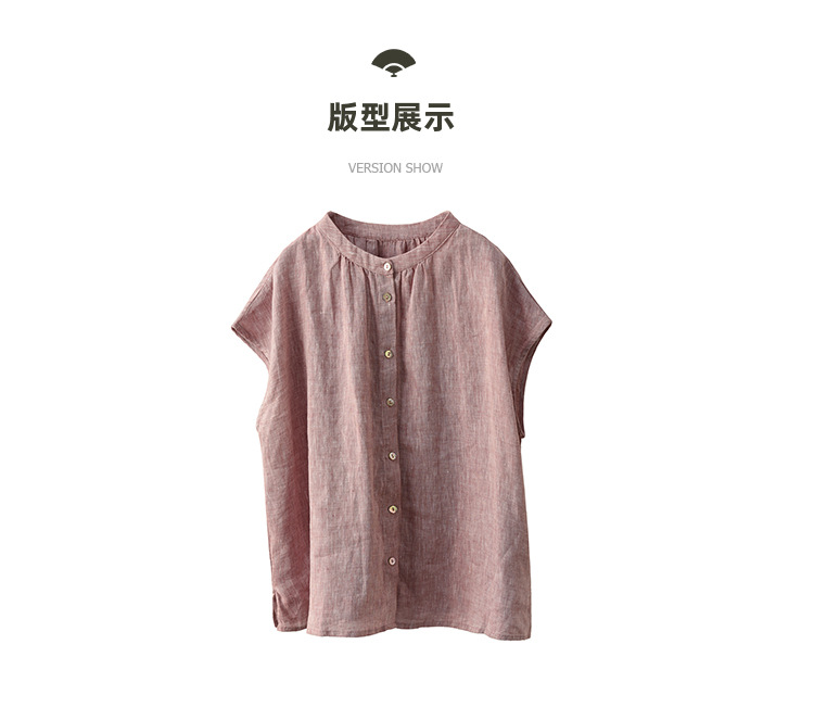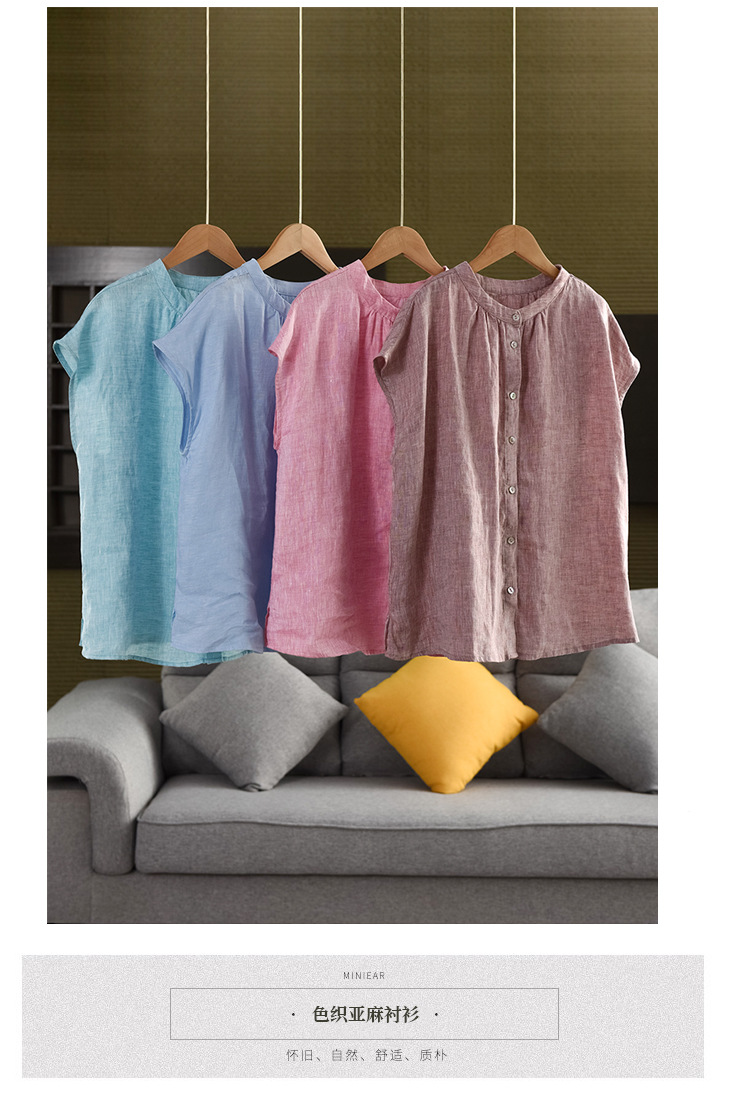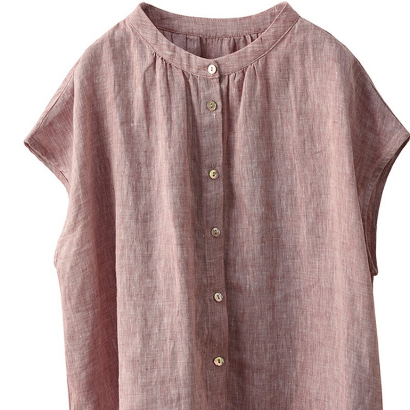 В наличии винтажная женская льняная рубашка из плотной ткани, элегантный однобортный топ с воротником-стойкой и короткими рукавами.