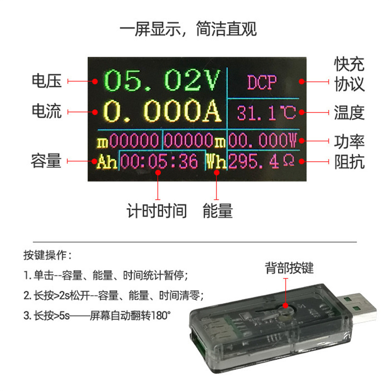 1. 采用5A大电流USB接口,可实现5A大电流测量,不易因过热烧毁USB接口。