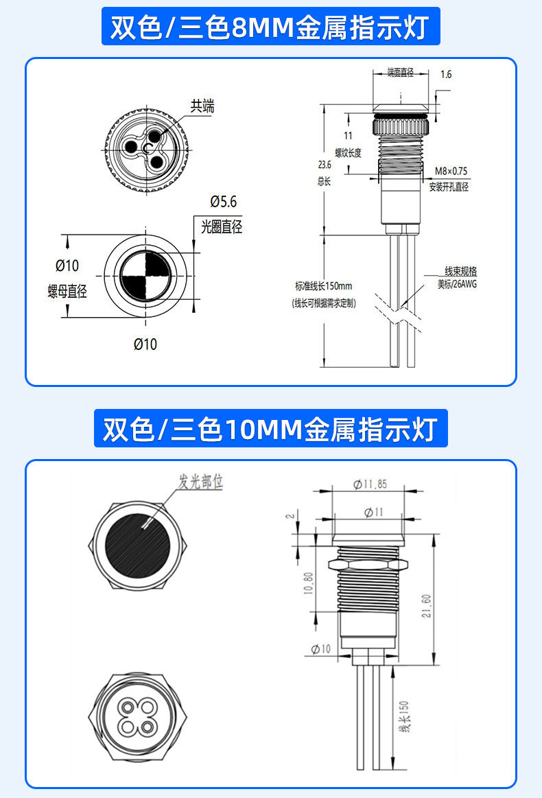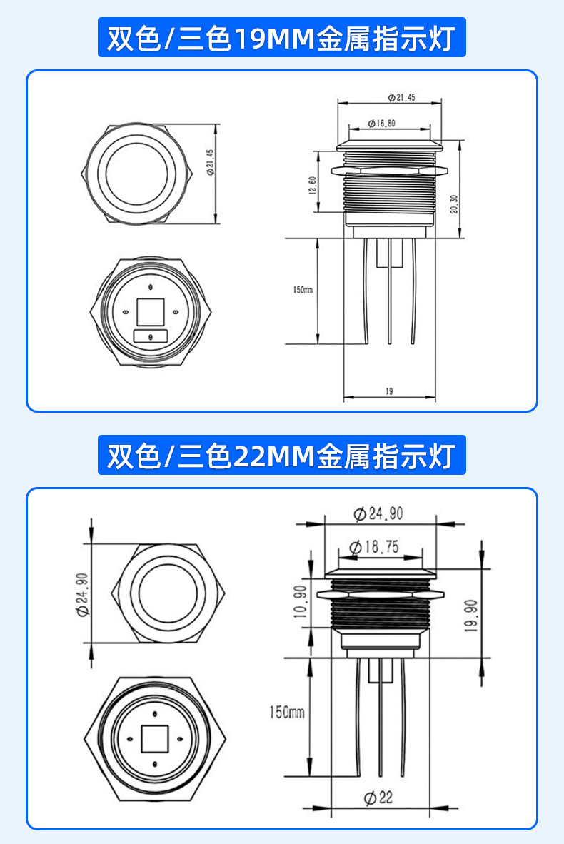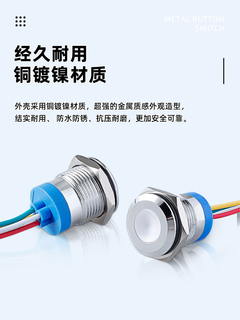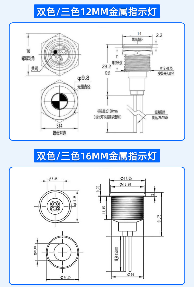 Светодиодный двухцветный трехцветный металлический индикатор, водонепроницаемый сигнальный светильник 8/10/12/16/19/22 мм, рабочий источник питания 24 В