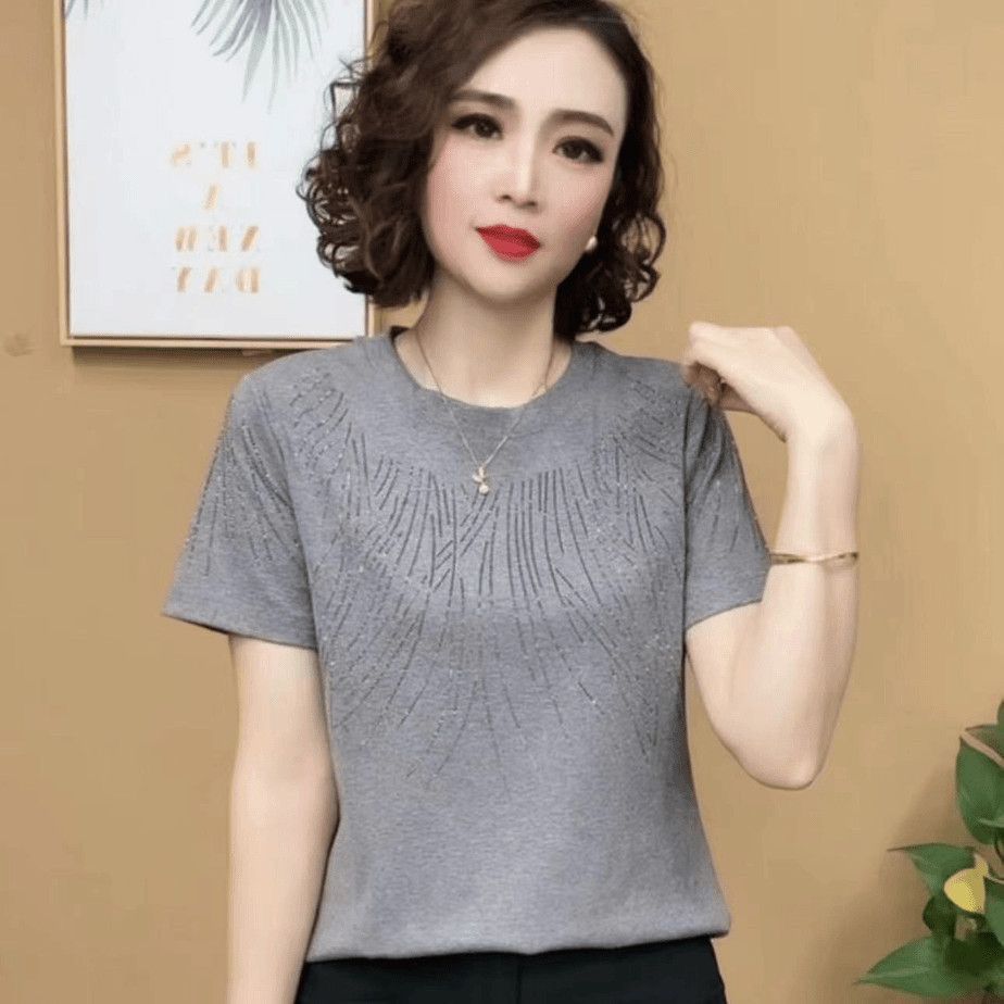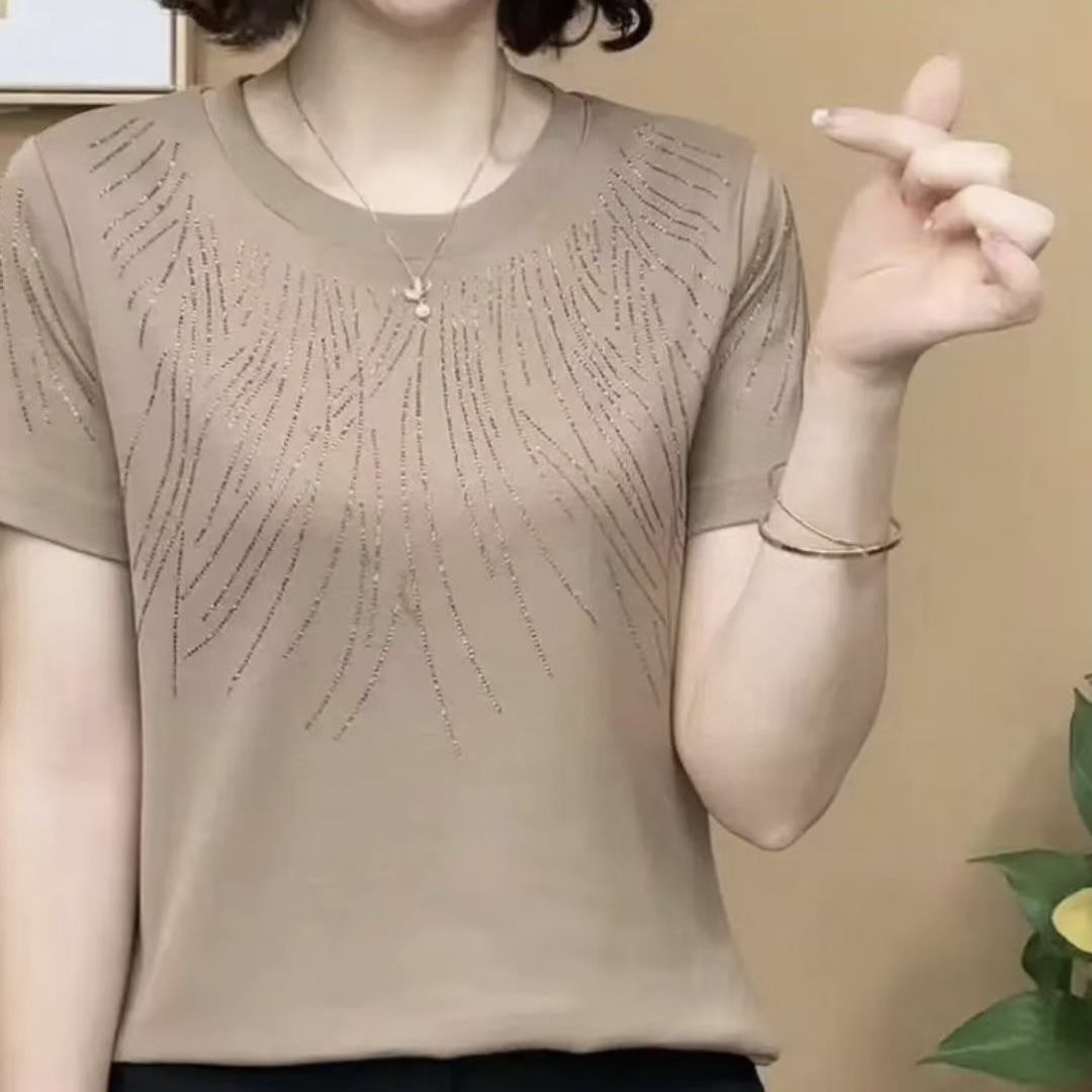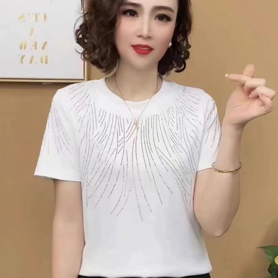 Женская футболка с короткими рукавами для мам среднего возраста, летняя, новый стиль, однотонная, с круглым вырезом, повседневная, плотная, с бриллиантами, утягивающий топ для женщин