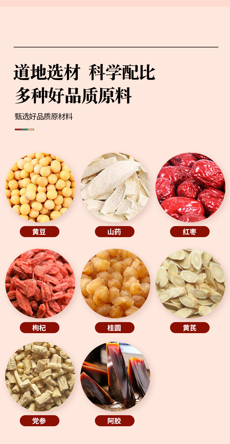 Соевые бобы, ямс, ягоды годжи, лонган, астрагал, кодонопсис, желатин из ослиной кожи.