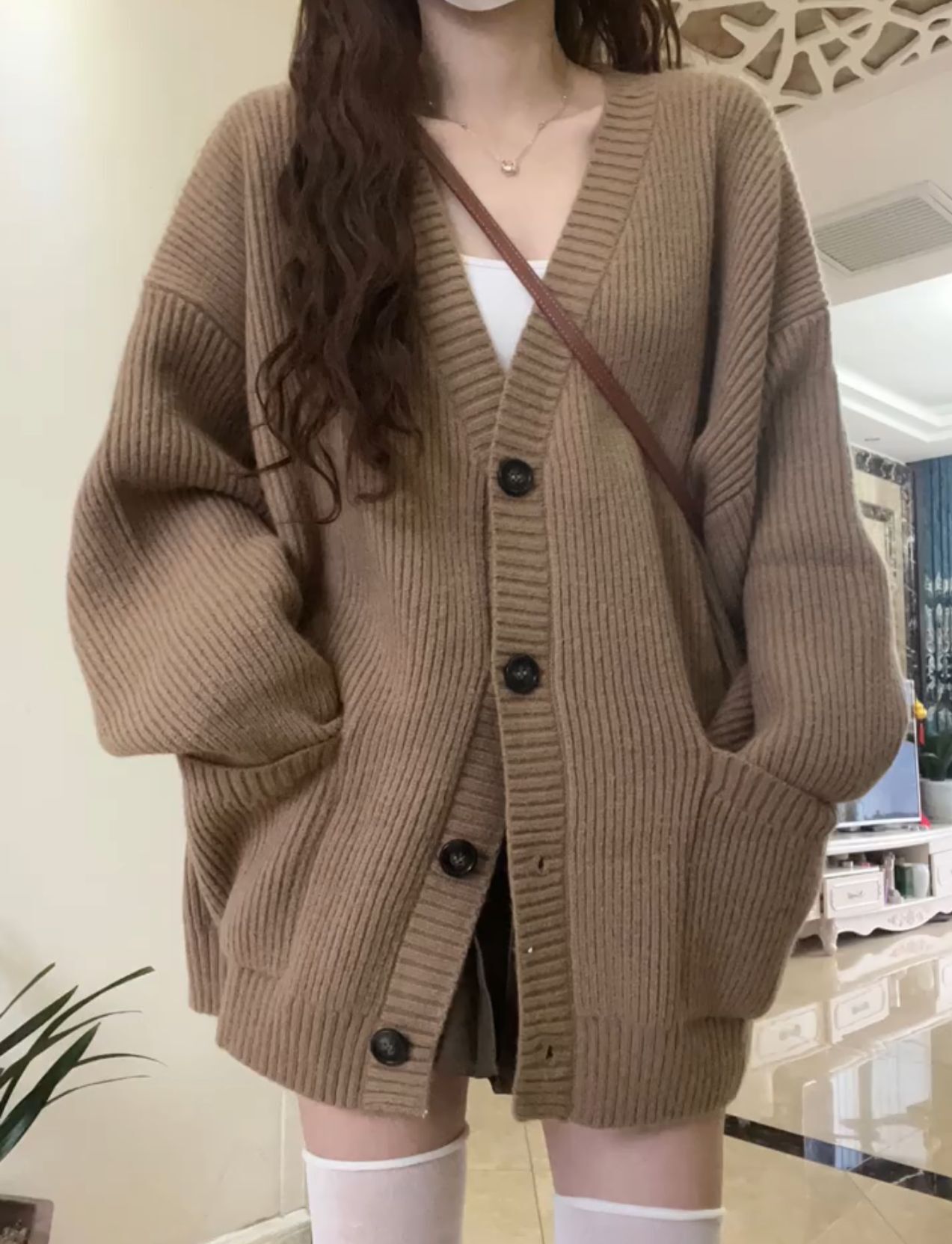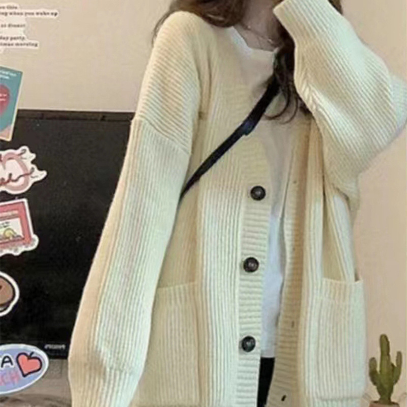 2025 новый свитер для женщин в стиле колледжа, кардиган для студентов в корейском стиле, свободный V-образный вырез, универсальный однотонный вязаный кардиган