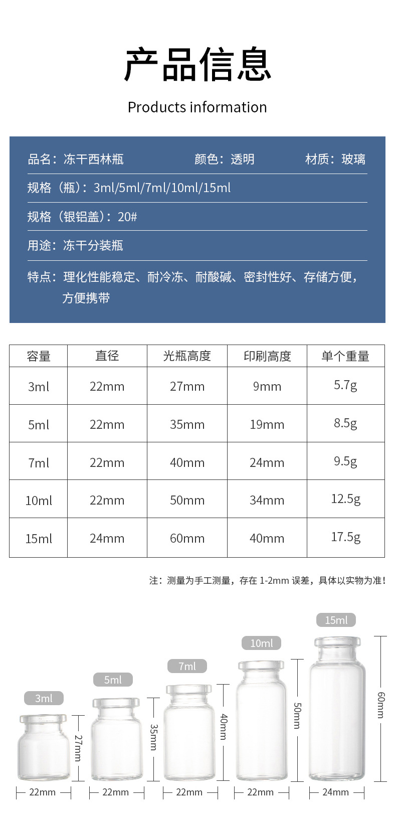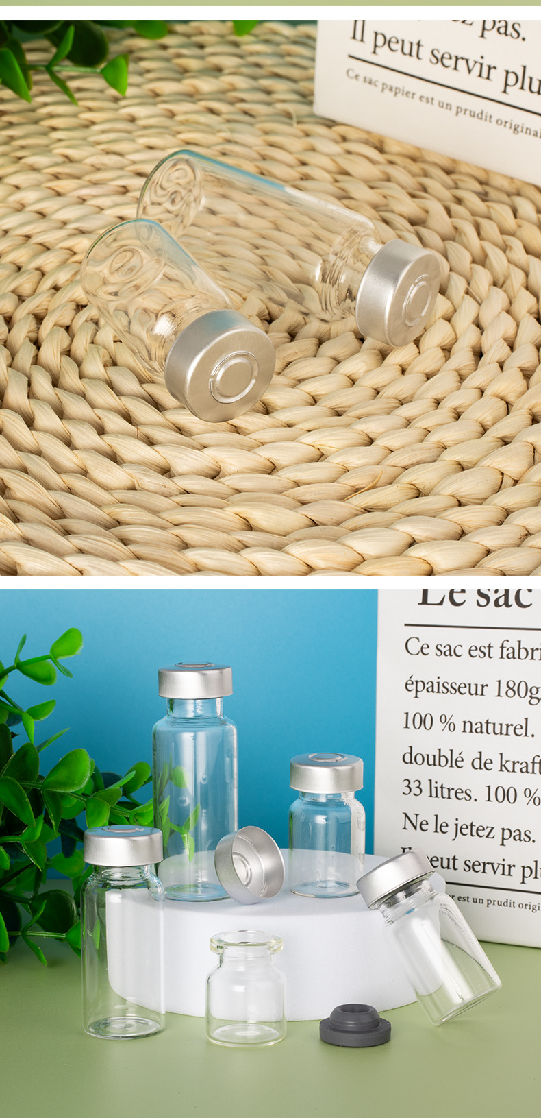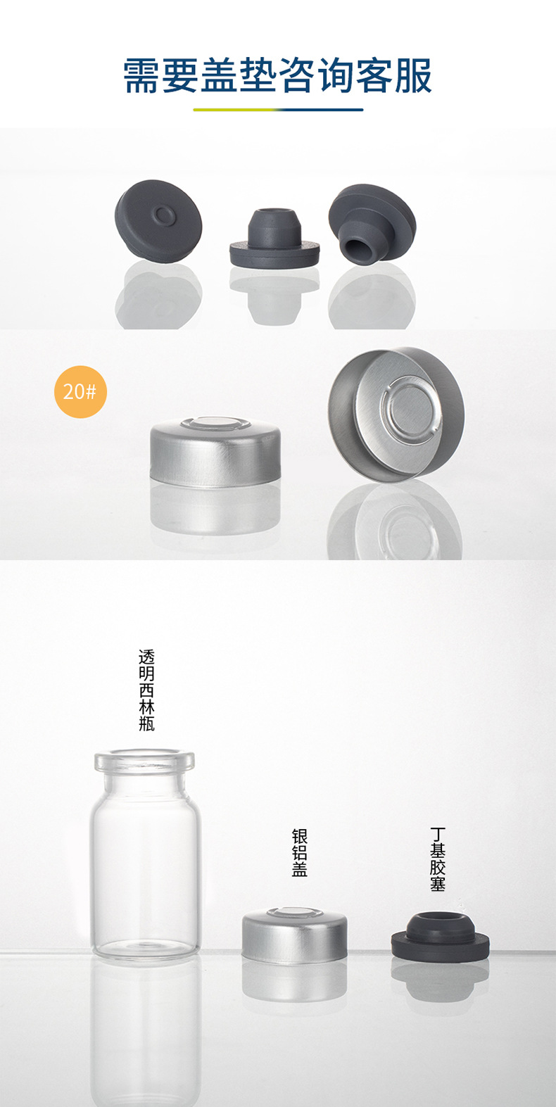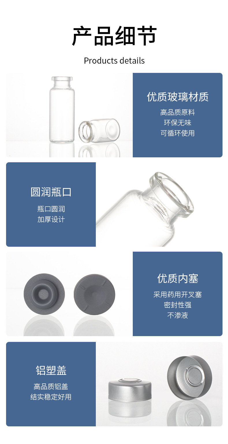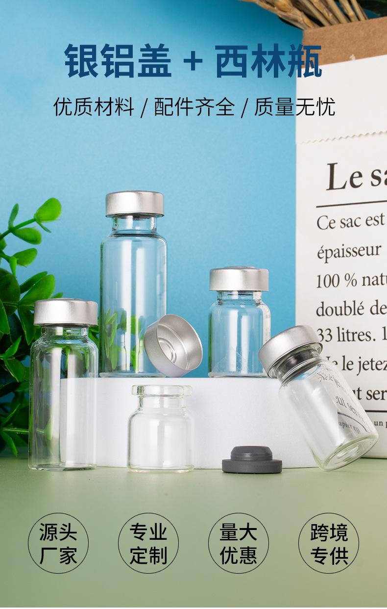 Безупречная бутылка объемом 3 мл (22*27 мм); прозрачный; стекло; 5 мл (22*35 мм) пустая бутылка; прозрачный; стекло; Безупречная бутылка объемом 7 мл (22*40 мм); прозрачный; стекло; 10 мл (22*50 мм) пустая бутылка; прозрачный; стекло; 15 мл (24 мм*60 мм) пустая бутылка; прозрачный; стекло; Аксессуары (алюминиевая крышка + резиновая пробка); прозрачный; стекло; Аксессуары (алюминиевая крышка с головкой + резиновая заглушка); прозрачный; стекло