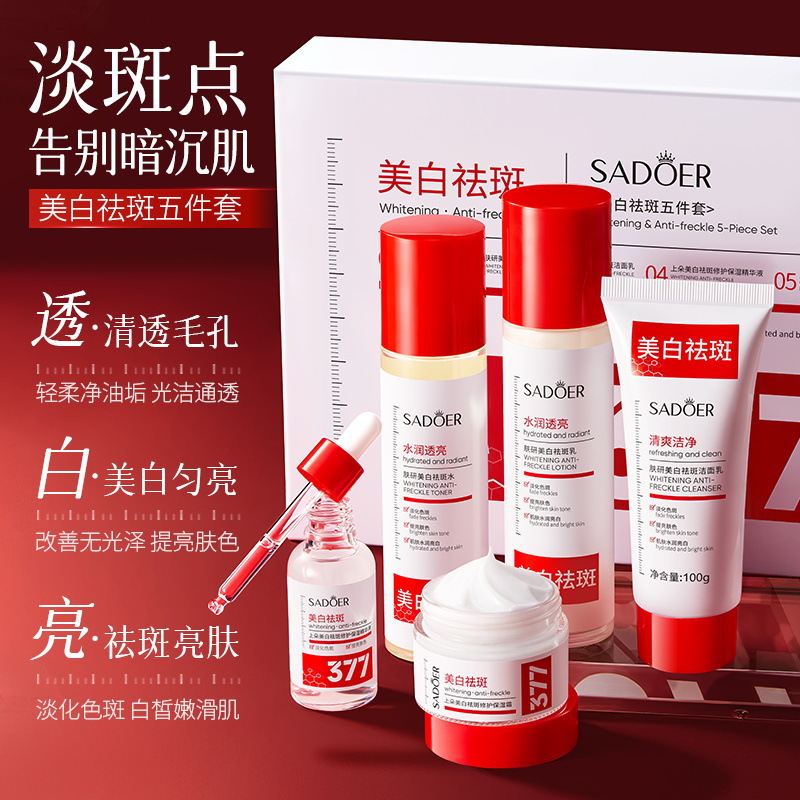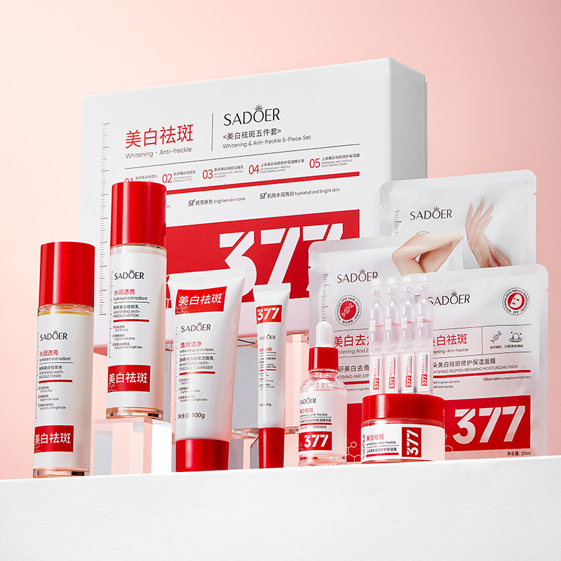 Маска для рук (377) 35мл/пара; Маска для ног (377) 35 мл/пара; Набор из пяти предметов (377) 100г+100мл+100мл+30мл+50г; Эссенция 1,5млx10; Эссенция (377) 30 мл; Увлажняющий крем (377) 20г; Увлажняющий крем (377) 50г; Маска для лица (377) 25 мл; Очищающее средство для лица, 100 мл; Молочко для удаления веснушек, 100 мл; Отбеливающая и против веснушек вода 100мл.