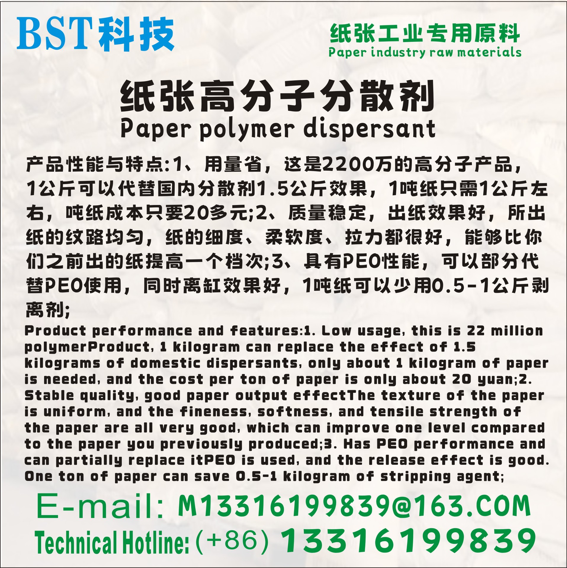 Product, 1 kilogram can replace the effect of 1.5 kilograms of domestic dispersants, only about 1 kilogram of paper is needed, and the cost per ton of paper is only about 20 yuan;