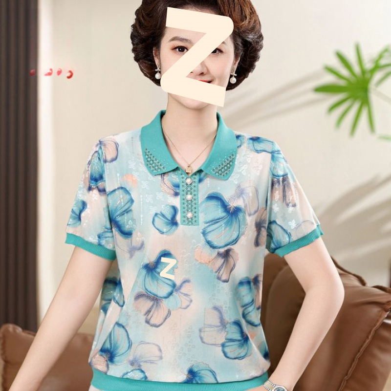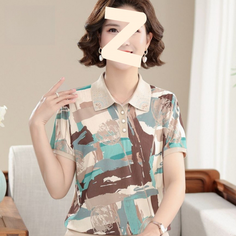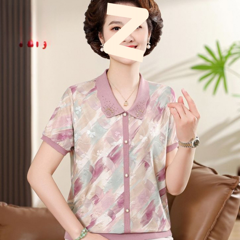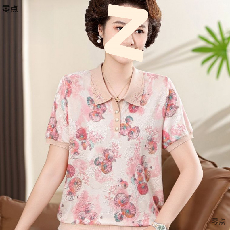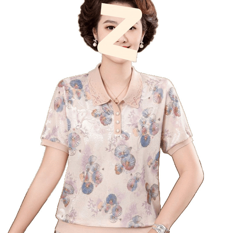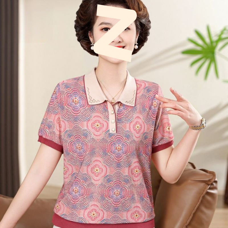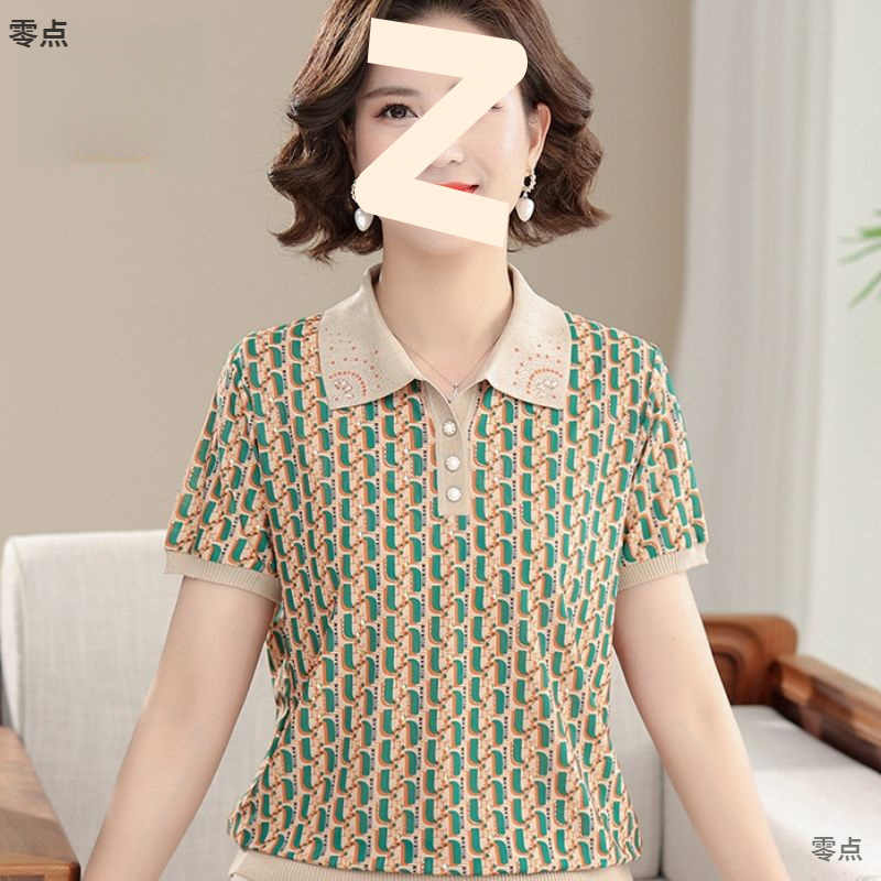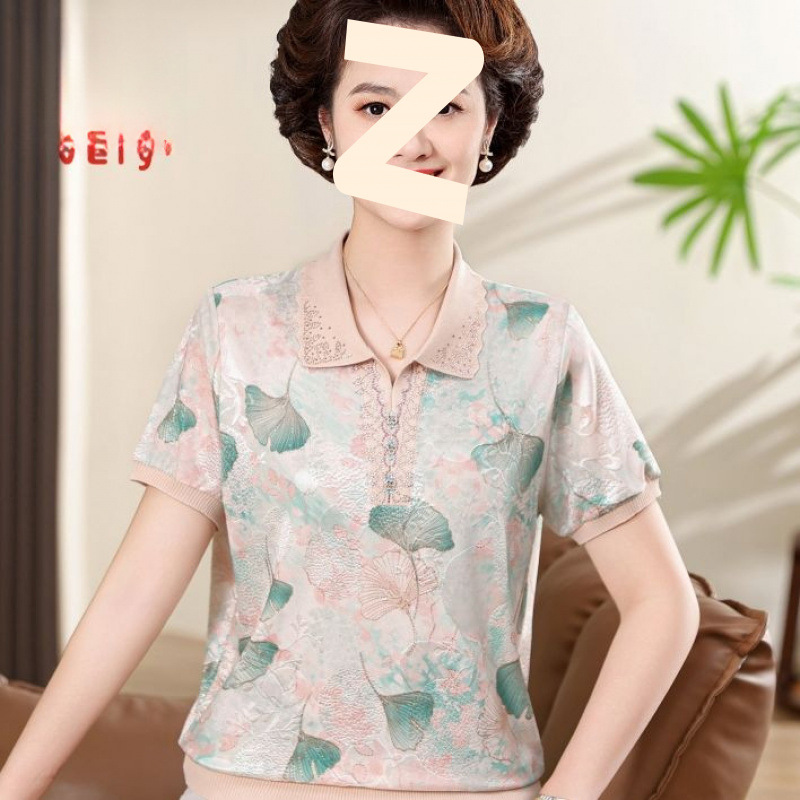 Летняя футболка из ледяного шелка с короткими рукавами для мамы, новый стильный топ с лацканами, свободный стиль, одежда для среднего и пожилого возраста для 50-60 лет