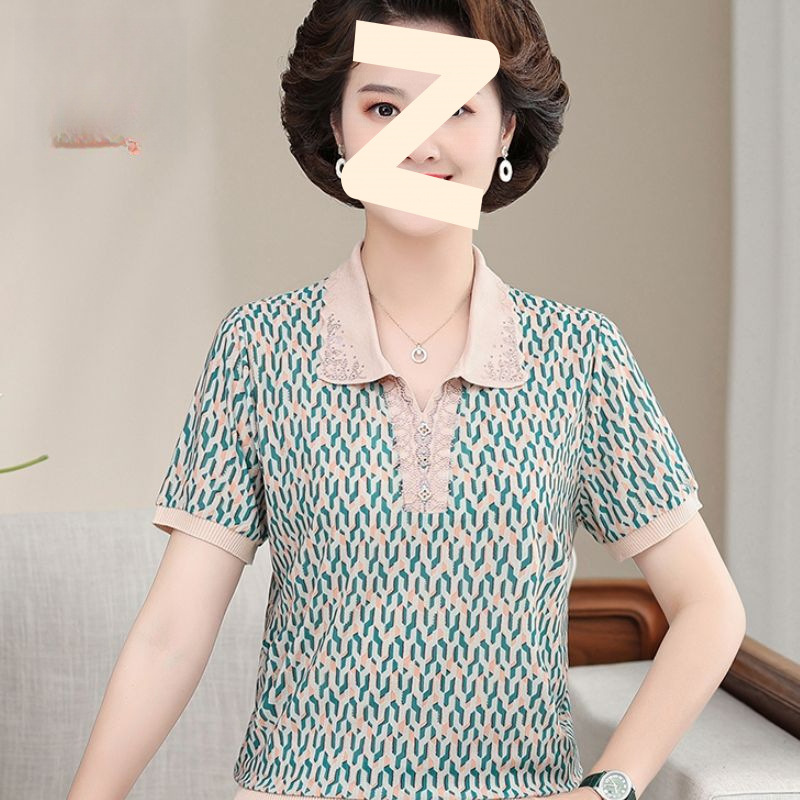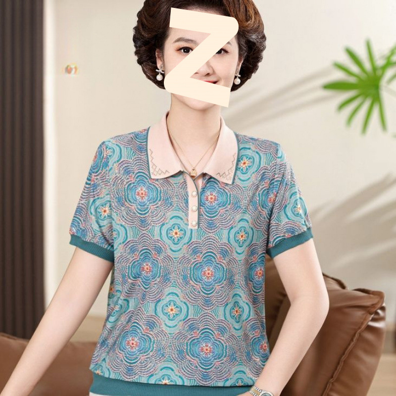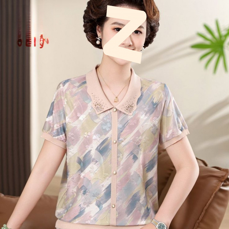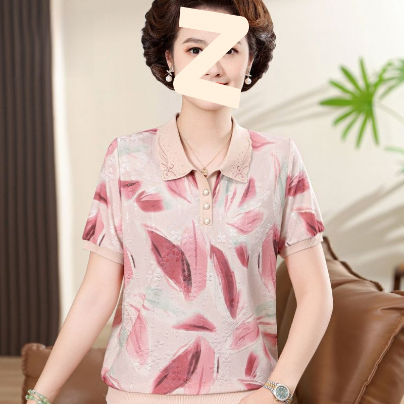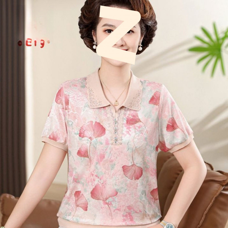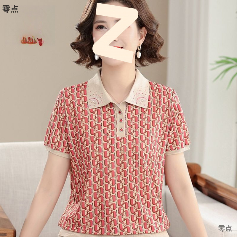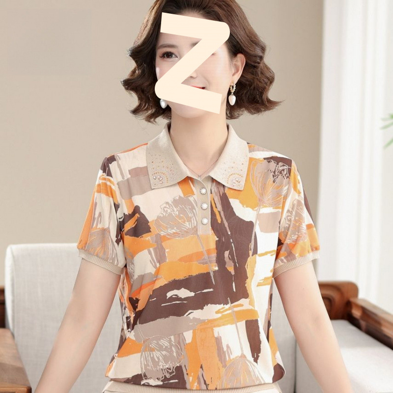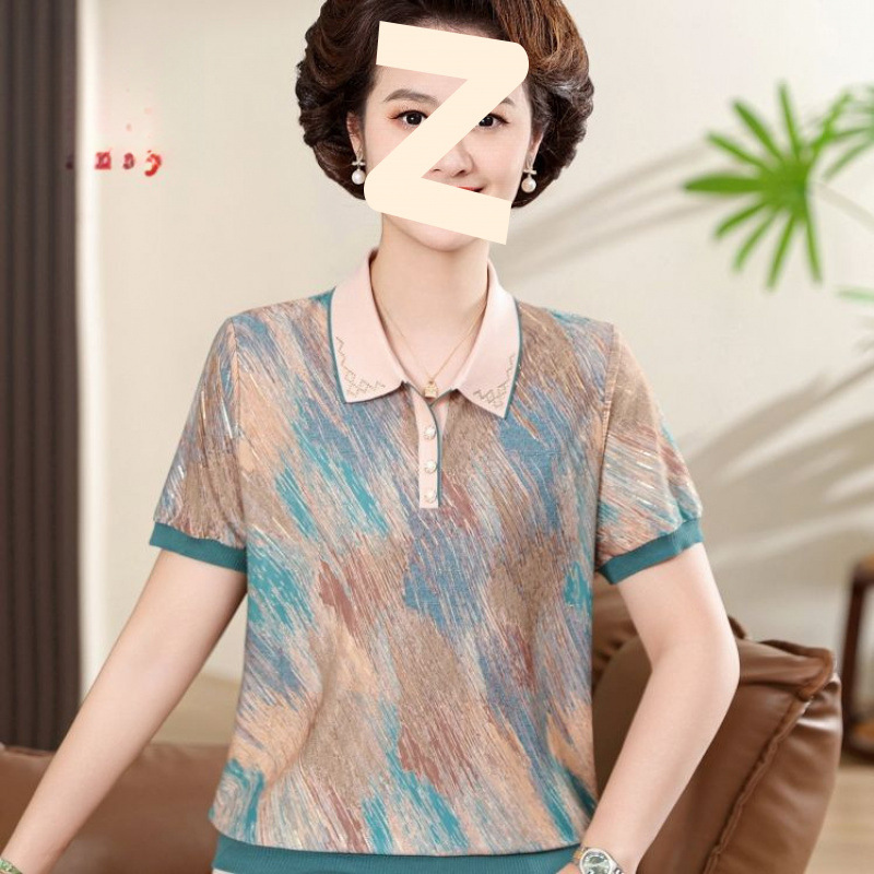 Летняя футболка из ледяного шелка с короткими рукавами для мамы, новый стильный топ с лацканами, свободный стиль, одежда для среднего и пожилого возраста для 50-60 лет