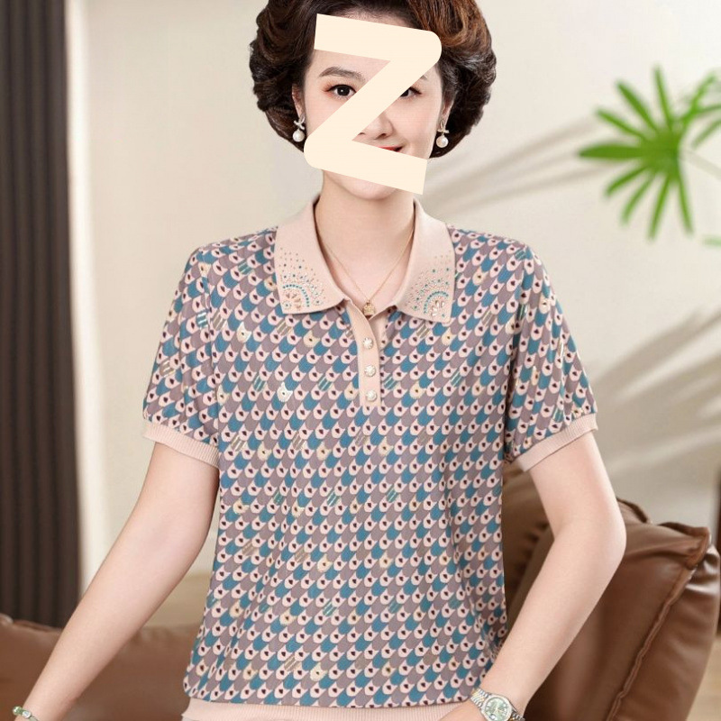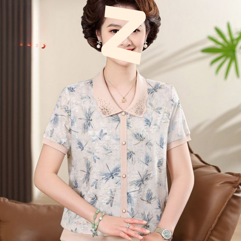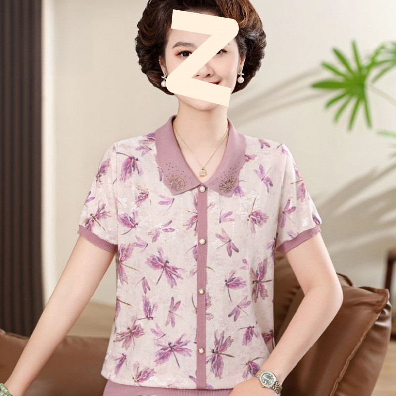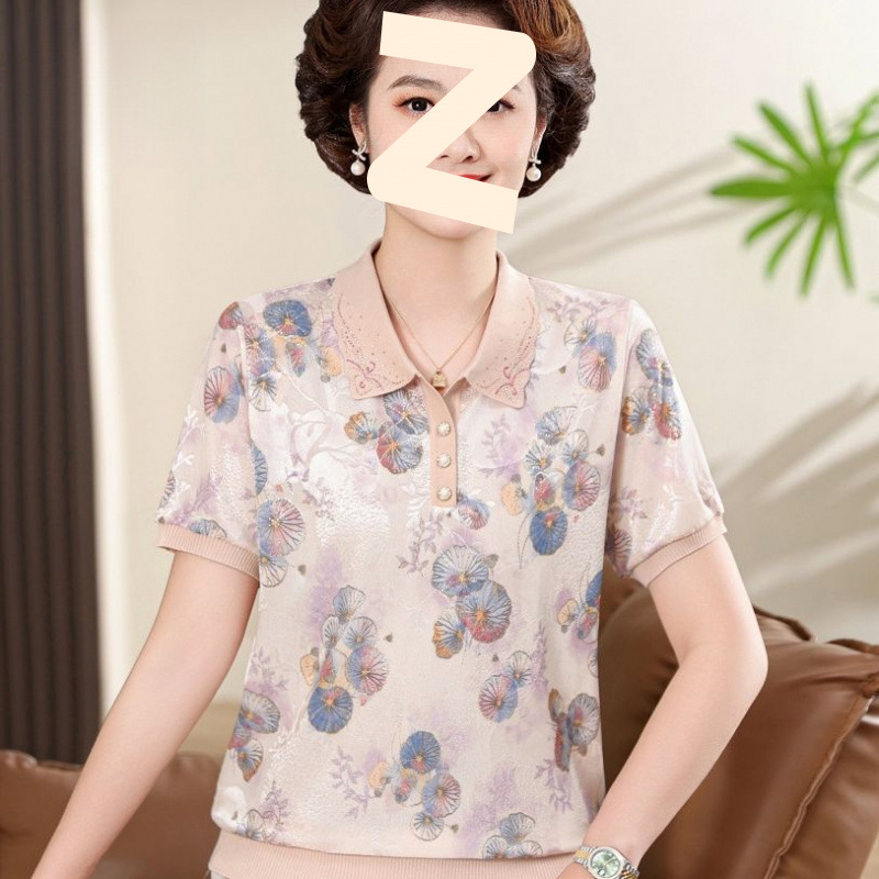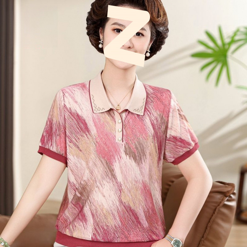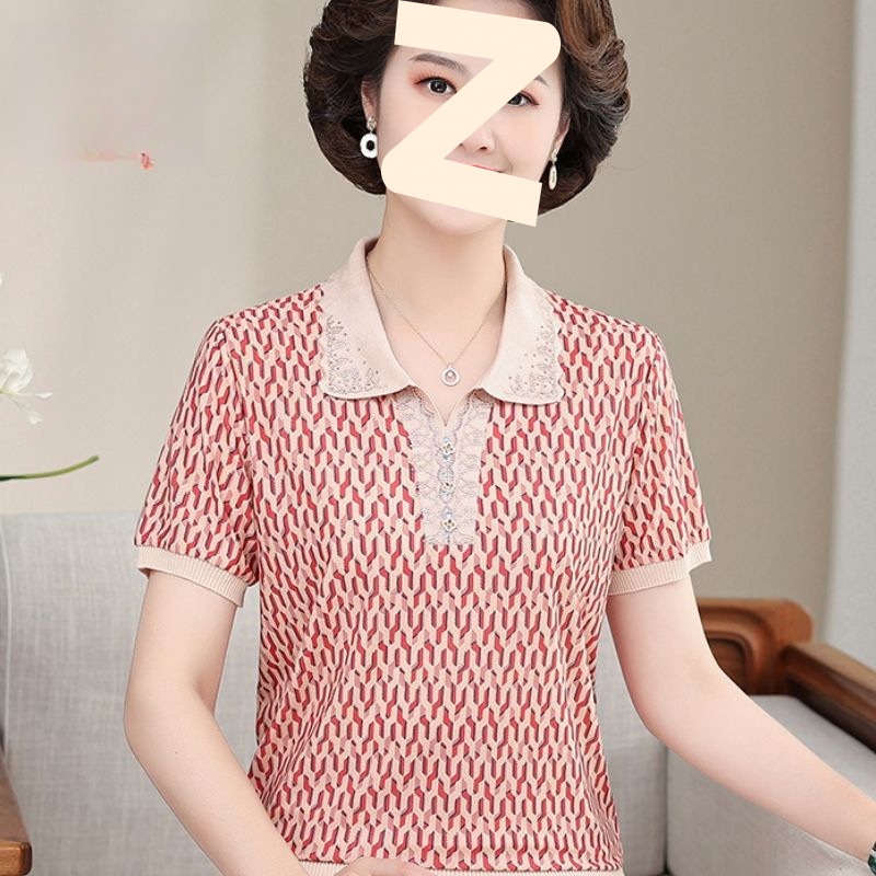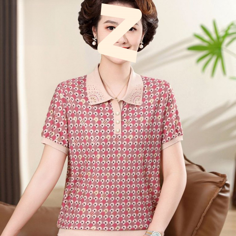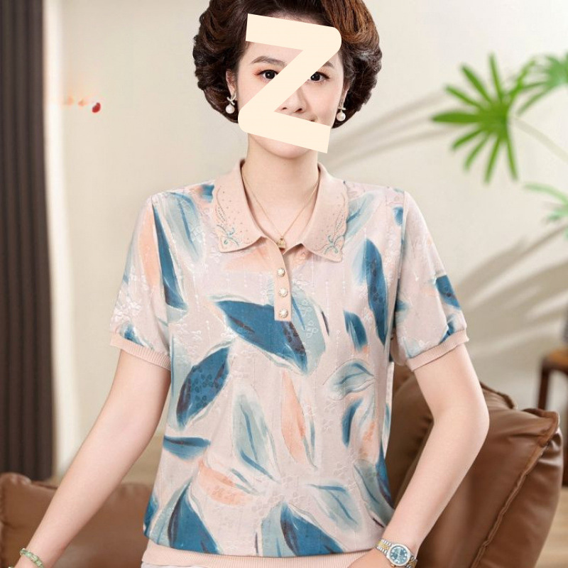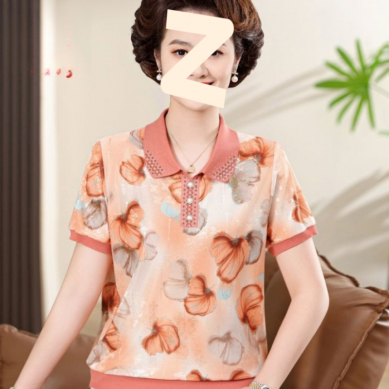 Летняя футболка из ледяного шелка с короткими рукавами для мамы, новый стильный топ с лацканами, свободный стиль, одежда для среднего и пожилого возраста для 50-60 лет