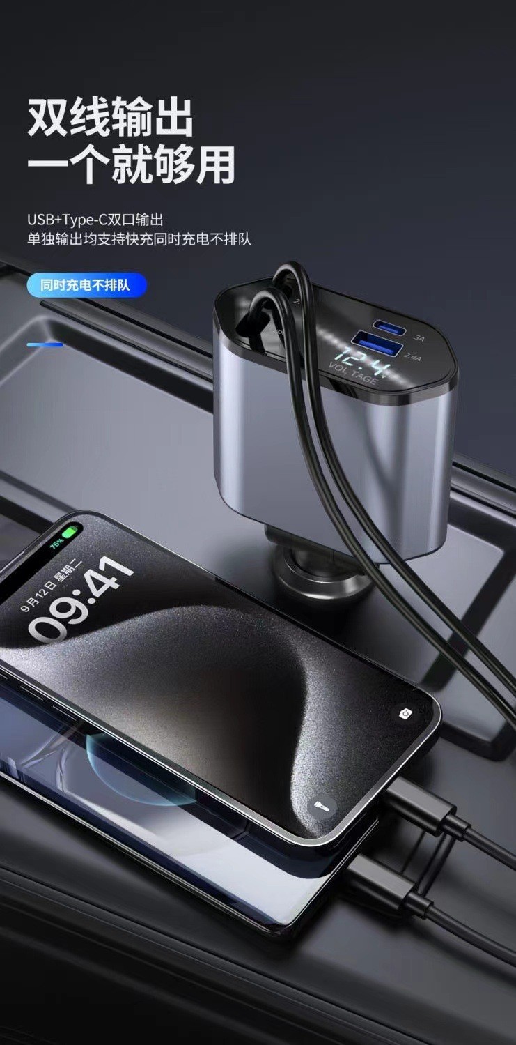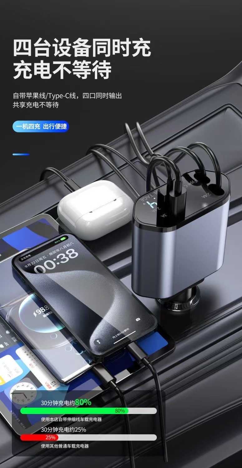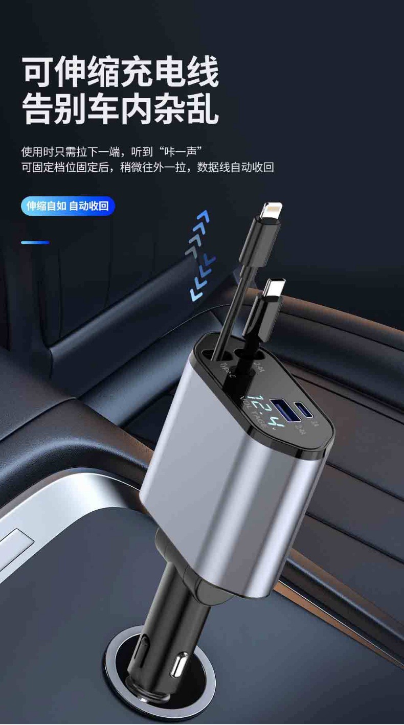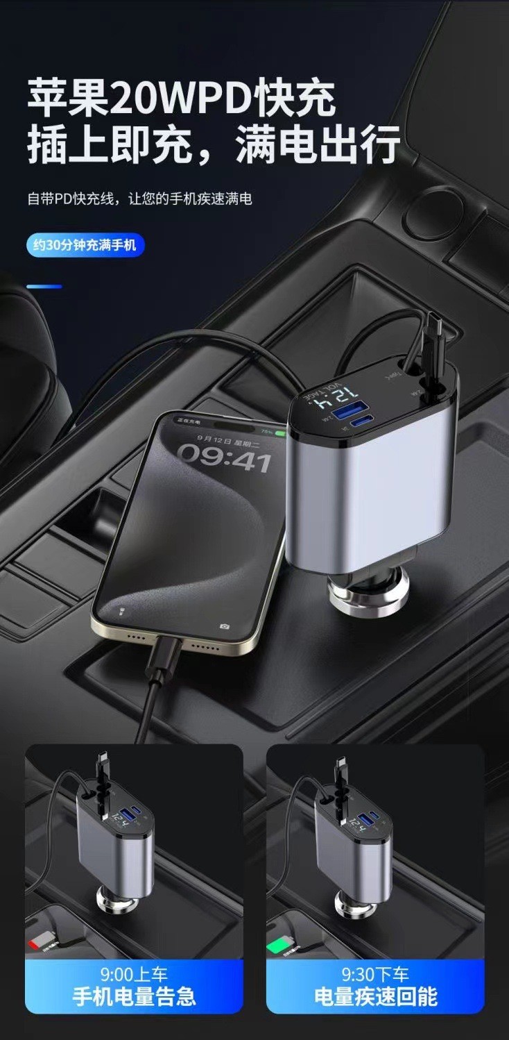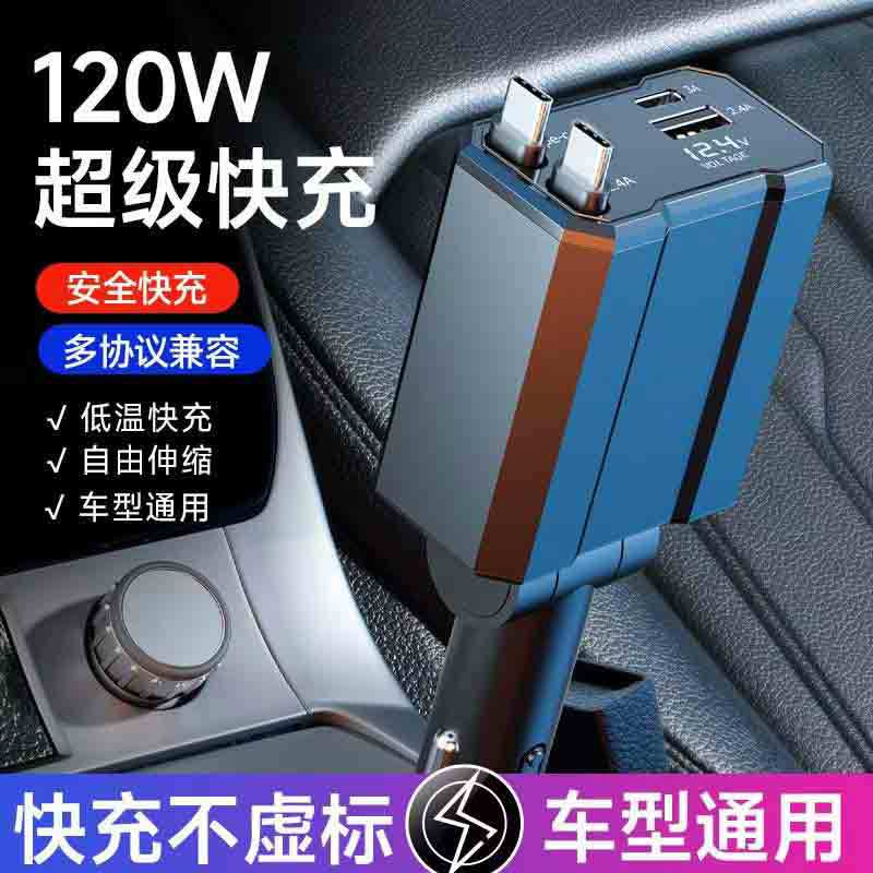 Популярное трансграничное автомобильное зарядное устройство мощностью 120 Вт, многофункциональное универсальное автомобильное зарядное устройство с быстрой зарядкой, универсальное выдвижное автомобильное зарядное устройство с цифровым дисплеем из сплава, один-четыре