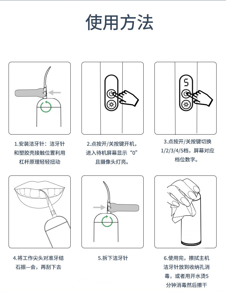 Упаковочная коробка, инструкция по эксплуатации, хост, кабель для передачи данных, рабочая головка*2, маленький гаечный ключ*1, стоматологическое зеркало*1, дезинфицирующая бумага*2
