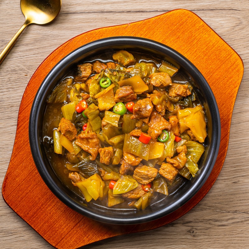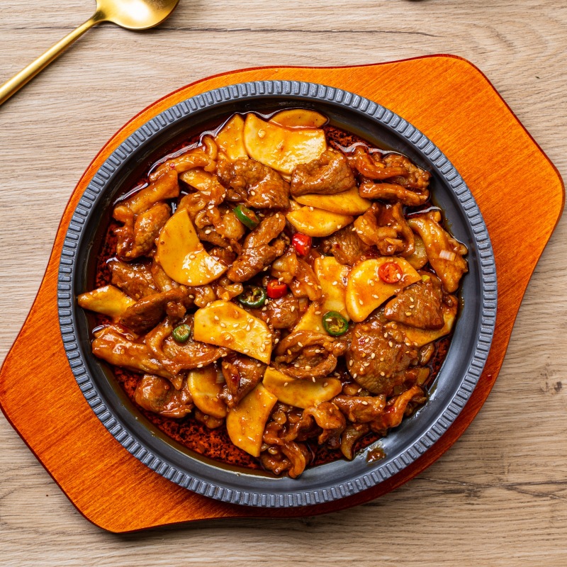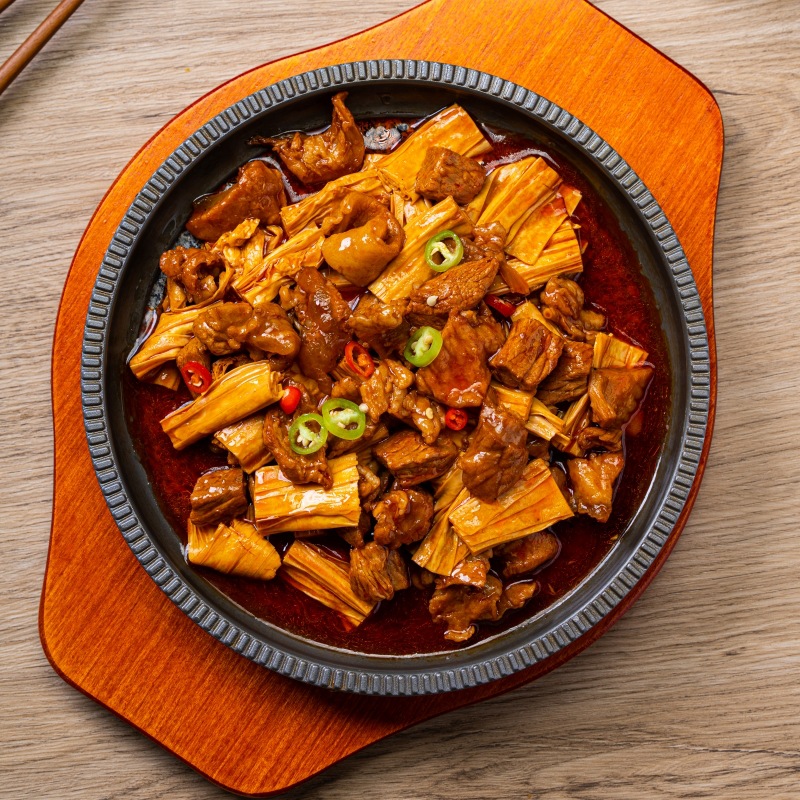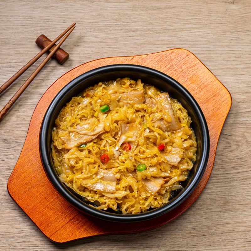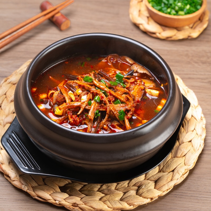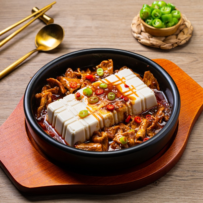 Мясо в обертке 310 г; Корейский острый суп с говядиной, 500 г; Корейский суп с рисом и колбасой, 690 г; Рисовые хлебцы с курицей, 400 г; Ребрышки и рисовая лепешка 430 г; Квашеная капуста и жареная свиная грудинка 350г; Острый кальмар 330 г; Острая баранина с грилем 330 г; Говядина в соленой квашеной капусте 330 г; Ши Пластина с креветками и грибами, 430 г; Ши Пан Духуа Ли Цзин 260 г; Слэйт Говядина с тофу 350 г; Курица на трёх чашках на сланце (400 г); Корейские острый куриные лапки 1000 г; Корейская острая треска 330 г; Корейский суп из трески, 530 г; Овощная рагу с маринованной капустой и белым мясом, 400 г; Говядина карри 260 г; Курица карри 260 г; Вегетарианское карри 200 г; Курица в рагу с грибами, 350 г; Овощная запеканка с рыбным вкусом, 350 г; Тушеная свинина и тофу в кассеруле, 350 г; Фирменный баклажан 250 г; Курица Кунг Пао 220 г; Тушёная свинина 235 г; Шэнцзин Тушёная Свинина 220 г; Рис с свиным хрящом Лунцзян, 220 г; Картофель с говядиной, 260 г; Цзиньтоу Ба Нао 250 г