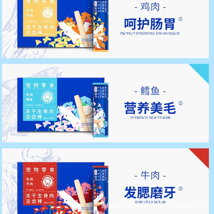 Смешанный вкус детенышей голубей; Вкус говядины голубя; Вкус курицы с голубями; Вкус голубиной трески
