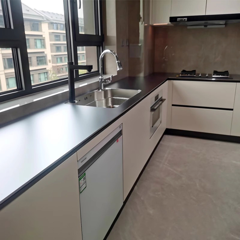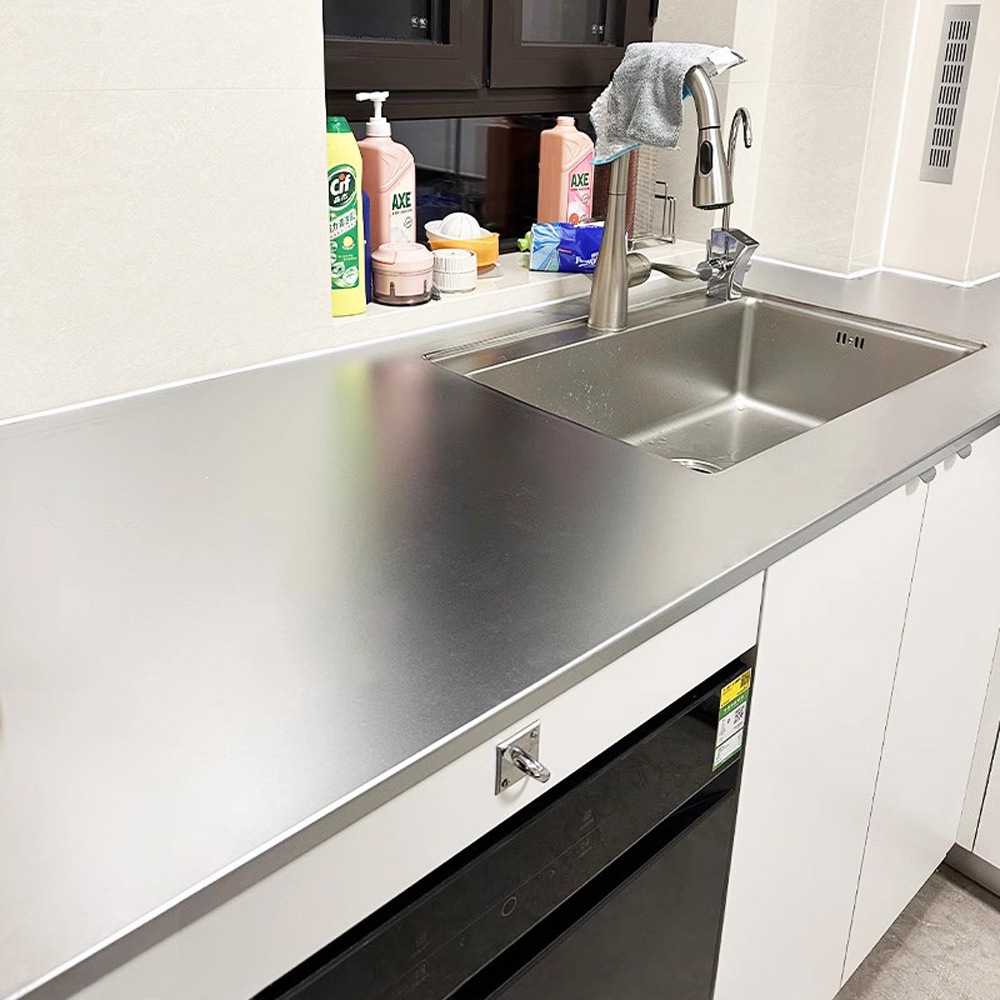 Устойчивая к царапинам доска из нержавеющей стали 304, пескоструйная обработка, хромированная раковина, интегрированная в устойчивую к царапинам цельную столешницу-остров.
