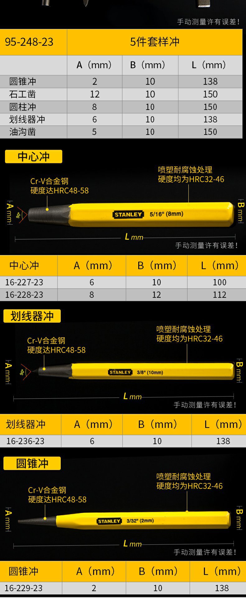 16-227-23 Кернер 6 мм; 16-228-23 Кернер 8 мм; 16-229-23 Конусный пробойник 2 мм; 16-236-23 Пунш для чертилки 10 мм; 95-248-23 Набор пробойников из 5 предметов.; 16-226-23 Набор из 6 цилиндрических пробойников; 16-299-23 Набор пробойников из 12 предметов