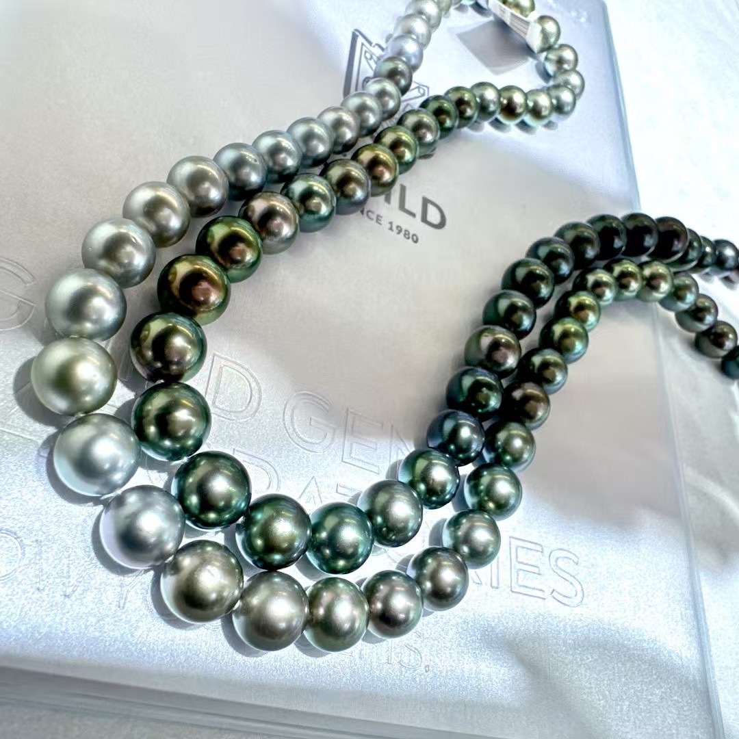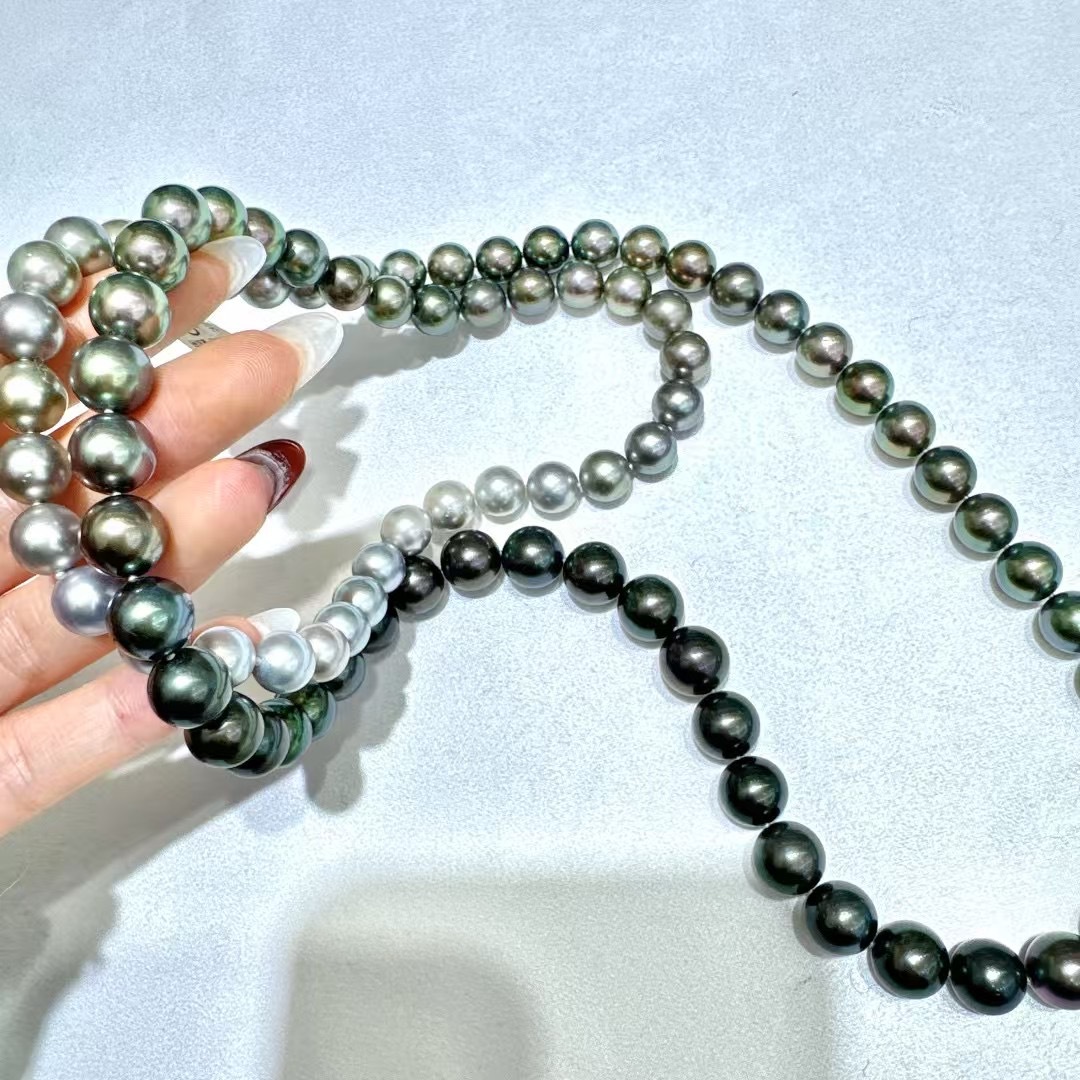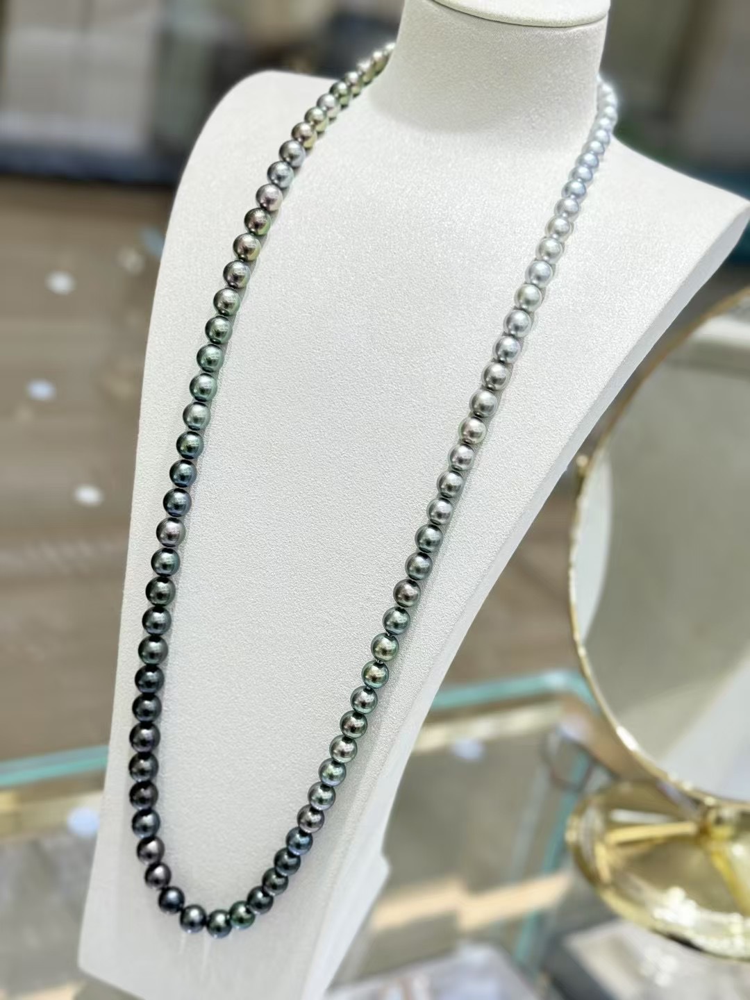 秋冬少不了的毛衣链!大溪地渐变8.3-11.4mm 总长87cm 铂金灰-孔雀绿丝滑渐变 正圆强光细微瑕疵 表皮油亮细腻 隐藏式18k金扣超级特别 上身显贵有格