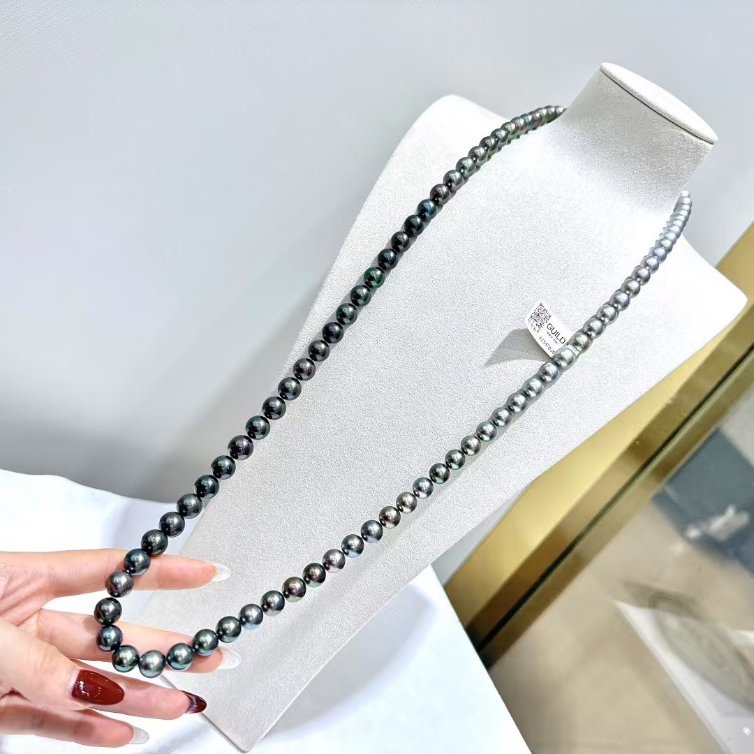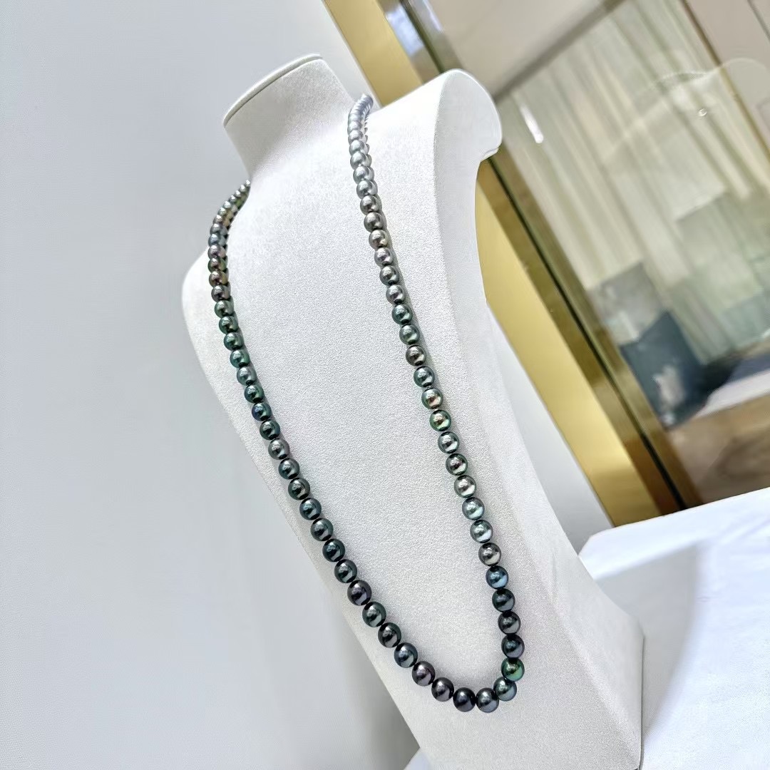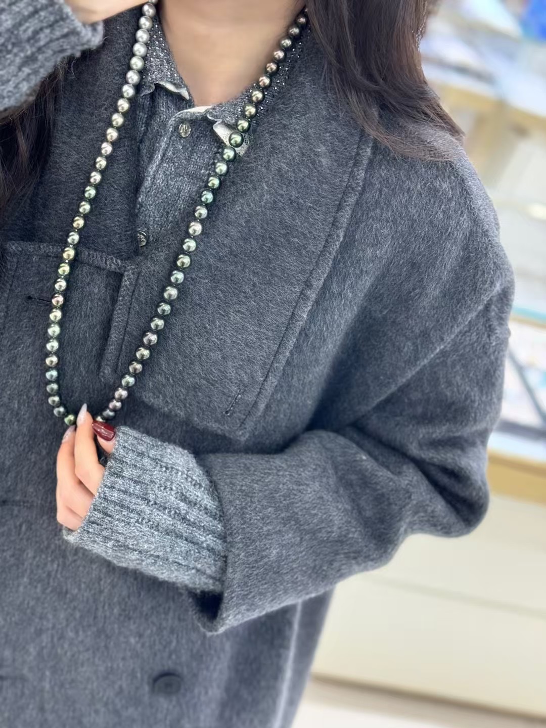 秋冬少不了的毛衣链!大溪地渐变8.3-11.4mm 总长87cm 铂金灰-孔雀绿丝滑渐变 正圆强光细微瑕疵 表皮油亮细腻 隐藏式18k金扣超级特别 上身显贵有格