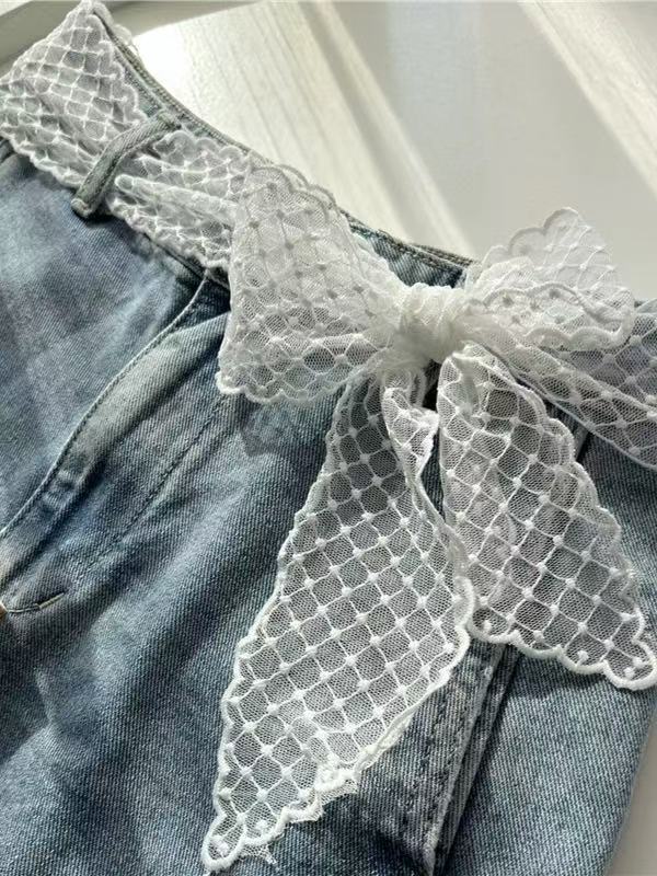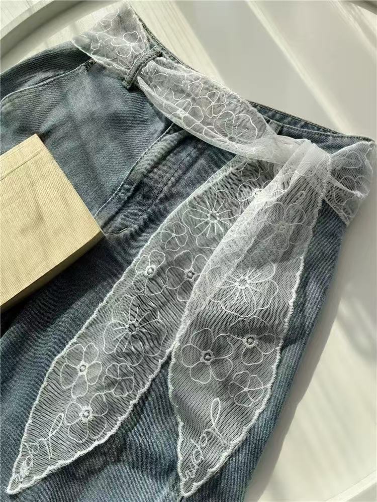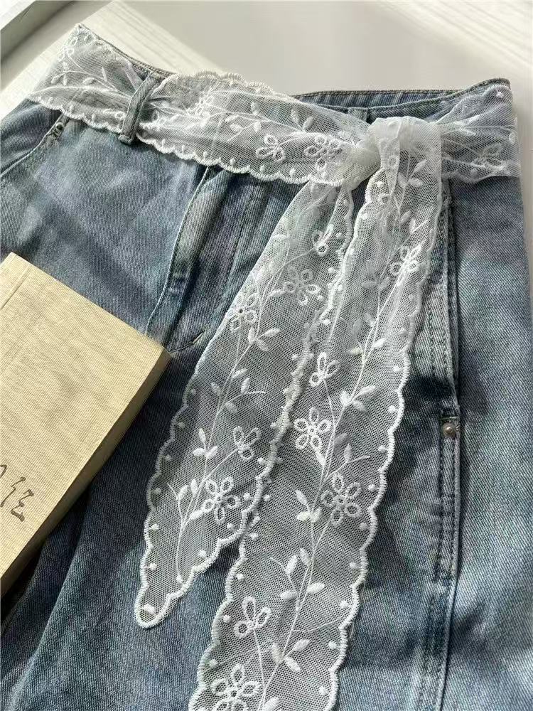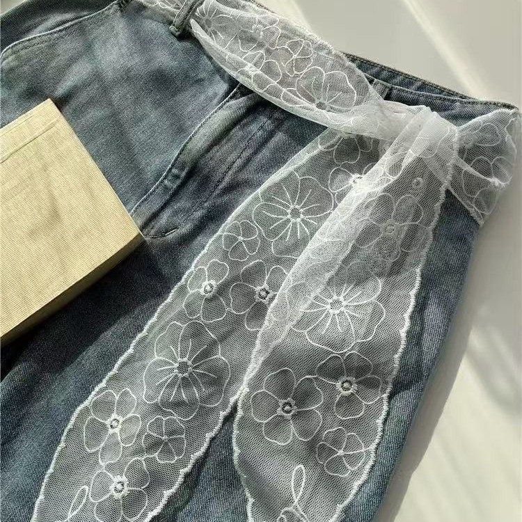 Корейские кружевные джинсы для женщин, весенние новые прямые брюки большого размера в западном стиле, широкие брюки длиной до пола