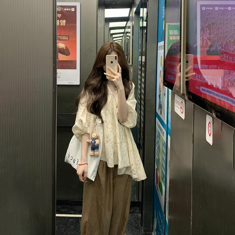 Плюс размер, французская шикарная рубашка с v-образным вырезом и вырезами, женские летние свободные повседневные брюки с высокой талией, костюм из двух предметов
