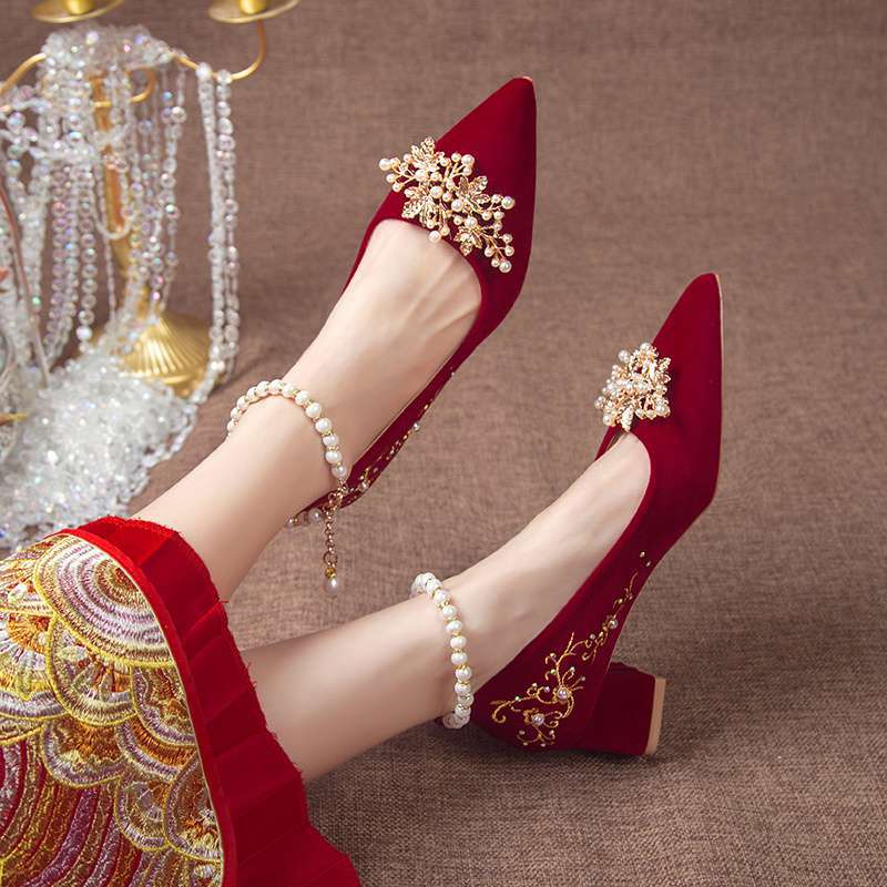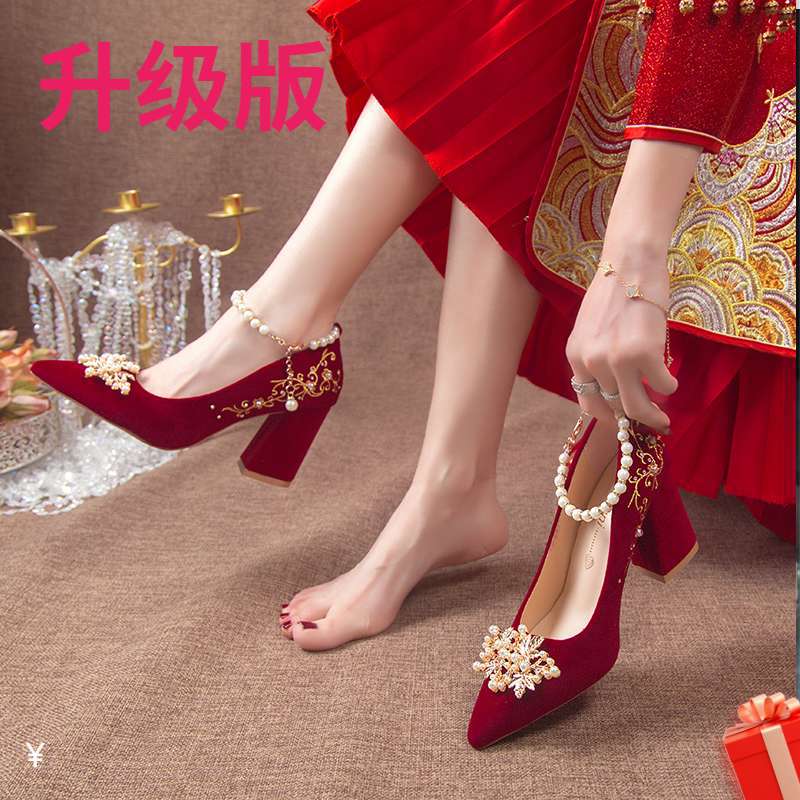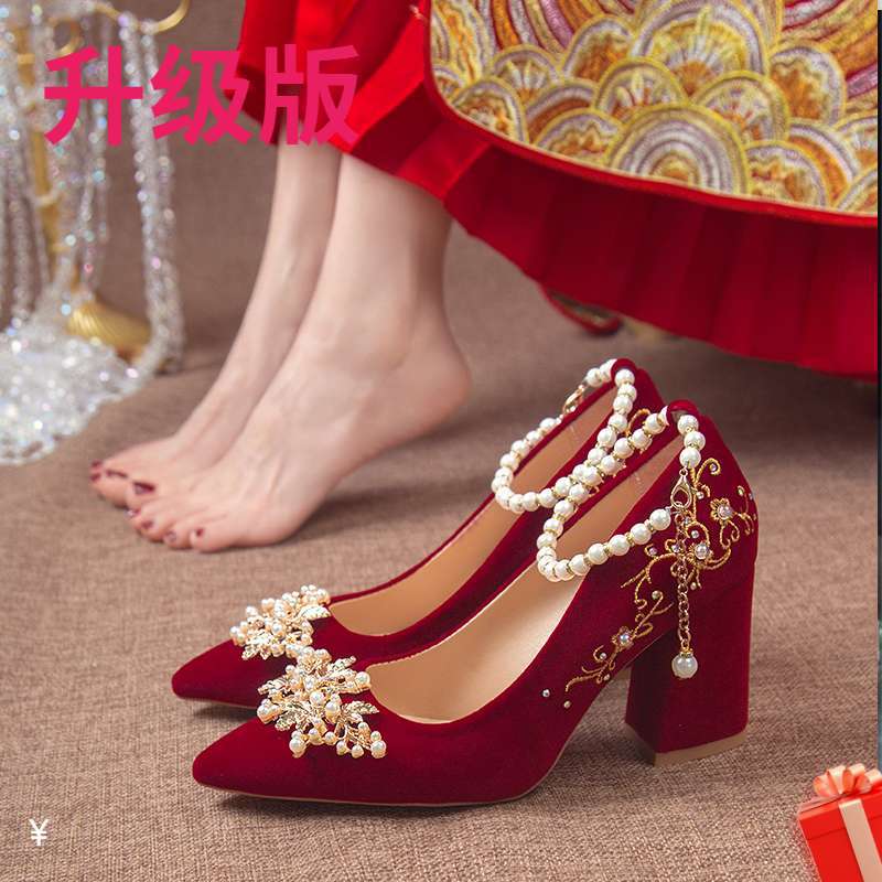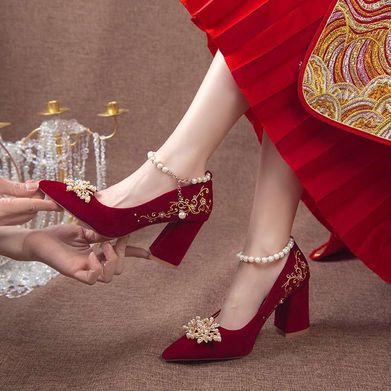 Туфли для свадьбы с острым носком и толстым каблуком 2025, новый китайский стиль Xiuhe, бордовые свадебные туфли для беременных женщин