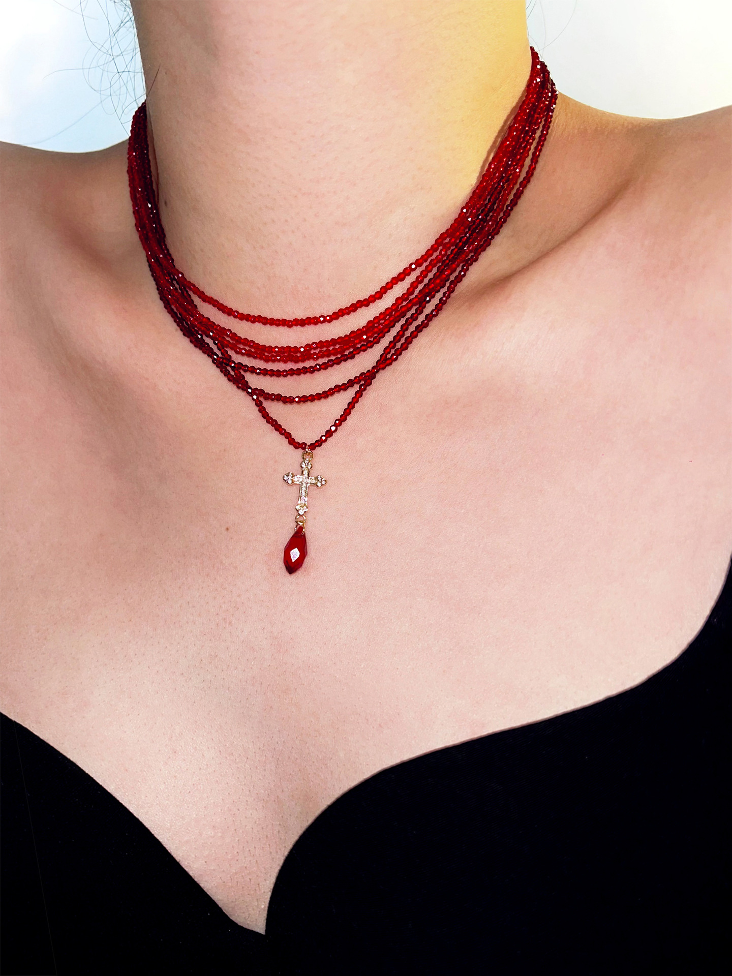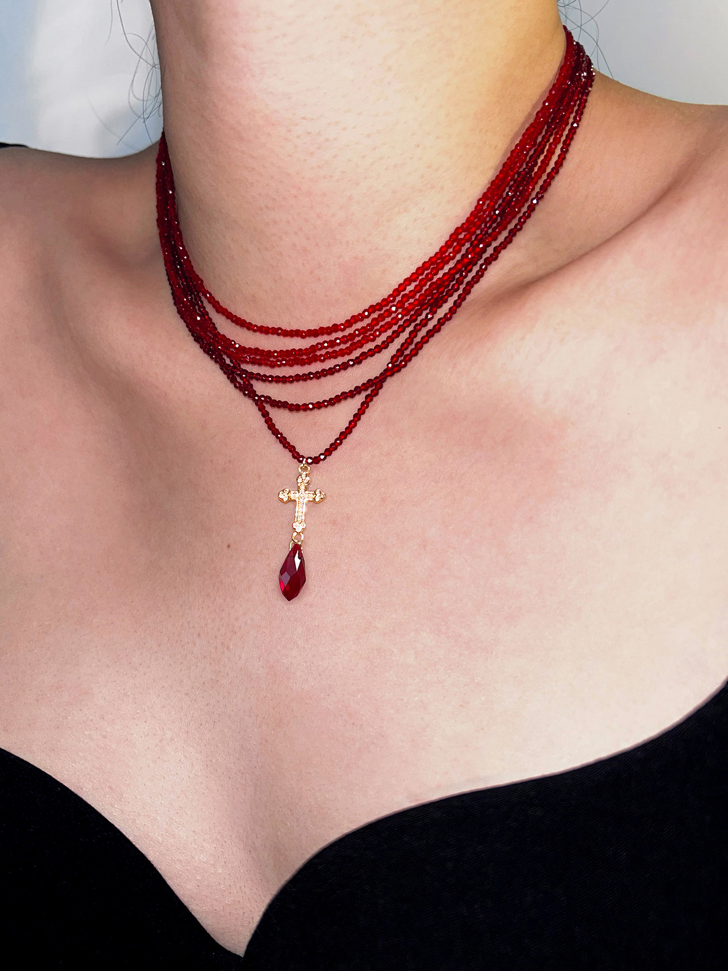 Модель серебряного креста с красным кристаллом; Многослойное колье-капля с красным кристаллом и крестом; Многослойное колье-капля с черным кристаллом и крестом