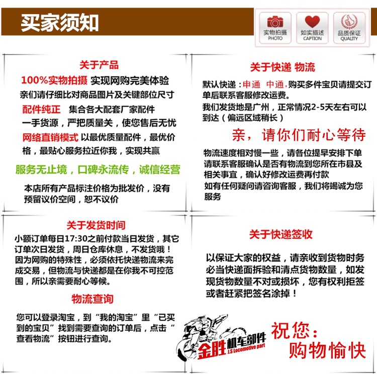 【买家注意】请先确定好车型再下单,不清楚的请拆下来再确定好车型,免得不一样,买家们确定好再下单.。。签收前一定要先验货完整再签收。签收后一律视为货物完整,如货物破损请一律拒收,马上联系客服,谢谢大家的配合。
