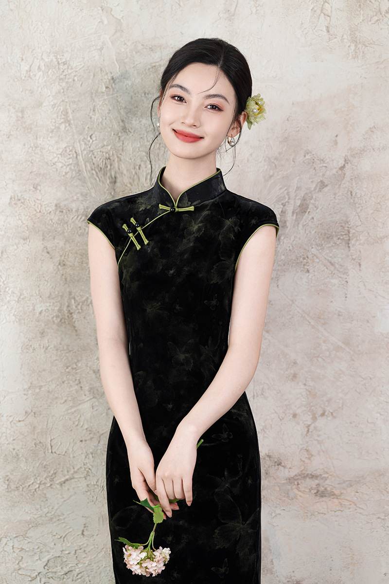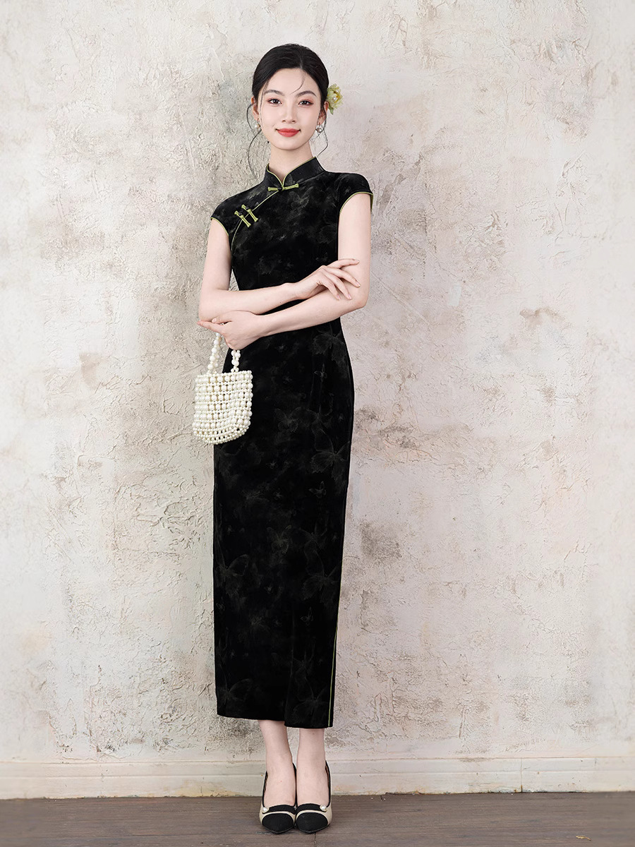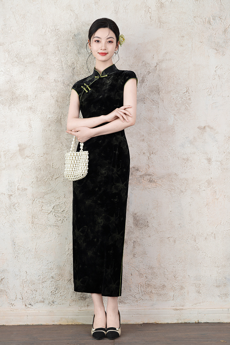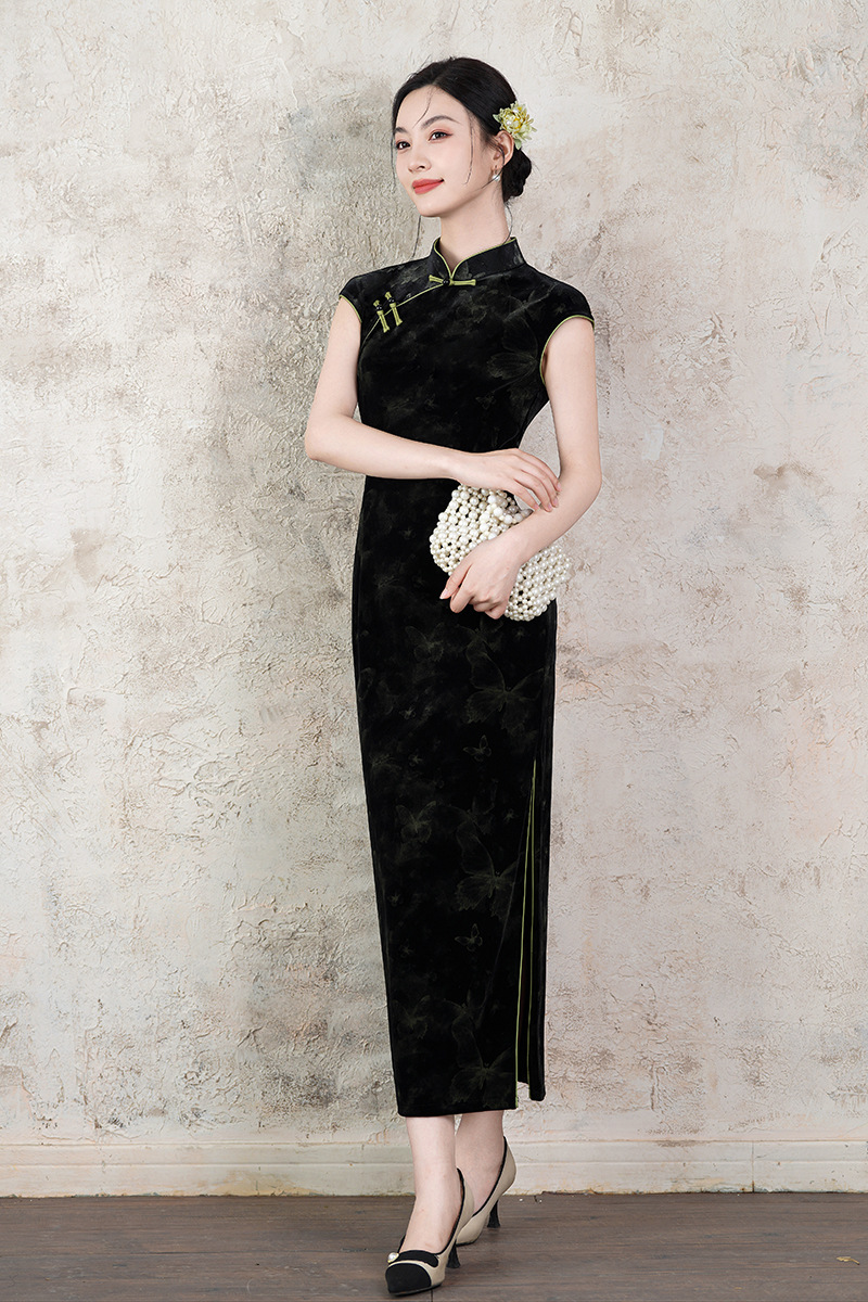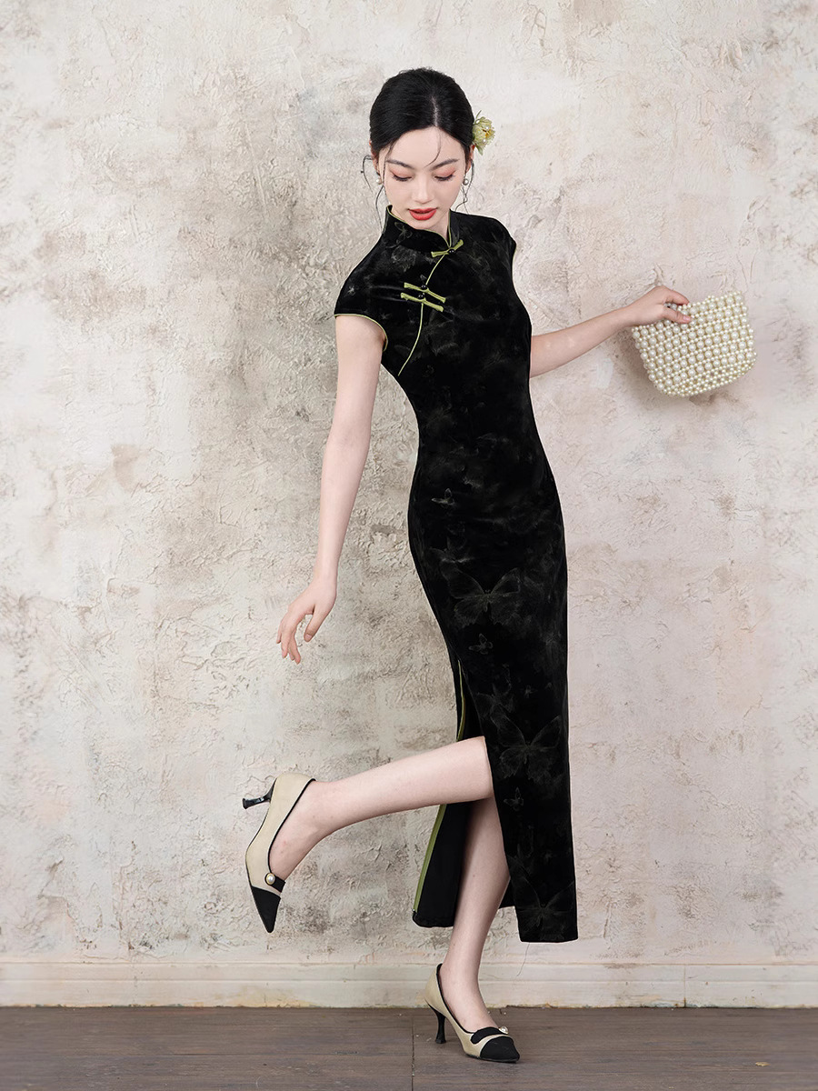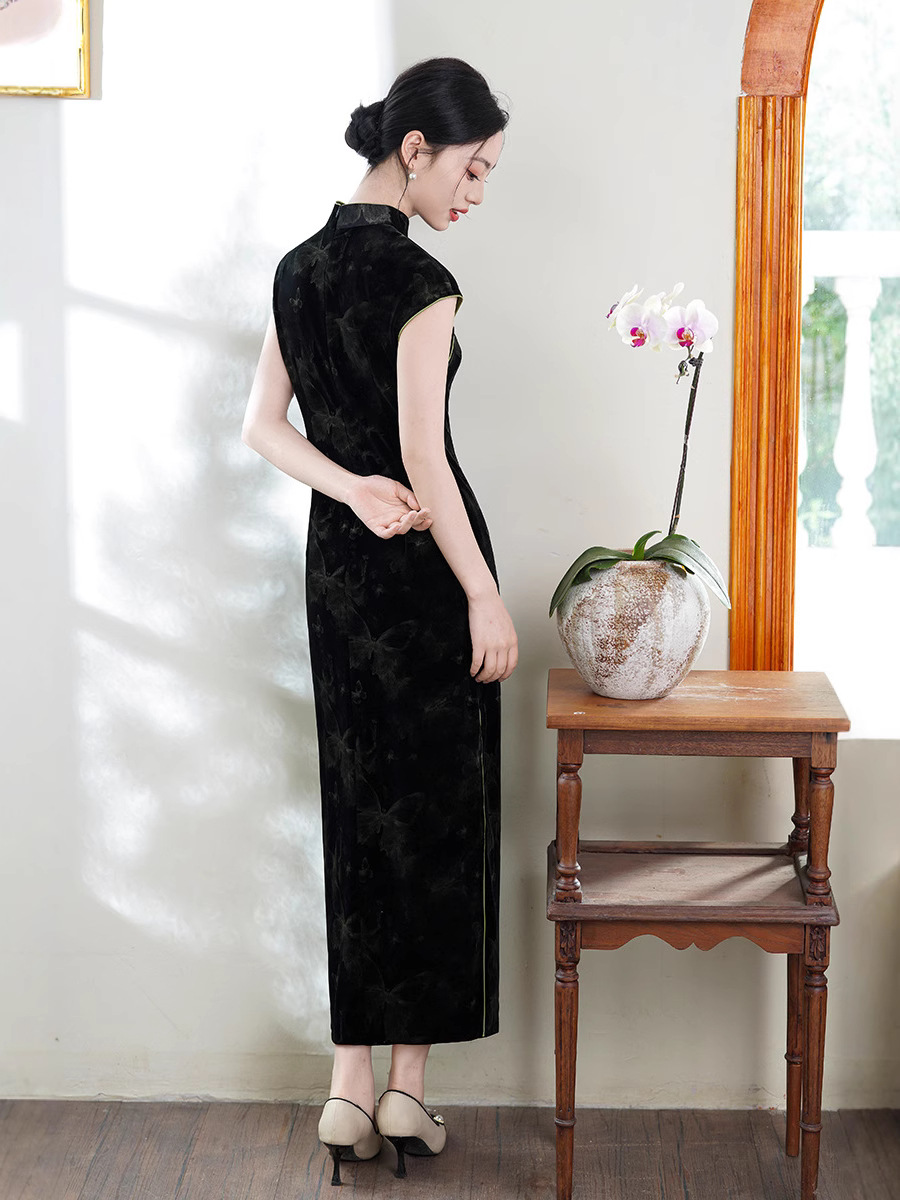 Новое летнее платье-чонсам 2025 года, чёрное, с принтом, без рукавов, в ретро-стиле, улучшенная модель в китайском стиле, повседневная носка, с бабочками.