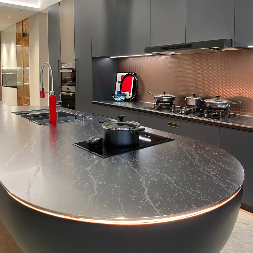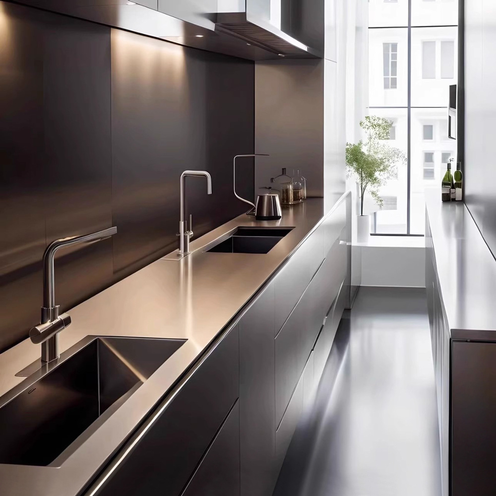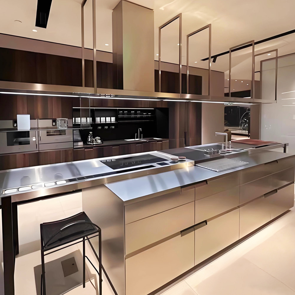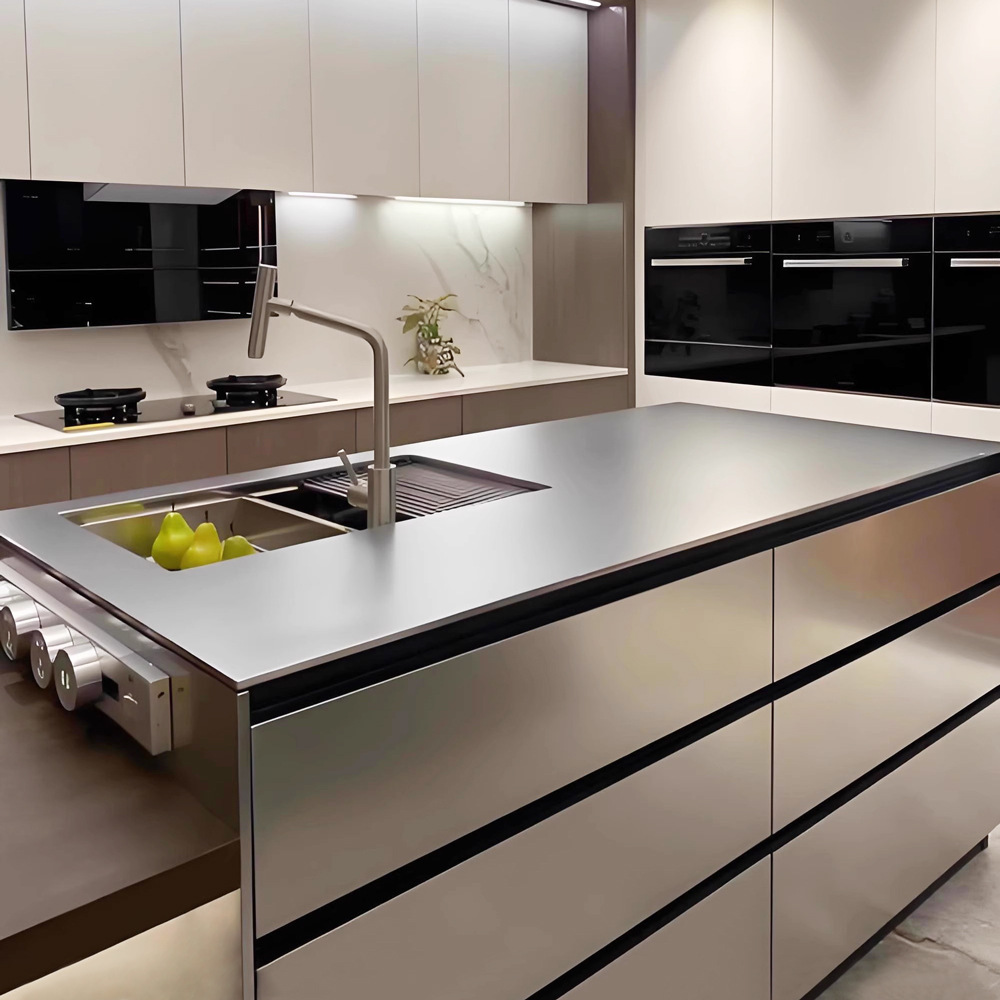Столешница из нержавеющей стали под заказ, интегрированная кухонная рабочая поверхность с островом, полностью сварная и бесшовная конструкция.