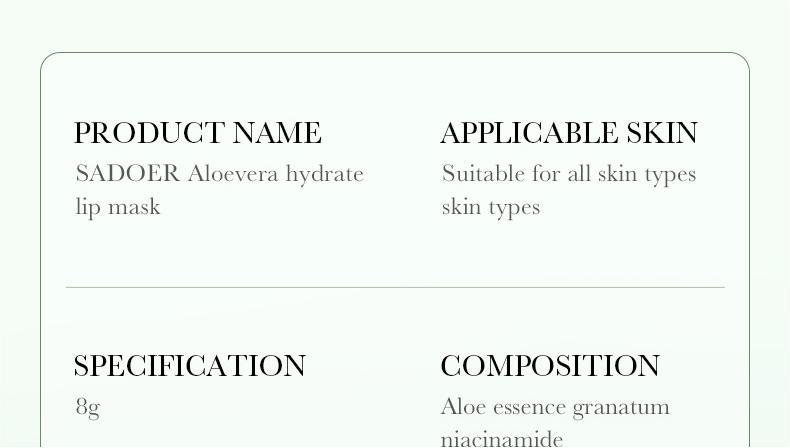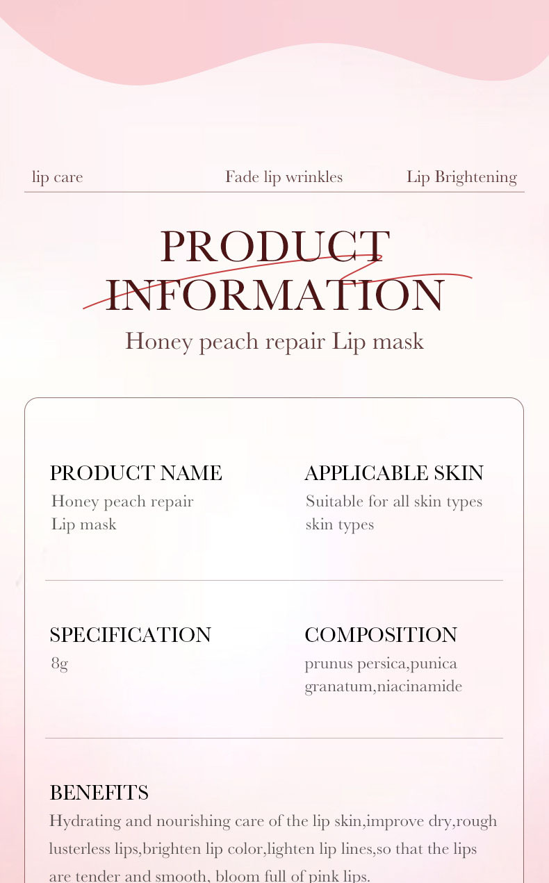 Апельсин 8 г (только для продажи на внешнем рынке); Клубника 8г (только для продажи на внешнем рынке); Авокадо 8 г (только для продажи на внешнем рынке); Черника 8г (только для продажи на внешнем рынке); Кокос 8г (только для продажи на внешнем рынке); Вишня 8г (только для продажи на внешнем рынке); Мед 8г (только для продажи на внешнем рынке); Алоэ вера 8г (только для продажи на внешнем рынке); Персиковая маска для губ 8г (только для продажи на внешнем рынке)