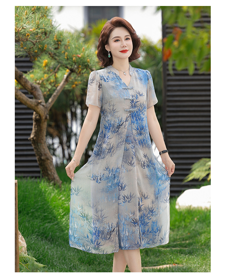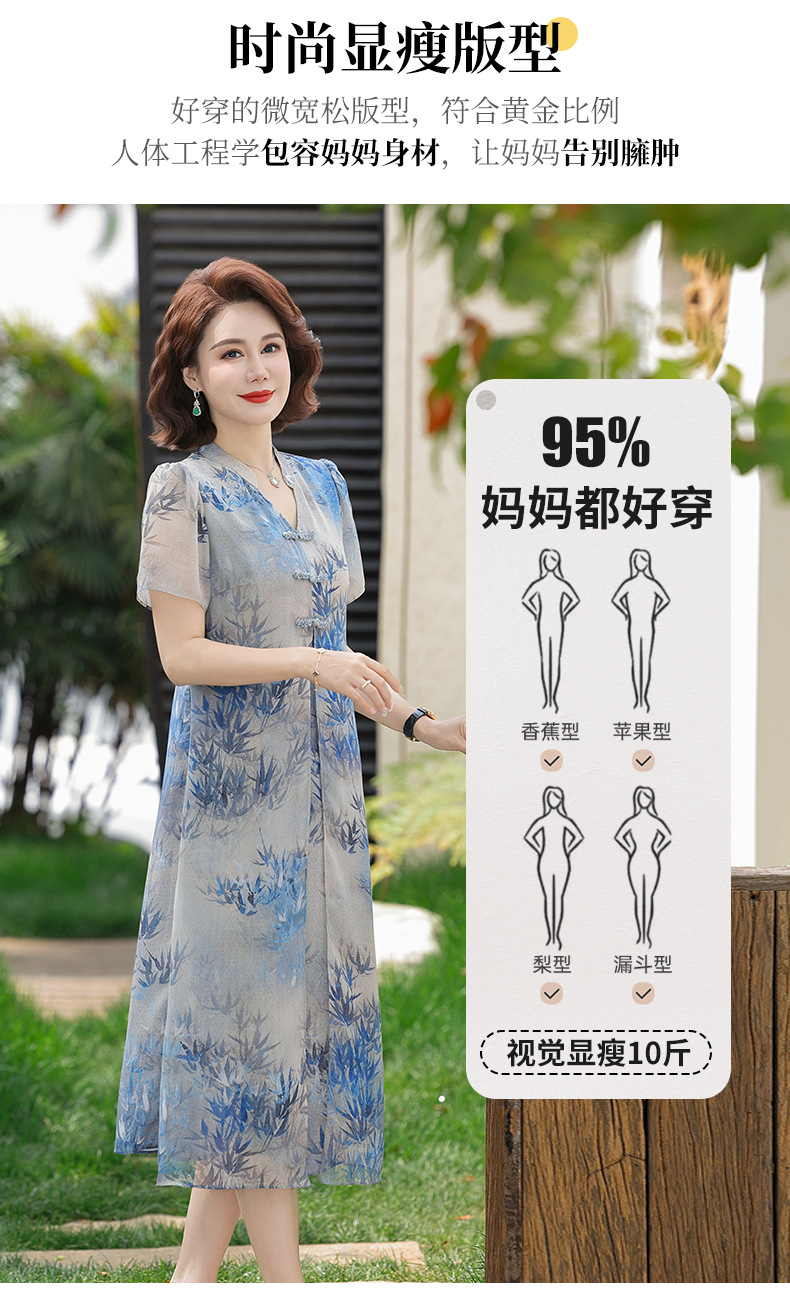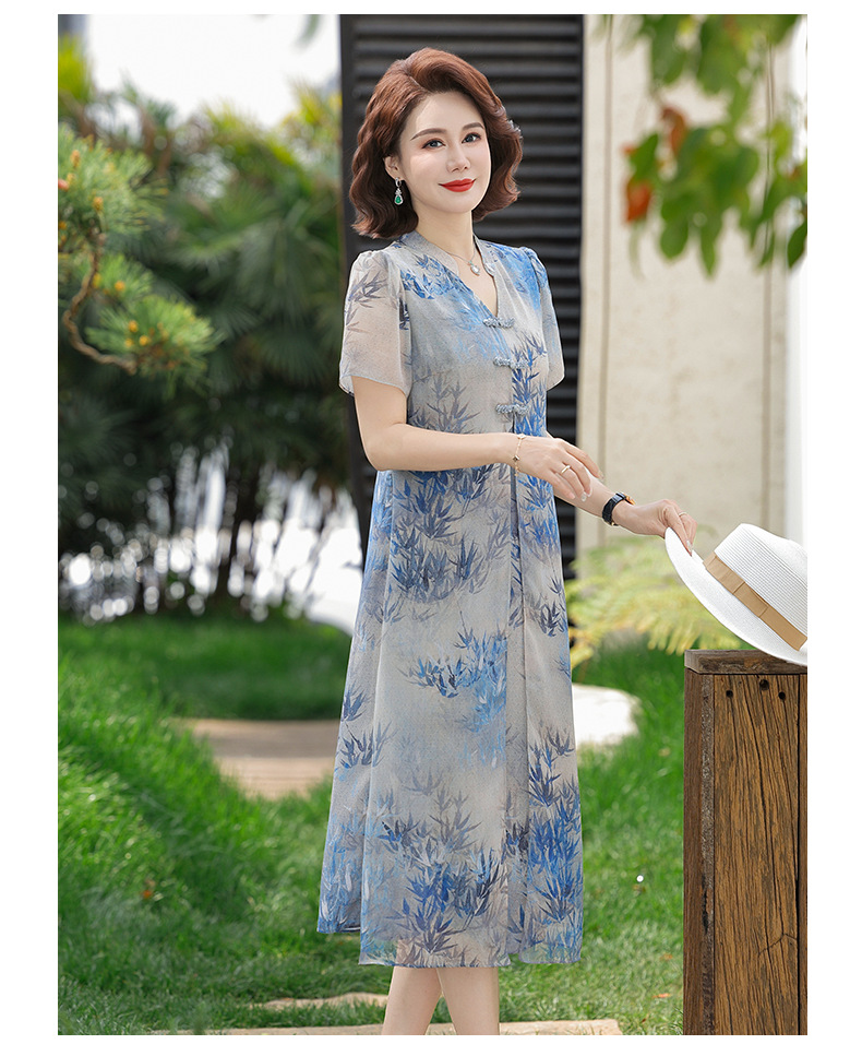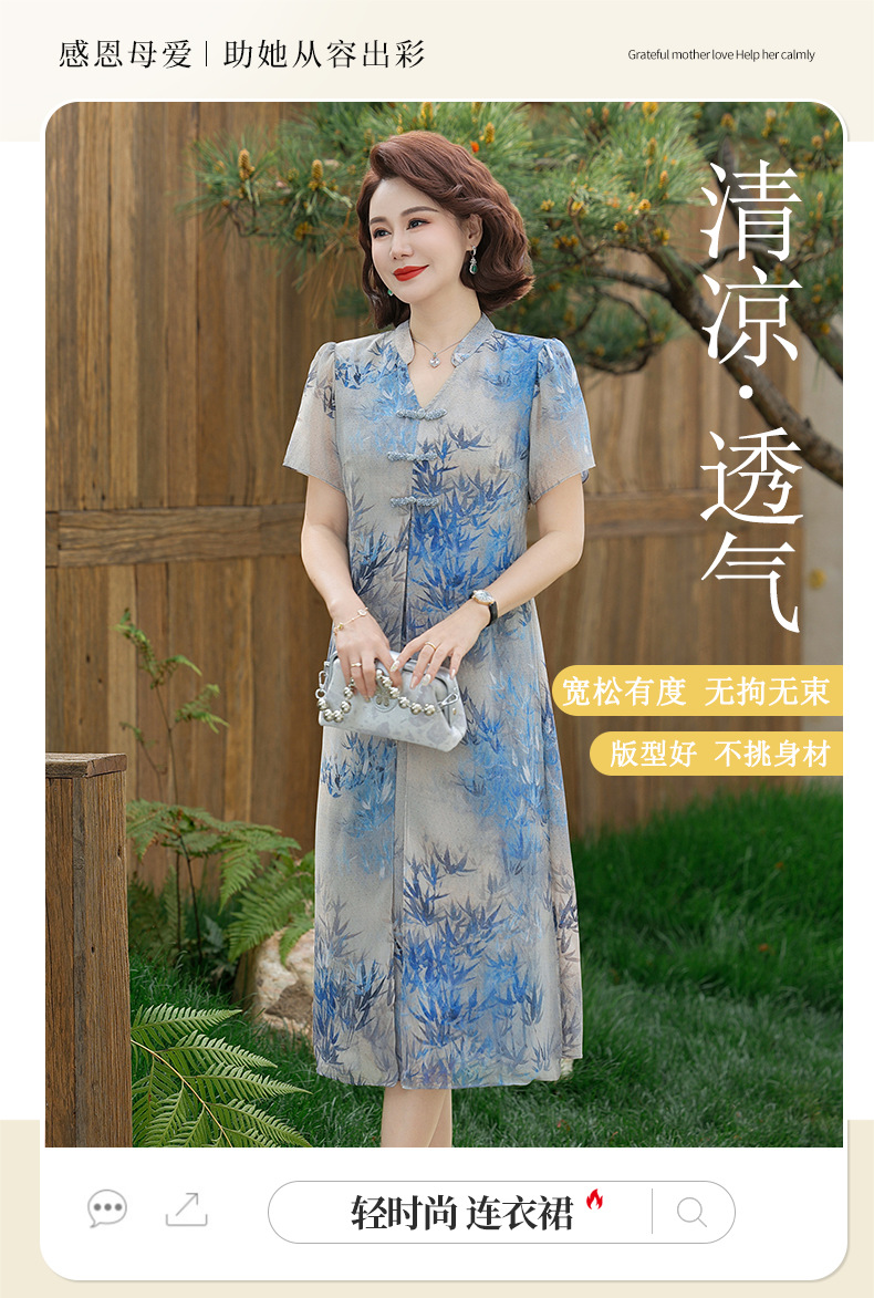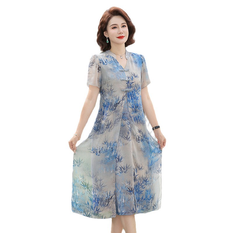 Новое стильное летнее шифоновое платье с короткими рукавами для мам, женская юбка средней длины с принтом в китайском стиле для женщин среднего и пожилого возраста.