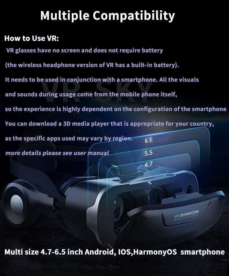 VR魔镜本身没有屏幕也无需用电池,必须配合手机一起使用;使用中所有的画面和声音来自于手机本身。因此体验效果跟手机本身的配置有非常重要的关系! The VR Magic Mirror itself does not have a screen and does not require a battery. It needs to be used in conjunction with a mobile phone. All the visuals and sounds during usage come from the mobile phone itself, so the experience is highly dependent on the configuration of the mobile phone.