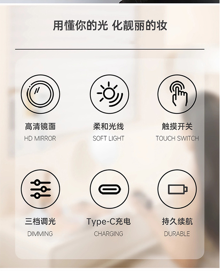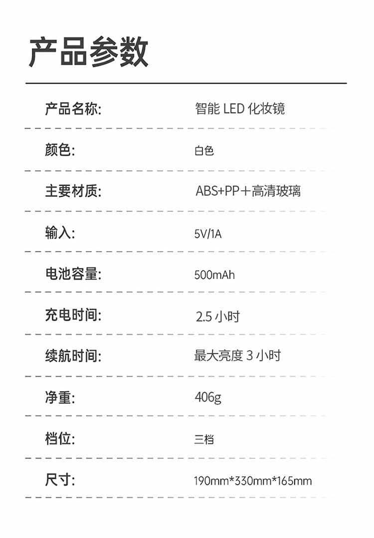 工作模式:触摸开关,单击切换色温,充电时亮红灯,充满亮绿灯功率:5W