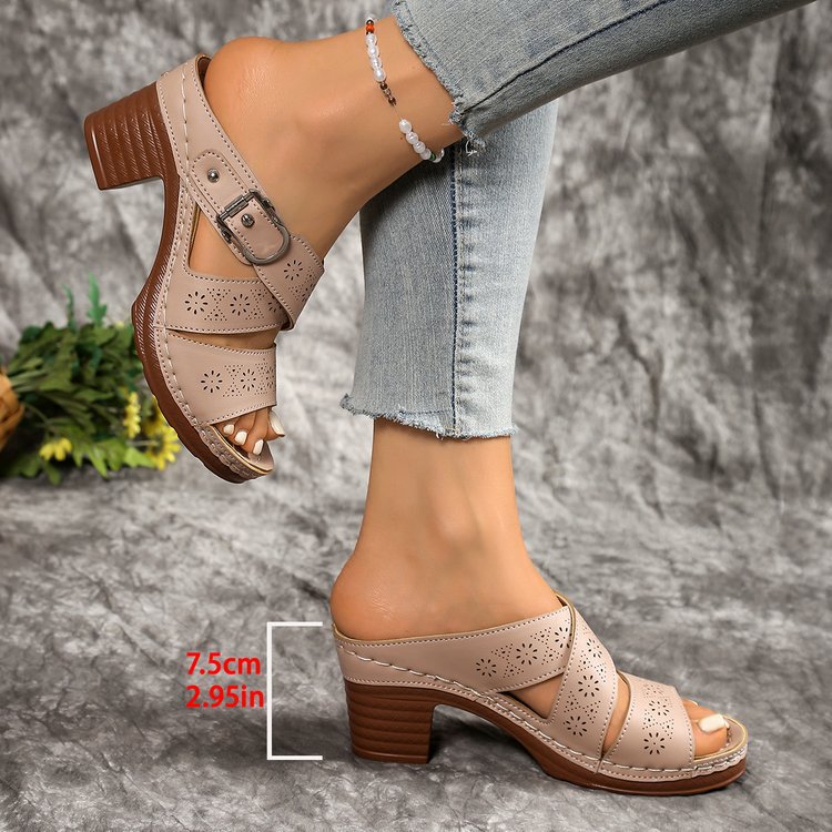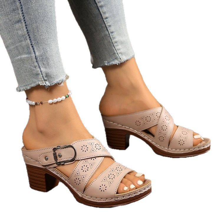Европейские и американские сандалии на толстом каблуке с вырезом, римские сандалии, летний новый стиль 2025, однорядные, для трансграничной экспорта, большие размеры, женские туфли на высоком каблуке.