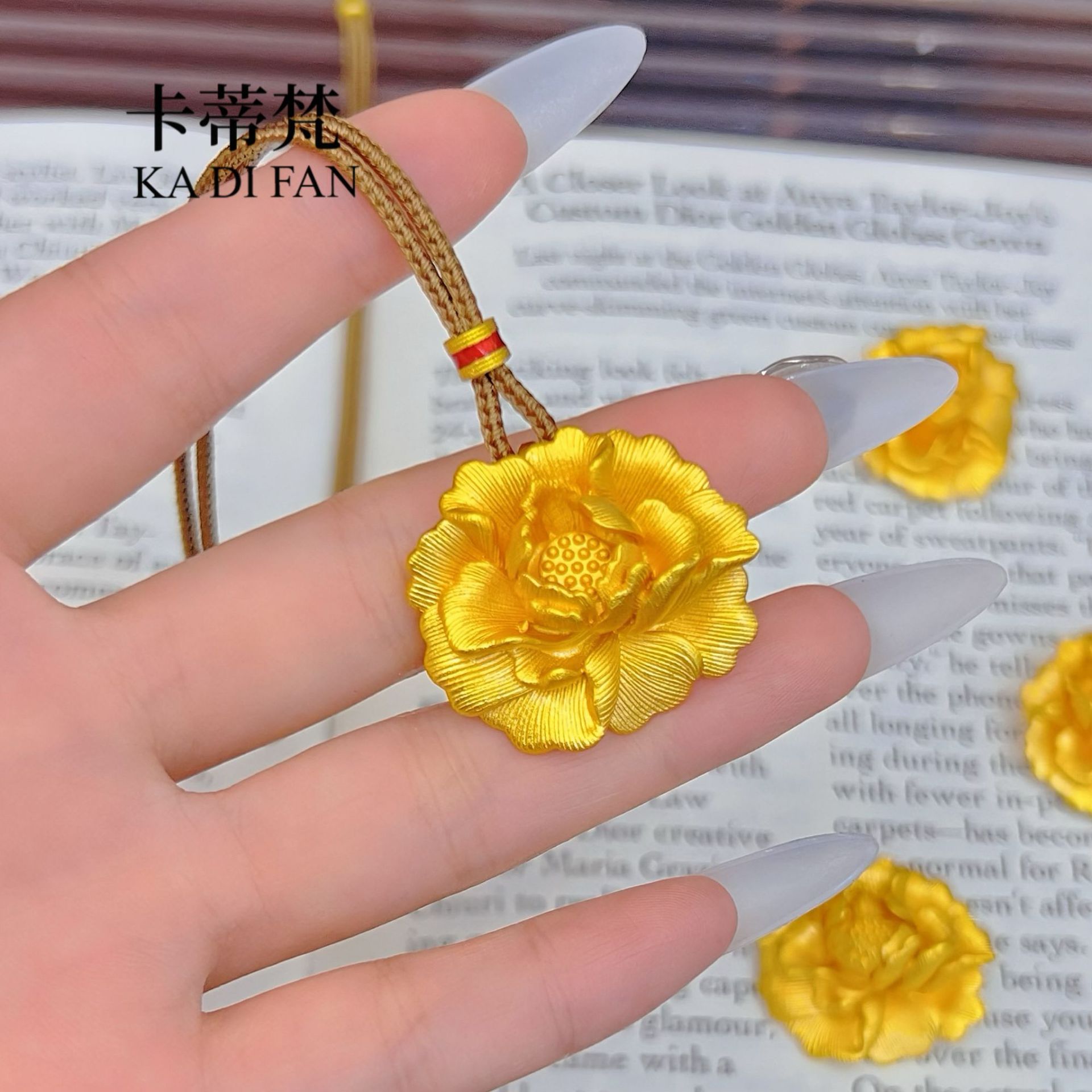 Позолоченный трехмерный резной кулон с цветком пиона, сохраняющий цвет песка, цветущее процветание, ожерелье из плетеной веревки, новый национальный тренд в китайском стиле.
