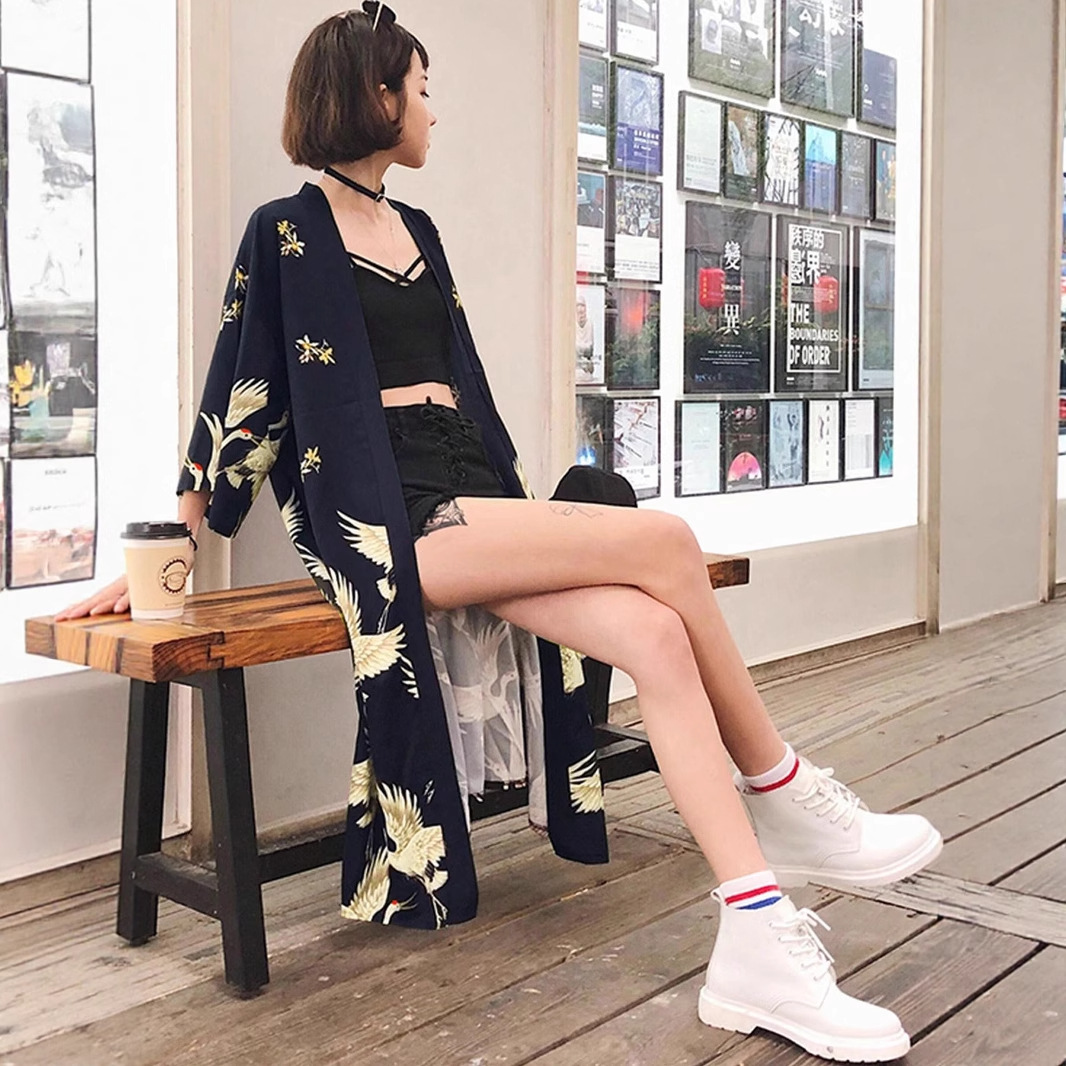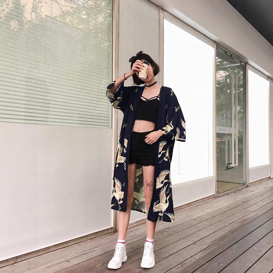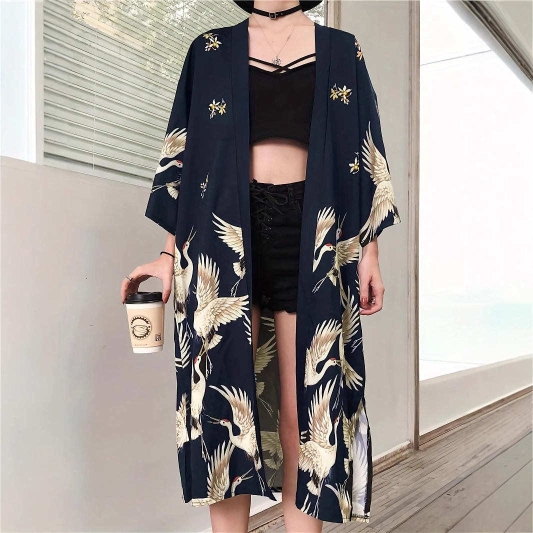 Европейская и американская модная тонкая накидка на весну и лето с принтом журавлей, тонкое пальто-накидка средней длины в стиле кимоно с перьями.