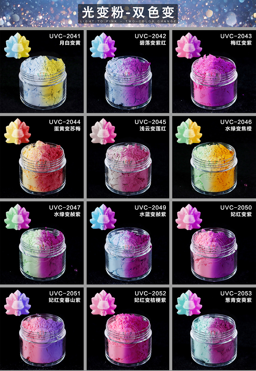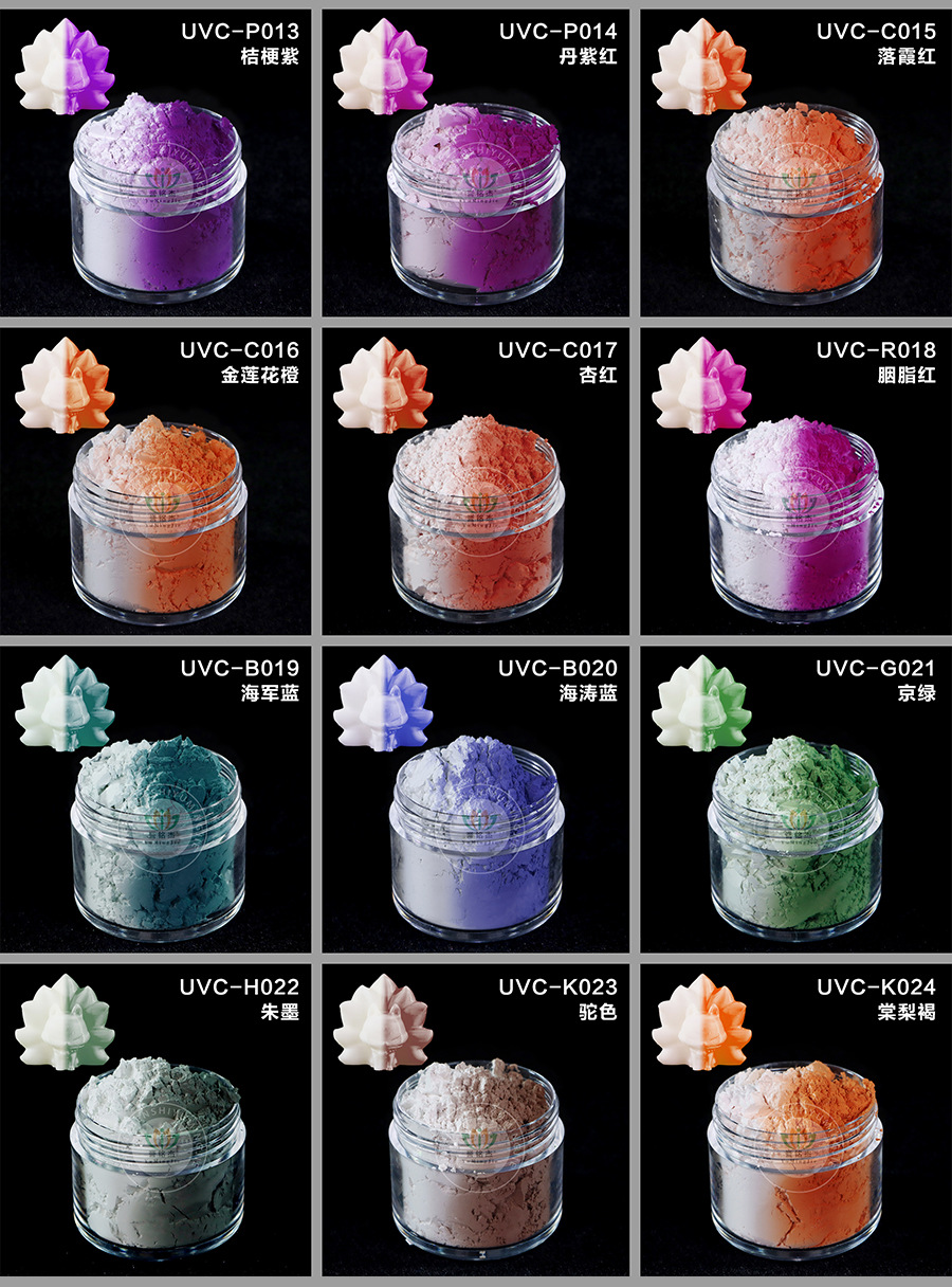 UVC-R001 дата красная; UVC-R002 вишнево-красный; UVC-R003 Фиолетовый; UVC-R004 двойной красный; UVC-R005 цвет личи; UVC-Y006 ярко-желтый; UVC-Y007 Сгоревший оранжевый; UVC-B008 ультрамариновый синий; UVC-B009 Лазурный; UVC-G010 пшенично-зеленый; UVC-P011 Ци Цзы; UVC-P012 горный стебель фиолетовый; UVC-P013 Платикодон Фиолетовый; UVC-P014 Дэн Фиолетовый Красный; UVC-C015 Луокся Красный; UVC-C016 Золотой лотос оранжевый; UVC-C017 абрикосово-красный; UVC-R018 Карминово-красный; UVC-B019 темно-синий; UVC-B020 Хайтао Синий; UVC-G021 Цзинлу; UVC-H022 Жумо; UVC-K023 верблюжий; UVC-K024 Танли Браун; UVC-2041 лунный белый становится желтым; UVC-2042 синий становится фиолетовым; UVC-2043 сливово-красный становится фиолетовым; Яичный желток UVC-2044 превращается в сливу; Световые облака UVC-2045 становятся красными, как лотос; UVC-2046 Aqua Green Zoom Оранжевый; UVC-2047 водно-зеленый становится красновато-фиолетовым; UVC-2049 водный синий становится красновато-фиолетовым; UVC-2050 Fei красный становится фиолетовым; UVC-2051 Фейхун становится фиолетовым Мушаном; UVC-2052 Feihong меняет цвет платикодона на фиолетовый; Зеленый лук UVC-2053 становится фиолетовым; UVC-2054 крадет синий цвет и превращается в сливово-красный; UVC-2055 красный лотос становится сливово-красным; UVC-2056 абрикосовый желтый становится прозрачным горным синим; UVC-2057 красный лотос становится малиново-красным; UVC-2058 Таояо становится мягким синим; UVC-2059 Зеленое яблоко превратилось в перегородчатое золото
