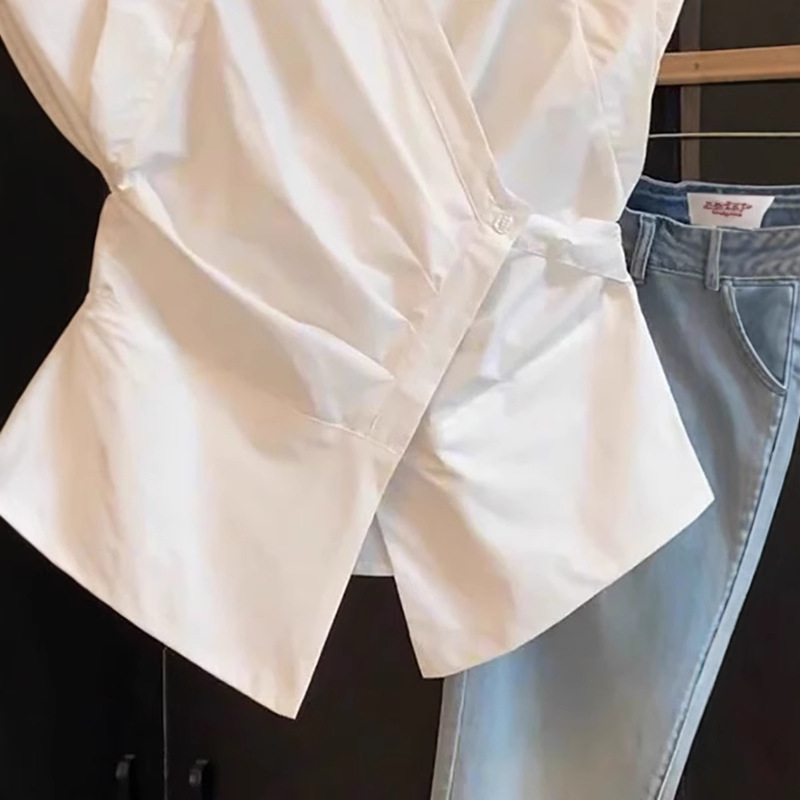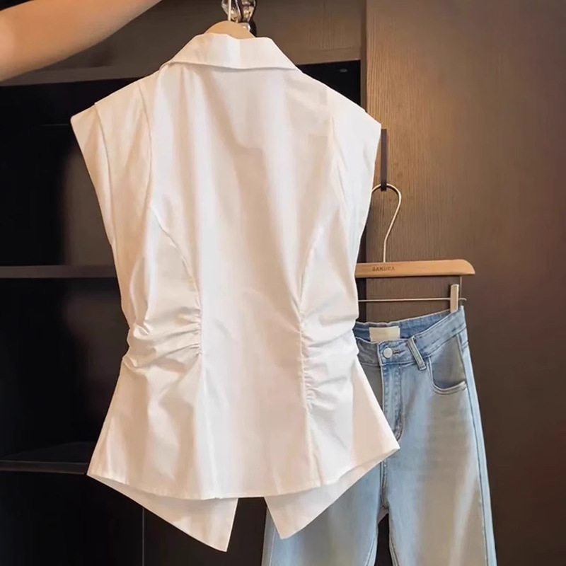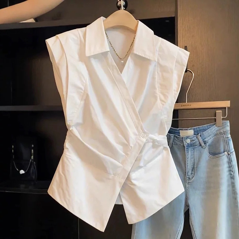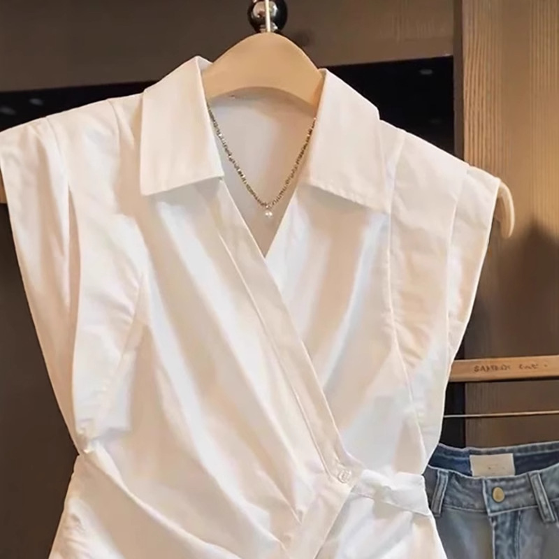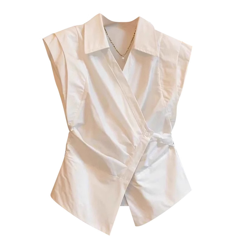 Рекомендуется для самостоятельного ношения ~ женская рубашка без рукавов с французским воротником-поло, летний дизайн, талия на бретельках, небольшой топ с развевающимися рукавами.