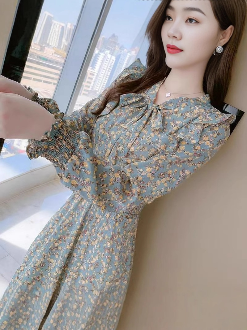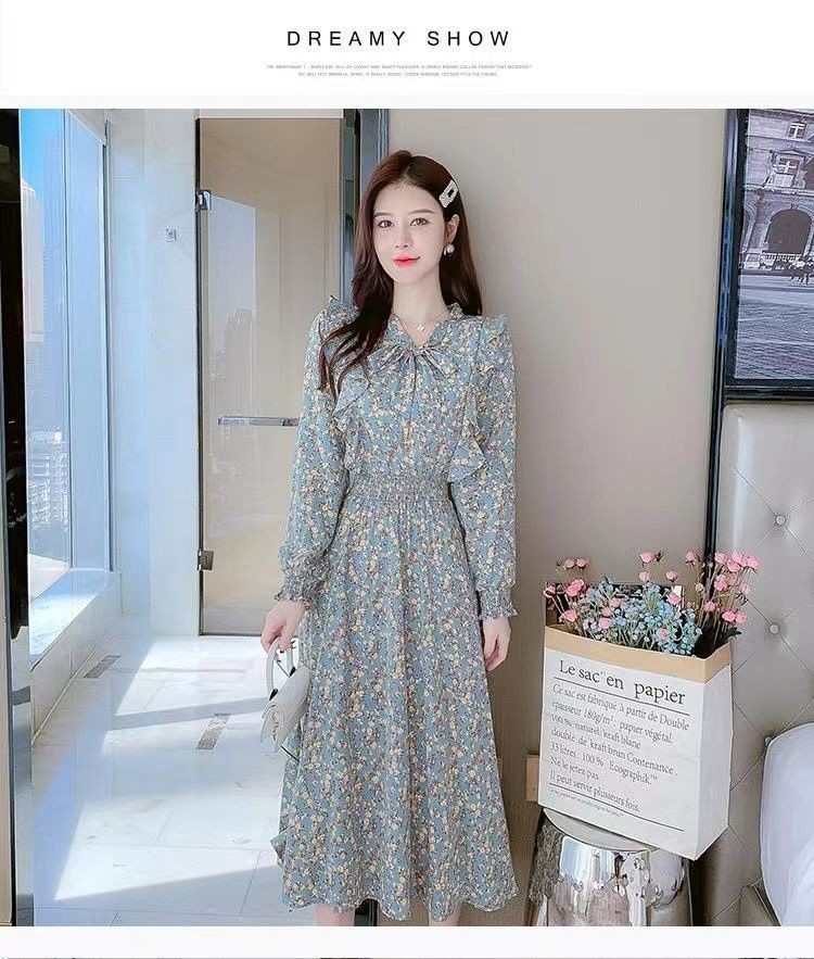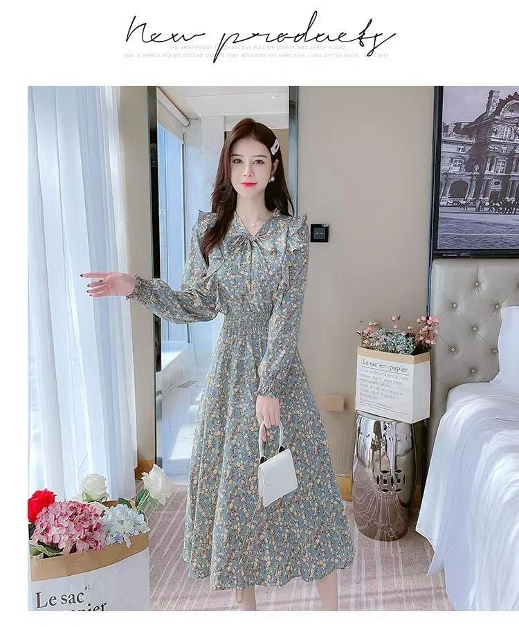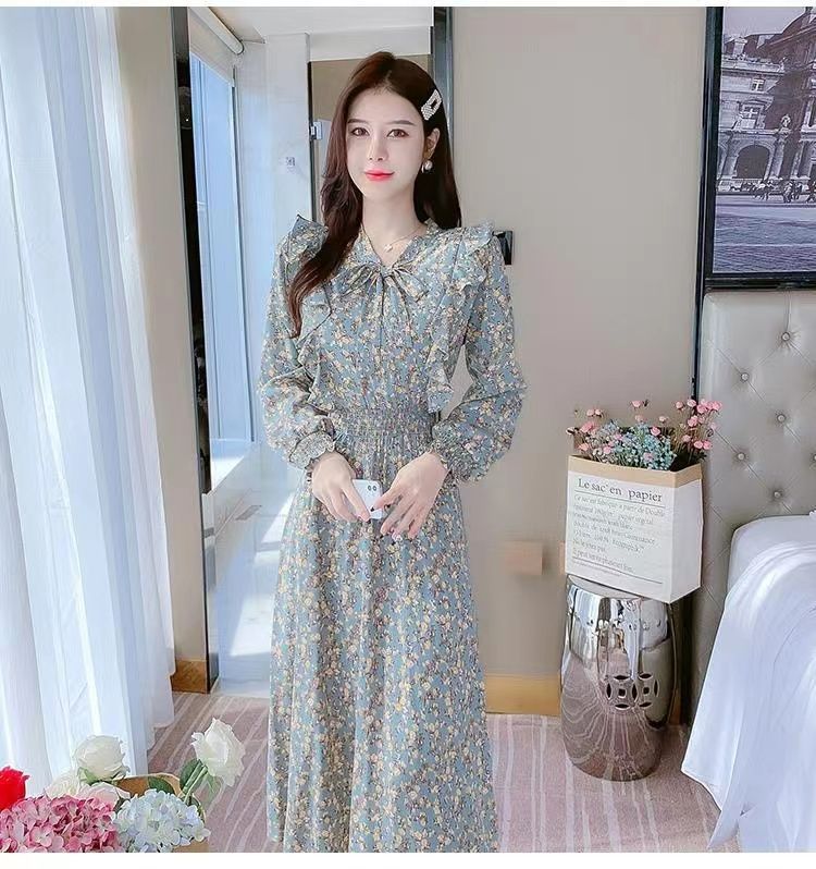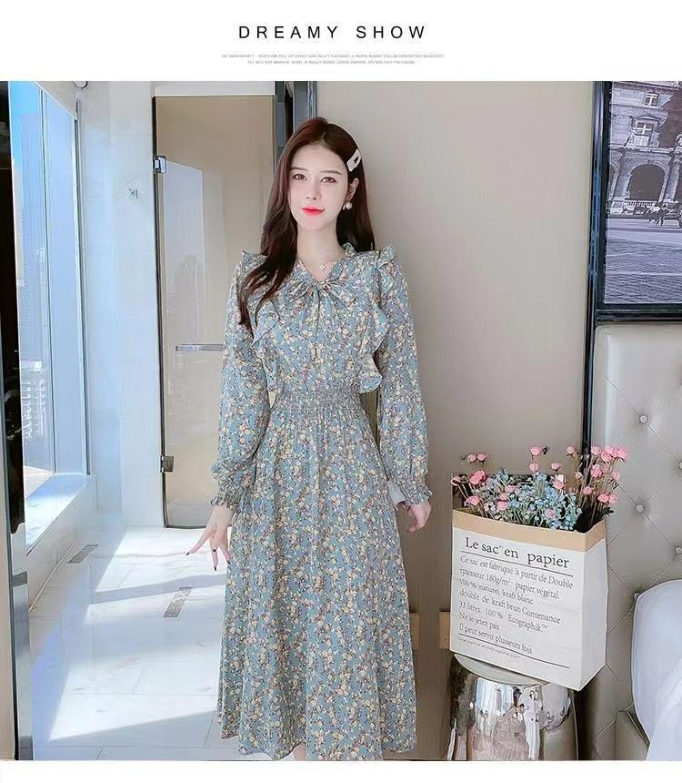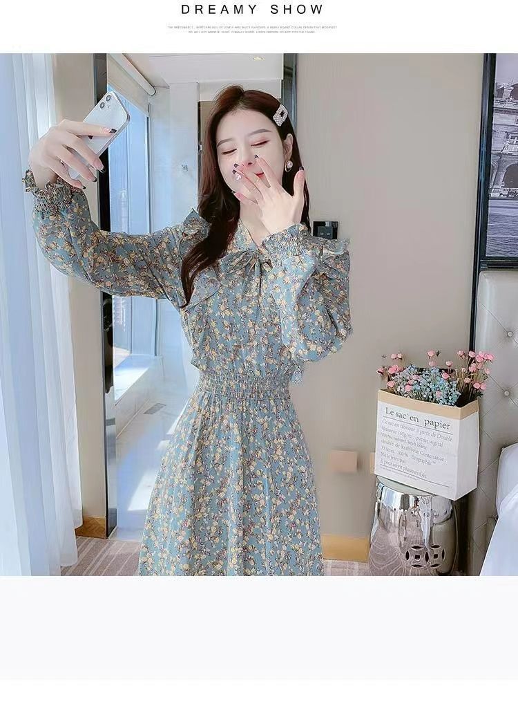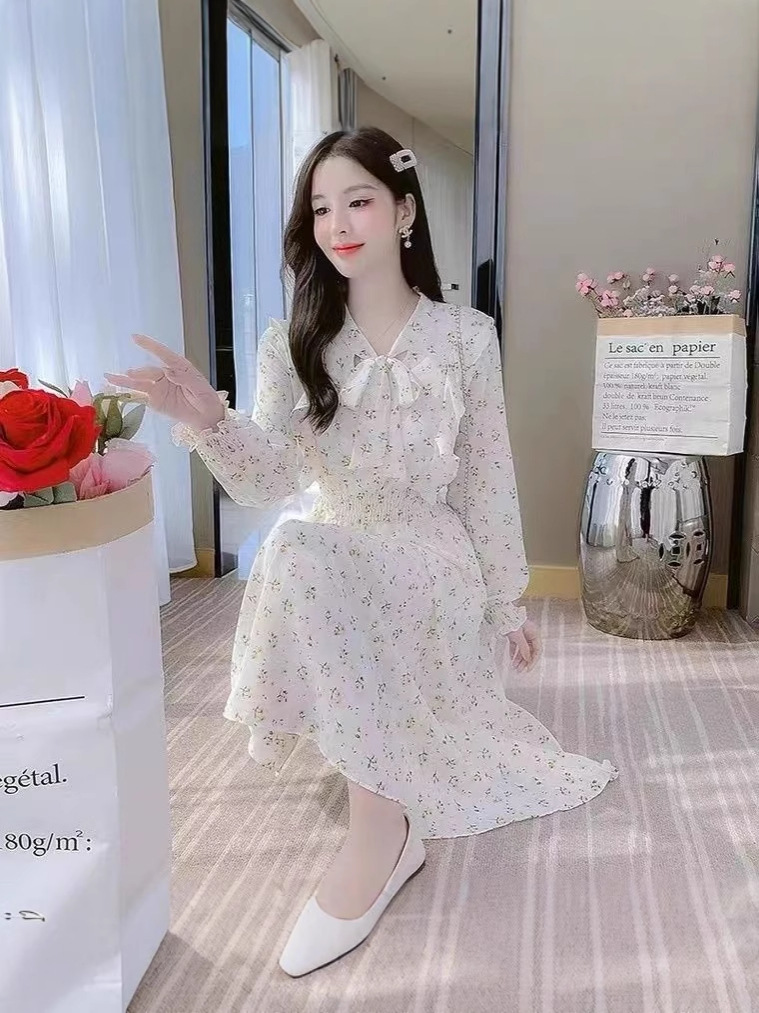 Французское платье с рюшами и цветочным принтом для женщин 2025, новый осенний стиль, с завышенной талией, элегантное с бантом, длинная юбка