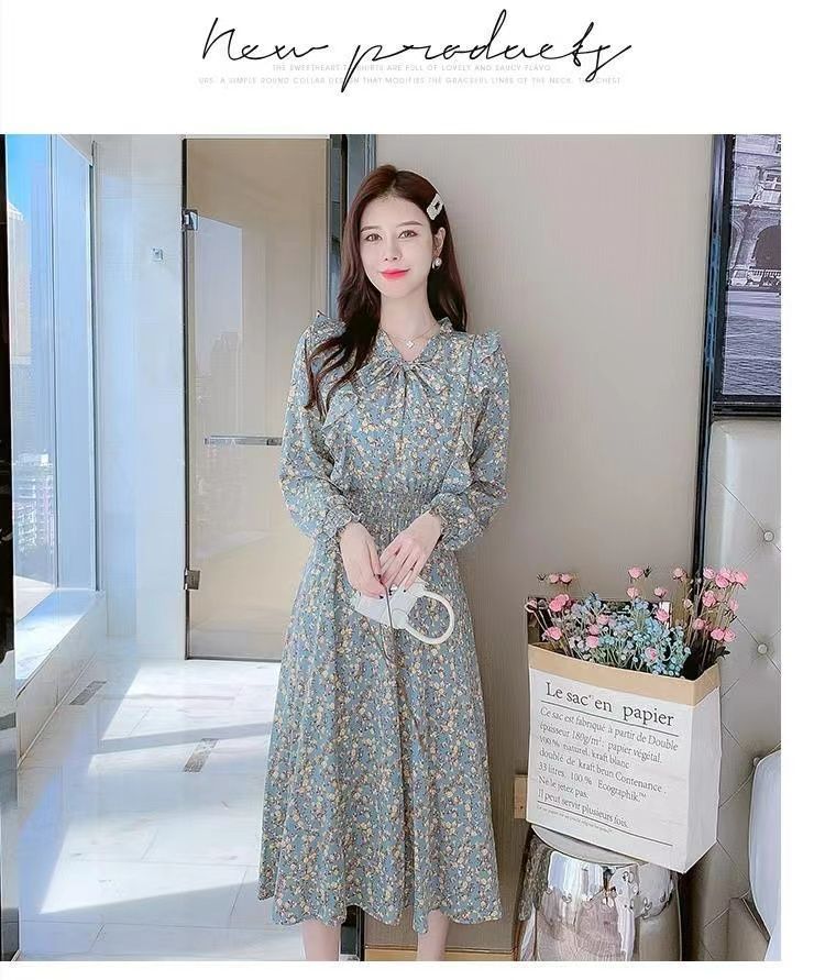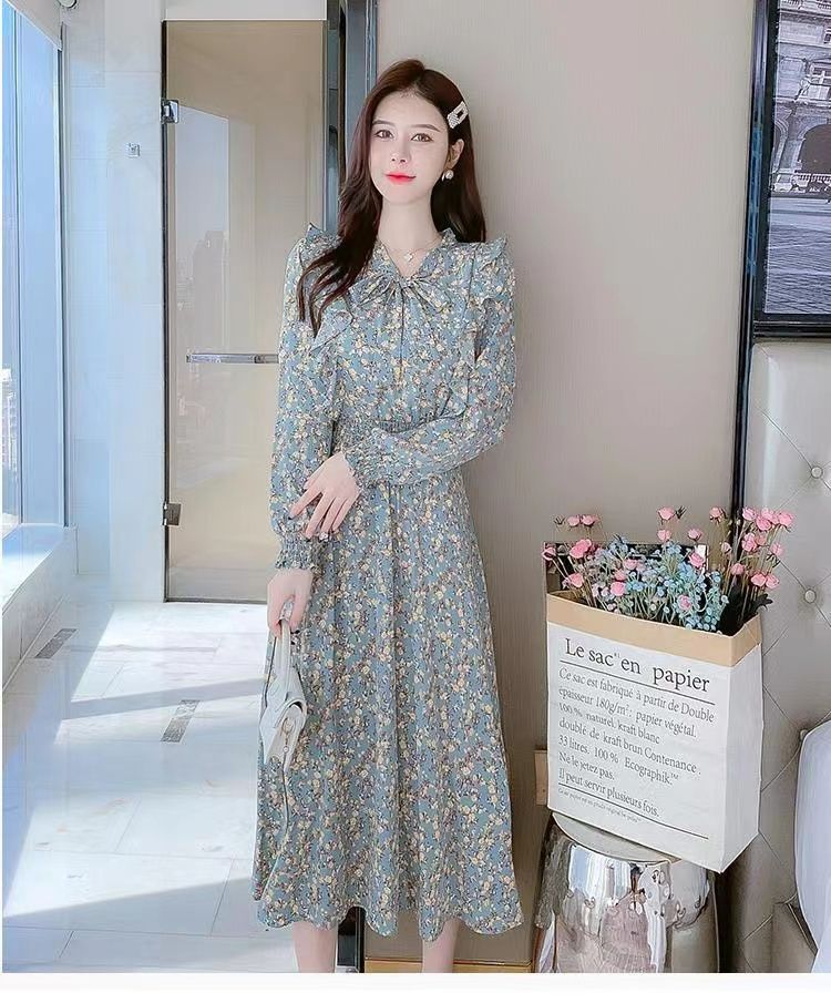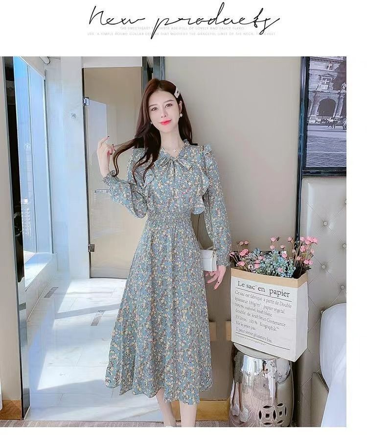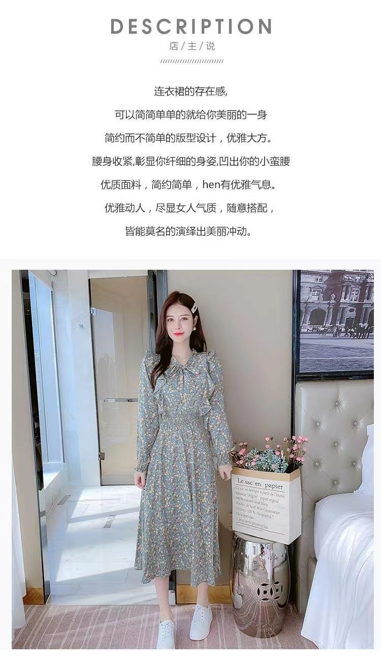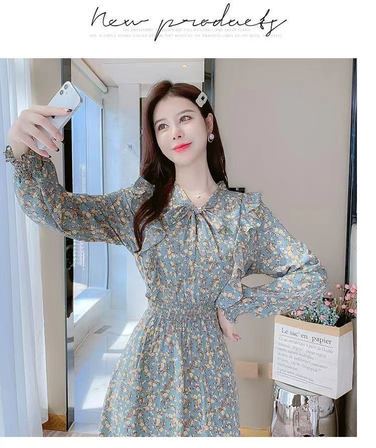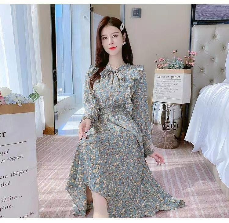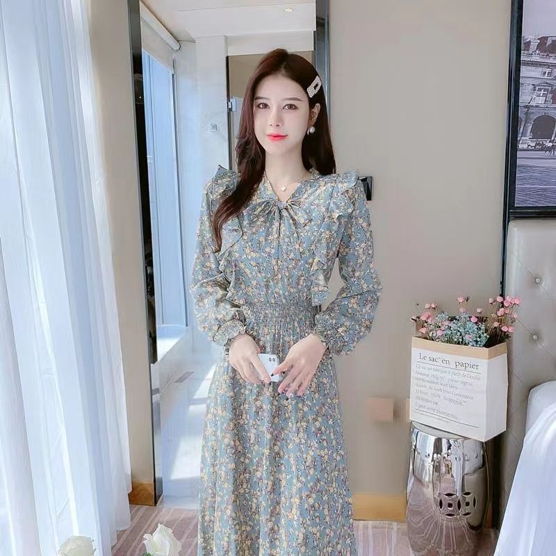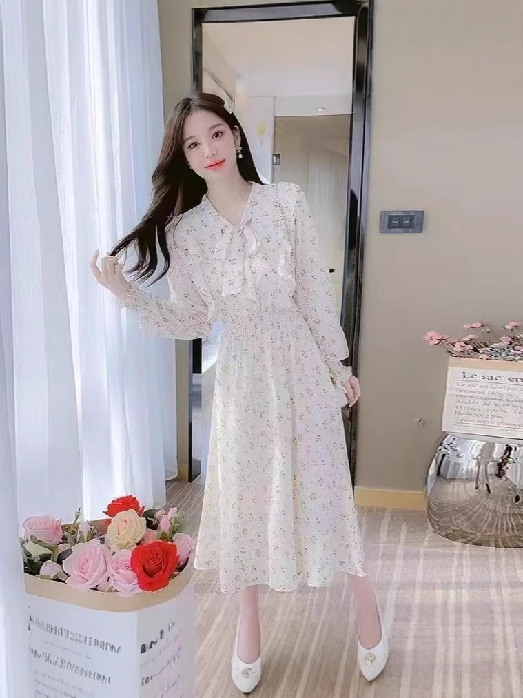 Французское платье с рюшами и цветочным принтом для женщин 2025, новый осенний стиль, с завышенной талией, элегантное с бантом, длинная юбка
