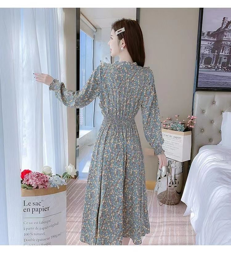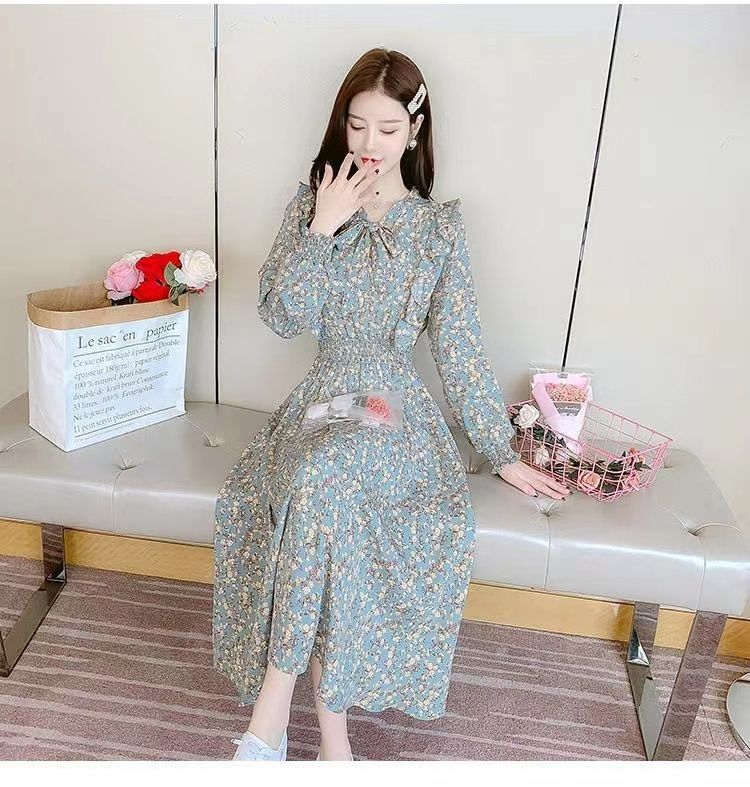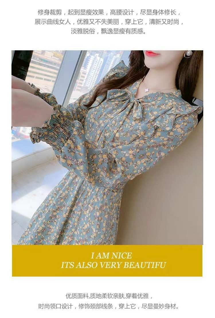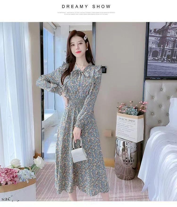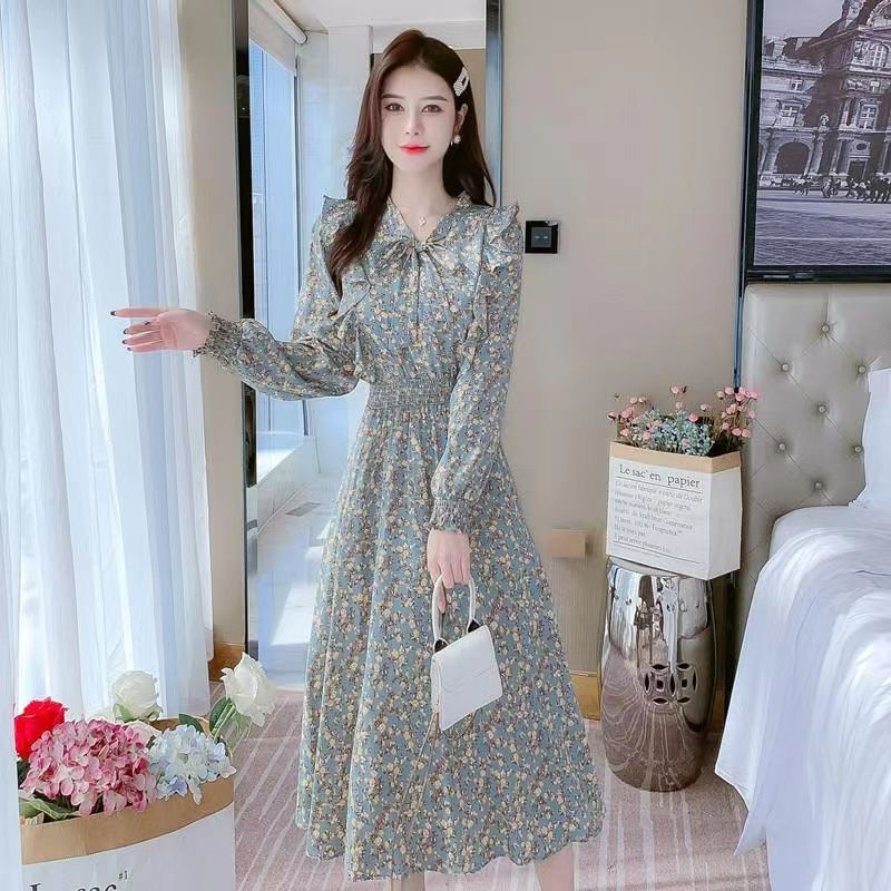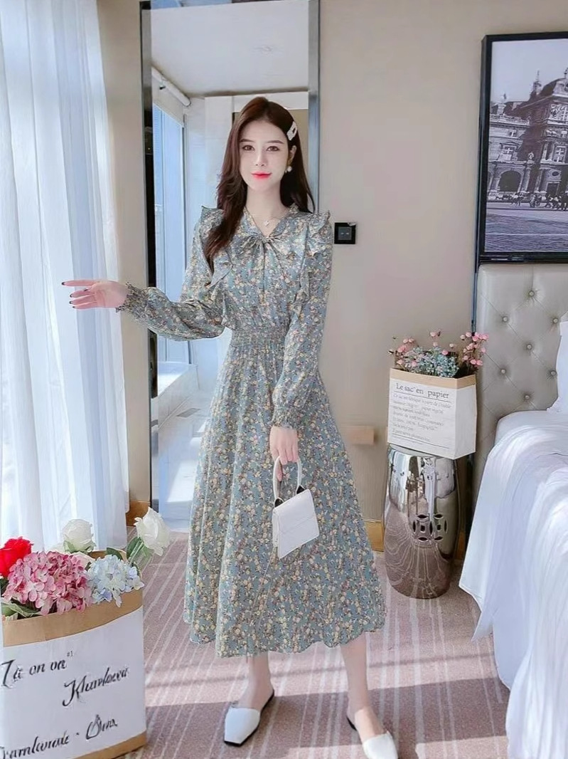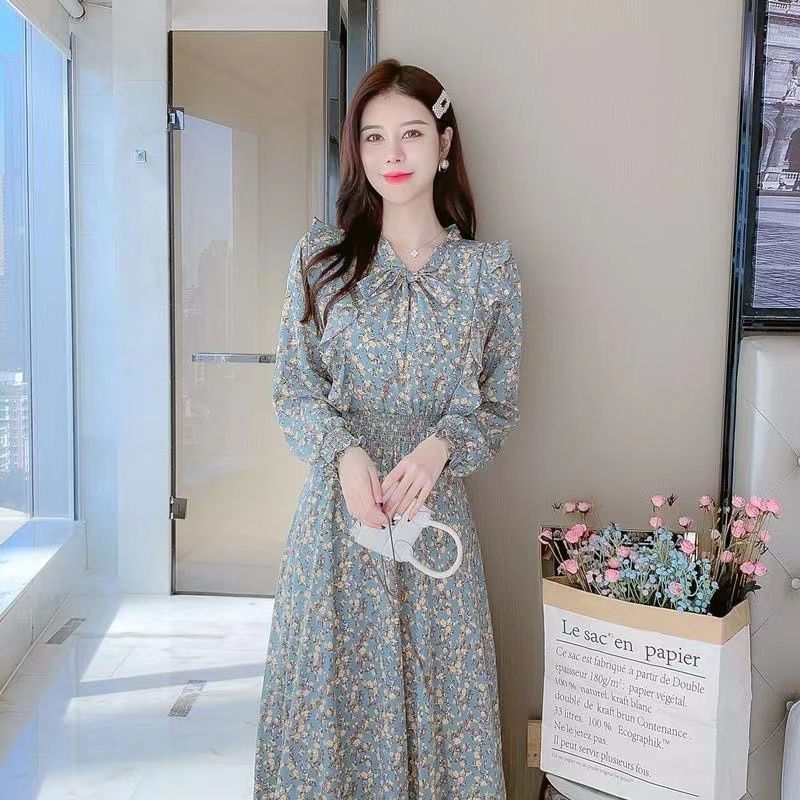 Французское платье с рюшами и цветочным принтом для женщин 2025, новый осенний стиль, с завышенной талией, элегантное с бантом, длинная юбка