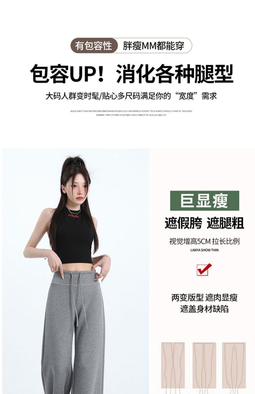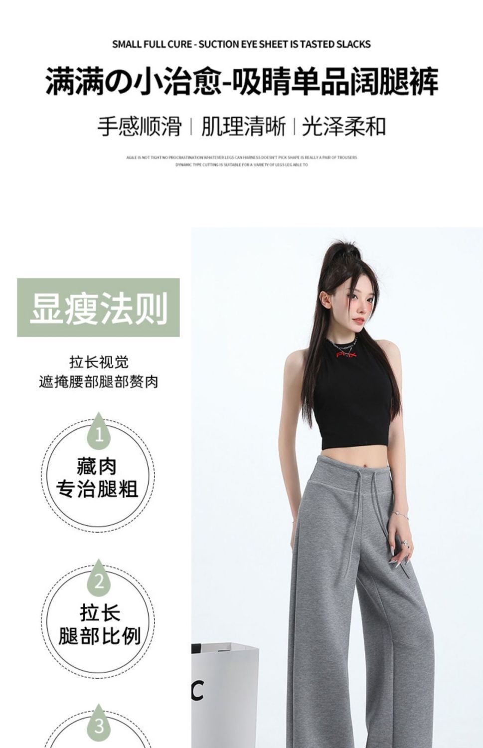Черные висячие брюки [обычный стиль]; Светло-серые подвесные брюки [обычный стиль]; Темно-серые подвесные брюки [обычный стиль]; Черные висячие брюки [расширенный стиль]; Светло-серые подвесные брюки [увеличенная длина]; Темно-серые драпированные брюки [расширенный стиль]