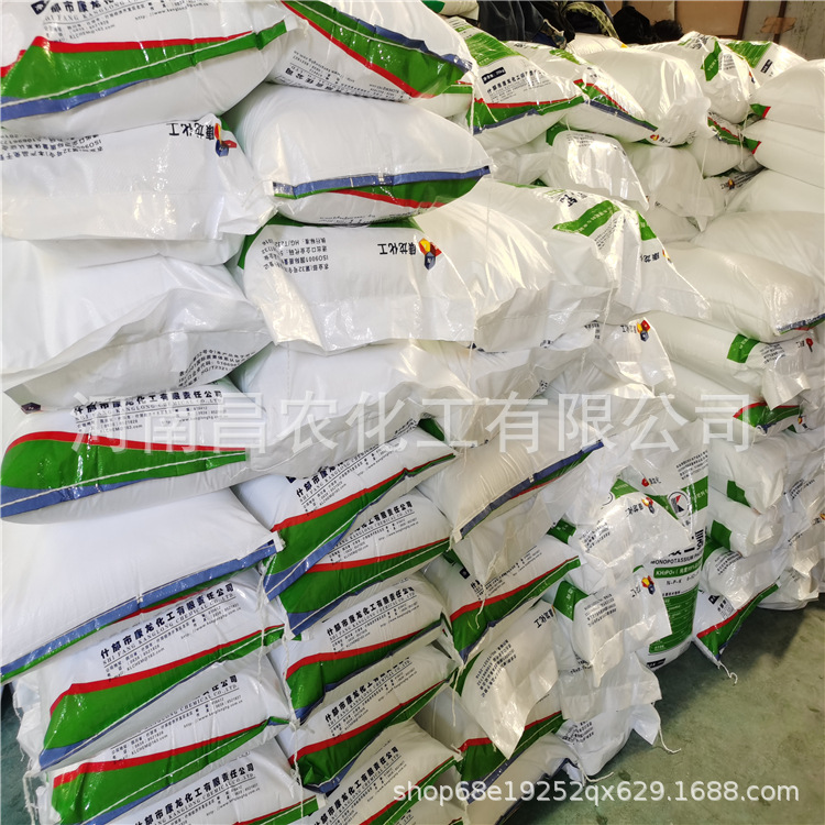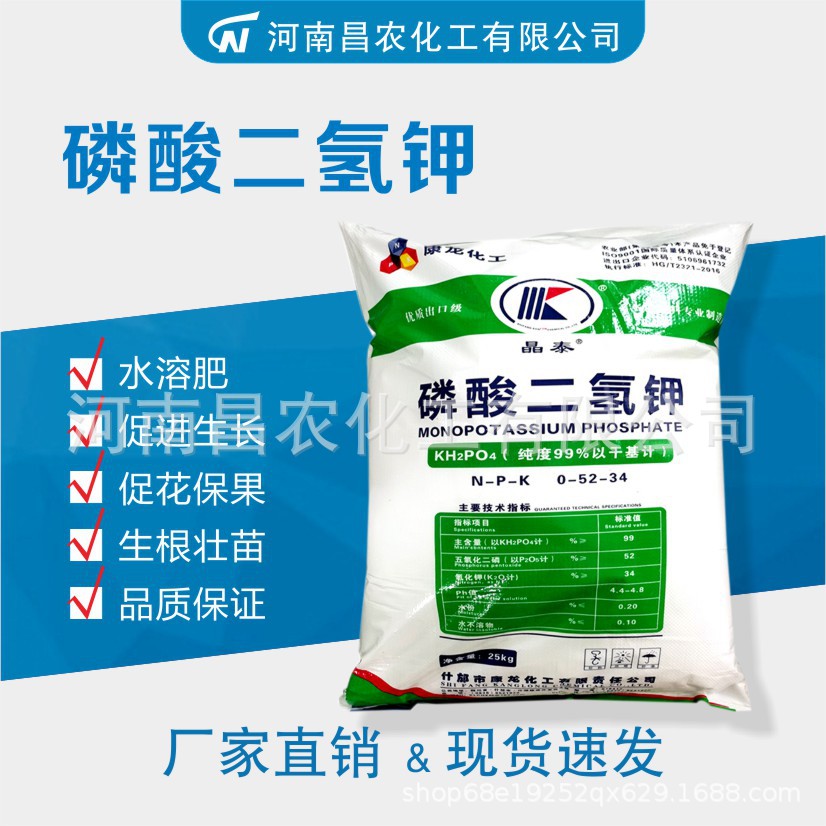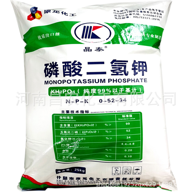 农业上用作高效磷钾复合肥;磷酸二氢钾产品广泛适用于各类型经济作物、粮食、瓜果、蔬菜等几乎全部类型的作物,各省均由当地的农科院所、土肥站等专家机构针对磷酸二氢钾适用于各类典型作物进行了很多的相关应用实验,通过各地对各类型作物的实际施用效果证明磷酸二氢钾具有显著增产增收、改量优化品质、抗倒伏、抗病虫害、防治早衰等许多优良作用,并且具有克服作物生长后期根系老化吸收能力下降而导致的营养不足的作用。磷酸二氢钾属新型高浓度磷钾二元素复合肥料,其中含五氧化二磷52%左右,含氧化二钾34%左右。烤烟需磷、钾量大,特别是需钾量大。磷酸二氢钾是用于烤烟的一种较为理想的新型肥料。为了探索磷酸二氢钾在烤烟上的使用价值和施用方法,以提高烟叶品质。磷酸二氢钾用在棉花上能够控制棉花徒长,增加植株花苞数量。磷酸二氢钾广泛运用于滴管喷灌系统中。