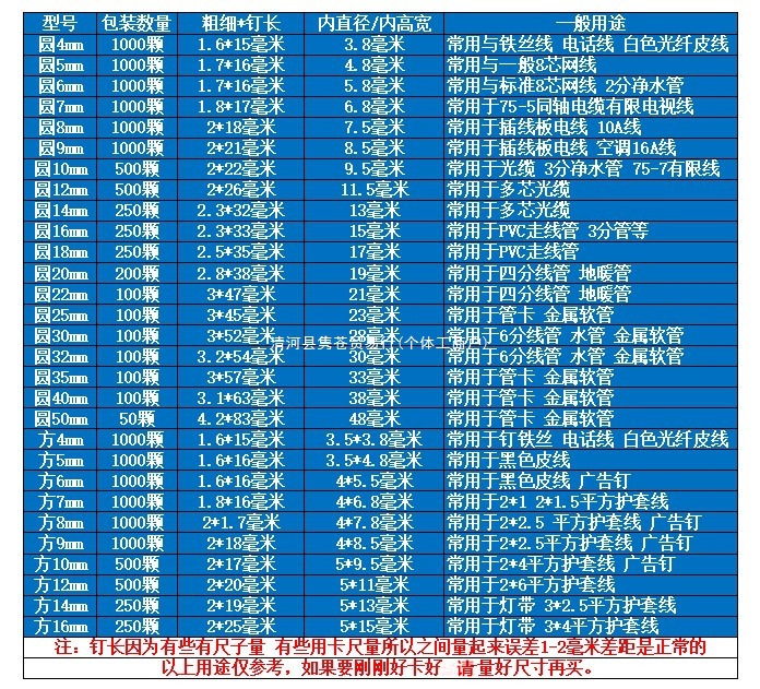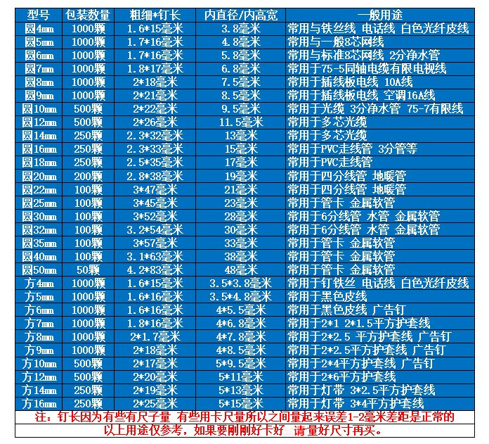 5 типов линейных карт, 50 штук в каждом, экономичны для домашнего использования.; Линейная карта круглая 5 мм/1000 шт., подходит для обычного 8-жильного сетевого кабеля.; Линейная карта круглая 6 мм/1000 шт., подходит для 8-жильного сетевого кабеля маршрутизатора; Карточка черной линии, круглая, 6 мм/1000 шт., подходит для 8-жильного компьютерного сетевого кабеля; Линейная карта круглая 7 мм/1000 шт., подходит для ограниченного телевизионного коаксиального кабеля 75-5; Линейная карта круглая, 8 мм/1000 шт., подходит для кабелей с подключаемой платой; Линейная карта круглая 9 мм/1000 штук, подходит для линии кондиционирования 16 А.; Линейная карта круглая 10 мм/500 штук в упаковке, подходит для оптического кабеля 12-24 жилы.; Линейная карта круглая 12 мм/500 шт., подходит для оптического кабеля с 62-72 жилами.; Линейная карта круглая, 14 мм/250 штук, подходит для оптического кабеля с 74-84 жилами.; Карточка проволочная квадратная 5 мм/1000 шт., подходит для черной железной проволоки, кожаной проволоки; Линейная карта квадратная 6 мм/1000 штук, подходит для плоской проволоки 2*1 квадратная.; Линейная карта квадратная 7 мм/1000 штук, подходит для проволоки в оболочке 1,5 квадрата.; Линейная карта квадратная 8 мм/1000 штук, подходит для проволоки с оболочкой площадью 4 квадратных метра.; Линейная карта квадратная 9 мм/1000 штук плоская проволока с оболочкой 2*2,5 национального стандарта; Линейная карта квадратная 10 мм/500 штук для плоской проволоки карты; Линейная карта квадратная 12 мм/500 штук плоская проволока 2*6² в оболочке; Карточная линия квадратная 14 мм/250 штук, подходит для плоских световых полосок для карточек.; Карточная линия квадратная 16 мм/250 штук, подходит для плоских световых полос карты; Хомут для труб круглый 16 мм/250 шт., подходит для труб ПВХ16.; Хомут для труб круглый, 18 мм, 250 шт., подходит для труб ПВХ16 национального стандарта.; Хомут для труб круглый 20 мм/200 шт., подходит для 4-точечных труб горячей воды.; Хомут для труб круглый 22 мм/100 шт., подходит для 4-точечной трубы PVR; Хомут для труб круглый 25 мм/100 штук, подходит для труб ПВХ25; Хомут для труб круглый 30мм/100 шт. двойные гвозди; Хомут для труб круглый 32мм/100 шт. двойной гвоздь 1inch труб; Хомут круглый 40мм/100шт двойные гвозди; Хомут для труб круглый 50мм/50шт двойные гвозди; Линейная карта круглая 4 мм/1000 шт., подходит для телефонных линий, белая кожаная проволока; Линейная карта квадратная 4 мм/1000 штук, подходит для телефонных линий, белые кожаные провода