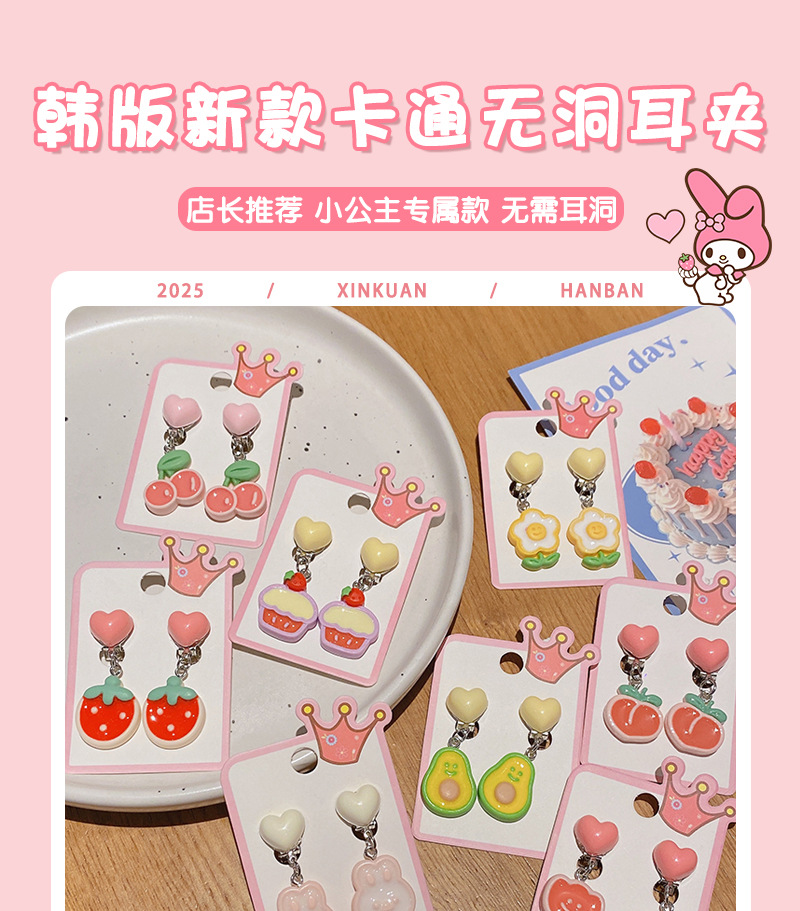 Клубничный торт-клипса для ушей; Клубничное печенье-клипсы для ушей; Зажимы для ушей в виде кролика; Персиковое печенье-зажимы для ушей; Заколки для ушей с вишневым печеньем; Зажимы для ушей с авокадо и печеньем; Зажим для ушей Smiley Tulip; Улыбающийся зажим для ушей Plumeria; Заколка для волос «Русалочьи уши» с желтым оттенком; Клипса для волос в виде рыжих русалочных ушек; Заколка для волос в виде русовласной русалки с ушками; Оранжевая заколка для волос «Русалочьи уши»; Shy Corn - Манжета на ухо; Сверкающий зажим для ушей в виде кактуса; Сверкающий зажим для ушей в форме баклажана; Сверкающий зажим для ушей в виде гриба; Сверкающий зажим для ушей в виде томатов; Закрытые глаза, зажим для облака-уха; Зажим для ушей «Радужная звезда»; Линейный зажим для ушей с цветочным узором; Яркие звезды и клипса в виде луны; Сверкающий зажим для ушей в виде короны; Сверкающий зажим для ушей в виде лебедя; Блестящие зажимы для ушей Hello Kitty; Блестящая заколка для волос с ушками собаки; Glitter My Melody — манжета на ухо; Блестящий черный зажим для ушей собаки; Блестящие серьги-клипсы Culomi; Bowtie Cady - Манжета на ухо; Зажим для ушей Cady с цветком; Черри Кэди - Манжета для уха; Заколка для ушей Flower Cady; Бегущий Кайди - Зажим для ушей; Хорошо сидящий зажим для волос в виде розовых кроличьих ушек; Заколка для волос "Синий медвежий ус"; Зажим для ушей кролика на животе; Бабочка-баранчик - манжета на ухо; Зажим для ушей медведя на животе; Зажим для ушей Wink Kuromi; Гирлянда Culomi-Ear Clip; Розовый зажим для ушей Kuromi; Заколка для волос Kuromi-Ear Clip; Кривая голова Culomi-зажим для ушей